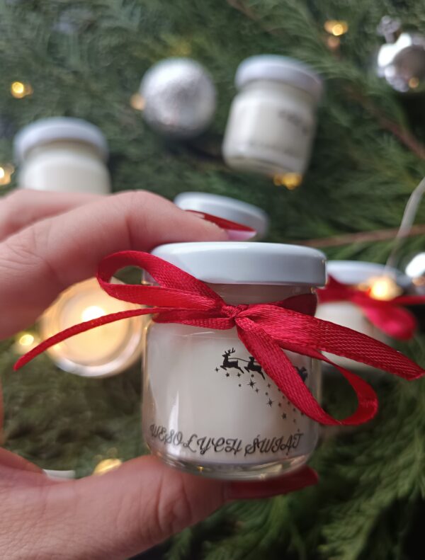 Mini Świeca w słoiczku to idealny świąteczny prezencik dla klientów i gości w okresie zbliżających się Świąt Bożego Narodzenia! Nasze słoiczki zdobią transparentne, tematyczne naklejki, które podkreślają świąteczny charakter produktu. Dodatkowo, każdy słoiczek jest starannie przewiązany wstążeczką, co sprawia, że prezentuje się wyjątkowo i elegancko.