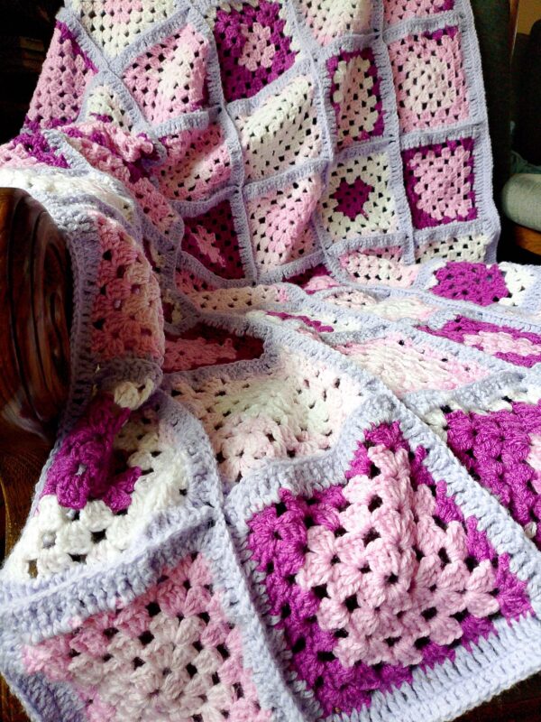 Narzuta z kwadratów w Fioletach – Wymiary 135×95 cm