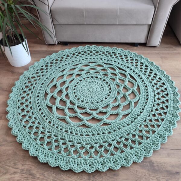 Dywan o średnicy 110 cm o nowoczesnym wzorze i wykończeniu, wykonany metodą szydełkowania z polskiego sznurka bawełnianego 5mm. Świetny do salonu, jadalni, sypialni, kuchni, czy innych pomieszczeń. Ozdobi, doda uroku, wprowadzi przytulny klimat.
