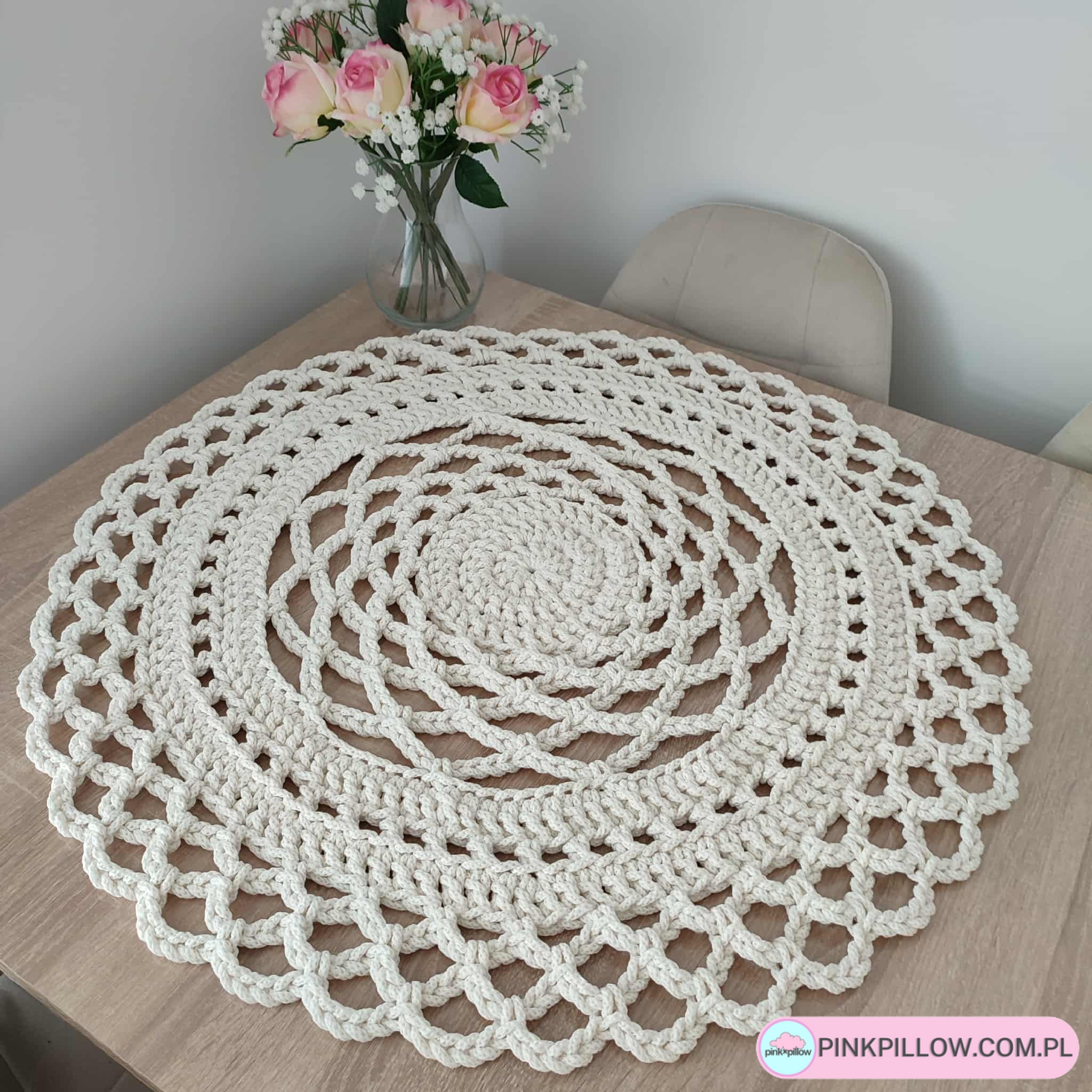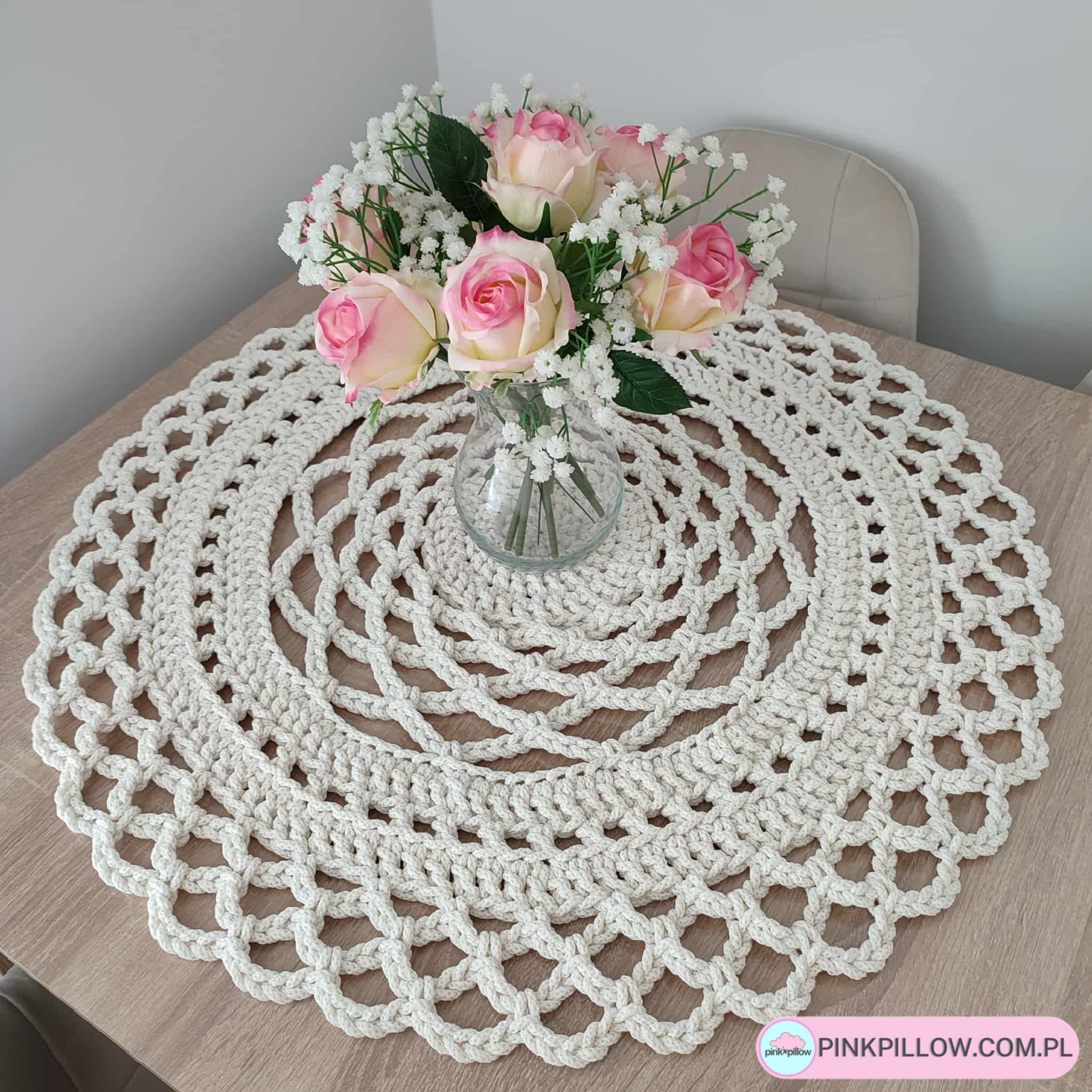Obrus na stół o średnicy 70 cm, wykonany ręcznie przy pomocy szydełka i sznurka bawełnianego 5mm wysokiej jakości polskiej produkcji. Obrus będzie zdobił stół w salonie lub kuchni, bądź jadalni.