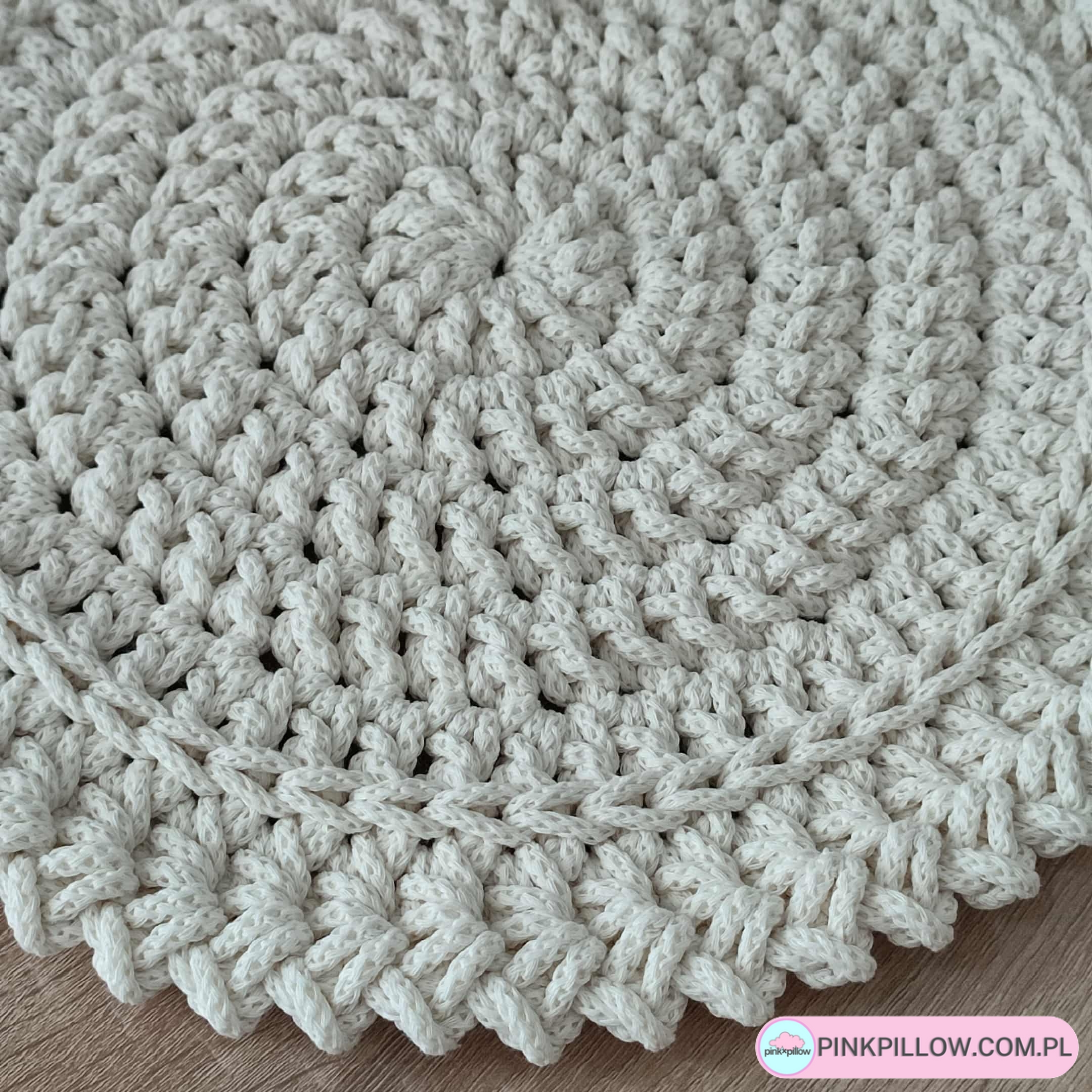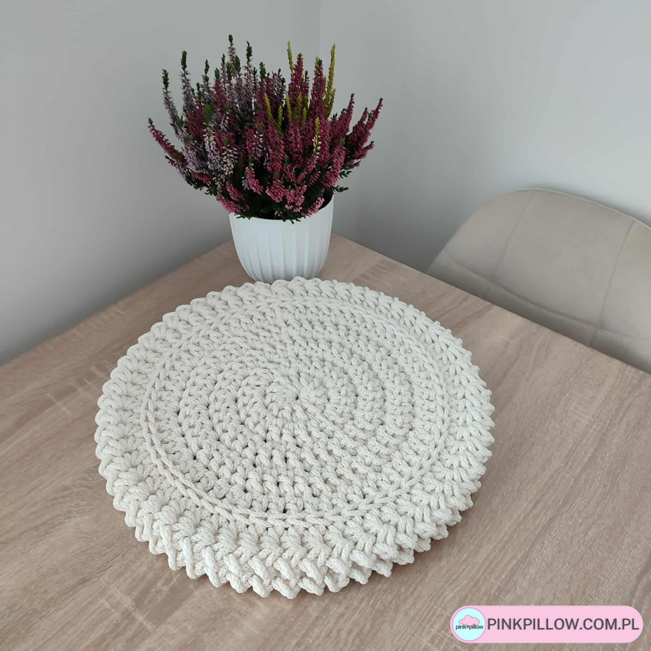 Okrągła Podkładka o średnicy 38 cm, wykonana ze sznurka ręcznie na szydełku. Bawełniany sznurek, z którego wykonana jest podkładka pochodzi z polskiej produkcji i dostępny jest w ponad 30 kolorach do wyboru (paleta dostępnych kolorów znajduje się poniżej). Podkładka świetnie sprawdzi się w kuchni lub jadalni, będąc idealną pod talerze lub inne naczynia. Jest gruba, zabezpieczy blat, a przy okazji jest łatwa w utrzymaniu w czystości, ponieważ można ją prać w pralce w 30 stopniach i wirować. Suszyć należy rozłożoną na płasko.