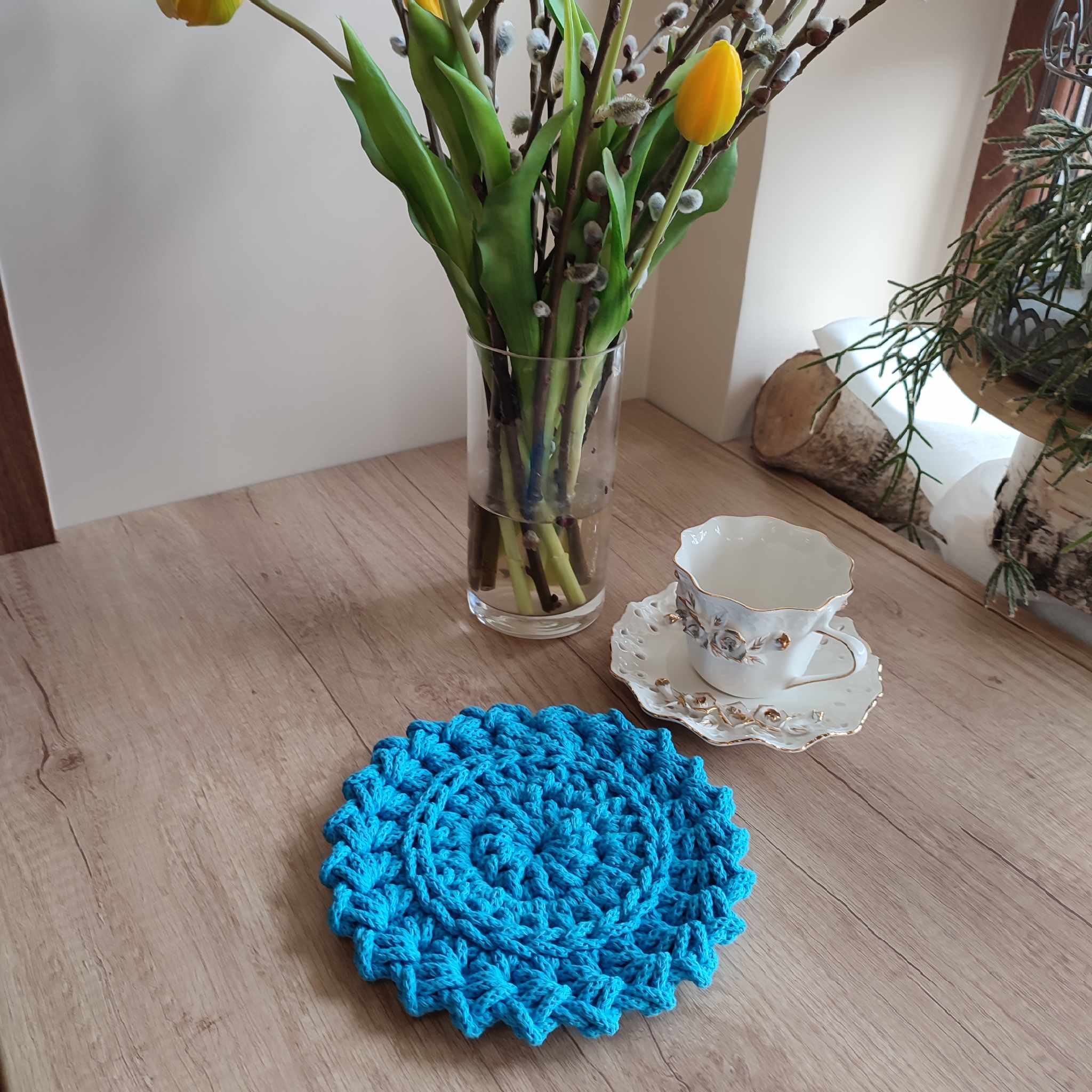 Okrągła Podkładka o średnicy 20 cm, tworzona ręcznie na szydełku ze sznurka bawełnianego 5 mm od polskiego producenta. Idealna podkładka pod kubki, filiżanki lub kieliszki, zdobiąc i jednocześnie chroniąc powierzchnię blatu stołu lub małego stolika kawowego. W przypadku zabrudzenia wystarczy uprać w pralce w 30 stopniach i wirować. Suszyć należy rozłożoną na płasko.