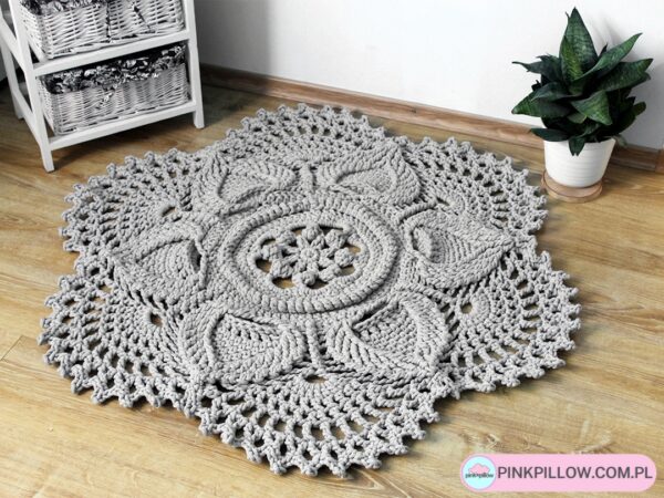 Dywan wykonany jest w całości na szydełku ze sznurka bawełnianego 5 mm z rdzeniem poliestrowym. Wzór przedstawia kwiat i nie należy do najprostszych. Wymaga on precyzji i doświadczenia, aby mógł wyglądać tak okazale. Okrągły dywan handmade dostępny jest w 68 kolorach do wyboru oraz w 5 rozmiarach. Z racji, że produkt tworzony jest warstwowo, posiada on nieregularną grubość od 1,5 do 2 cm, tworząc niejako efekt 3D wzoru.