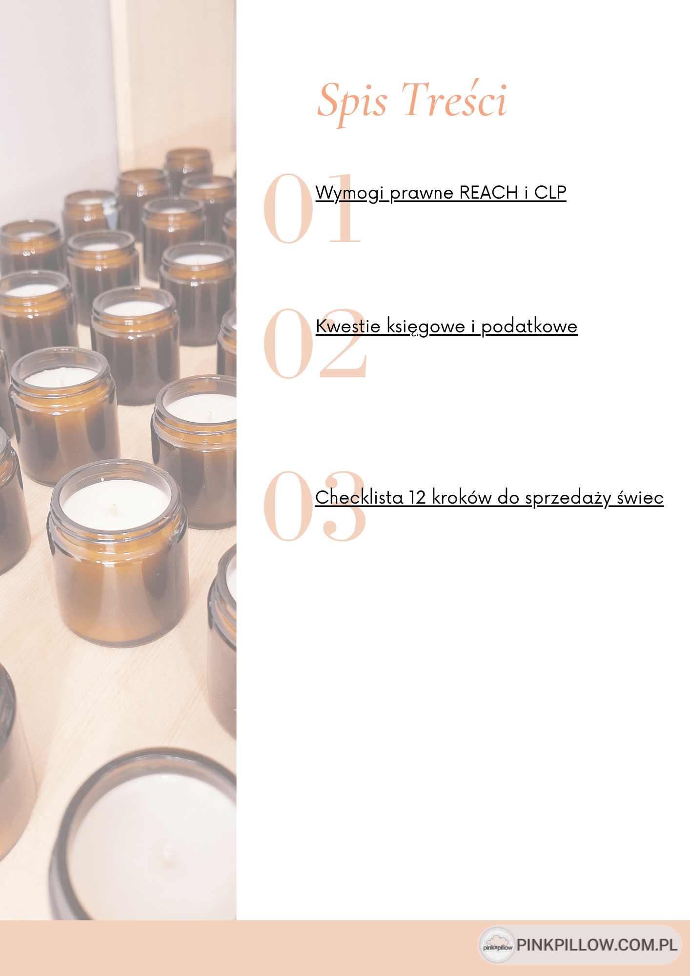Ten zestaw dwóch e-booków to praktyczny przewodnik, dzięki któremu zaczniesz sprzedawać swoje świece zgodnie z obowiązującymi przepisami – bez zgadywania, szukania po internecie i marnowania czasu. Dowiesz się, jakie formalności musisz spełnić, jak zadbać o bezpieczeństwo produktu i jak prowadzić dokumentację, by mieć wszystko pod kontrolą.