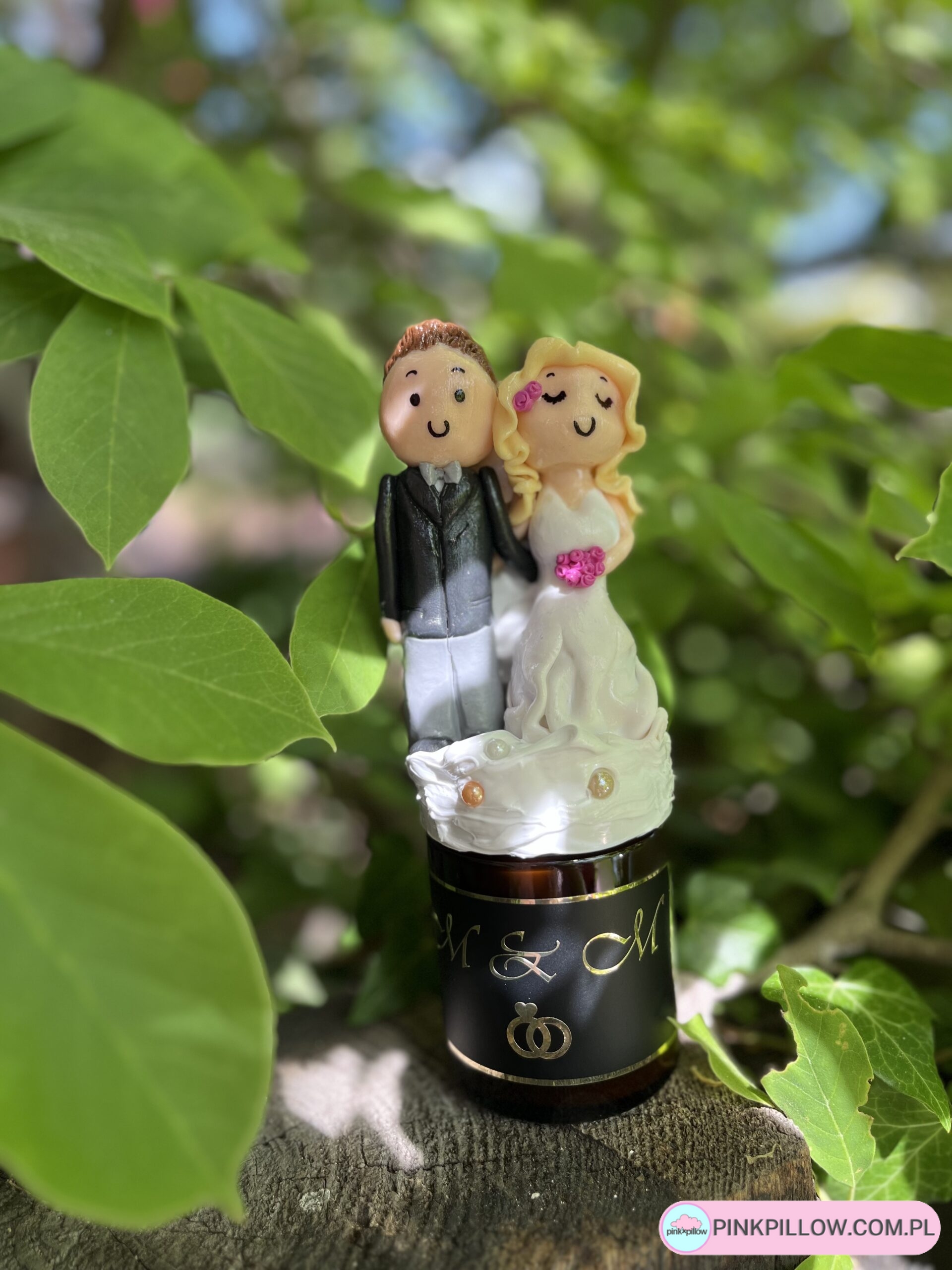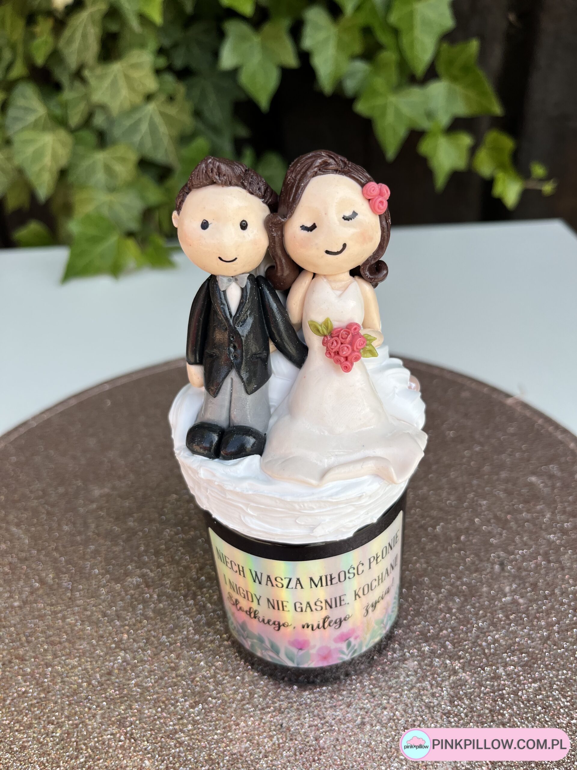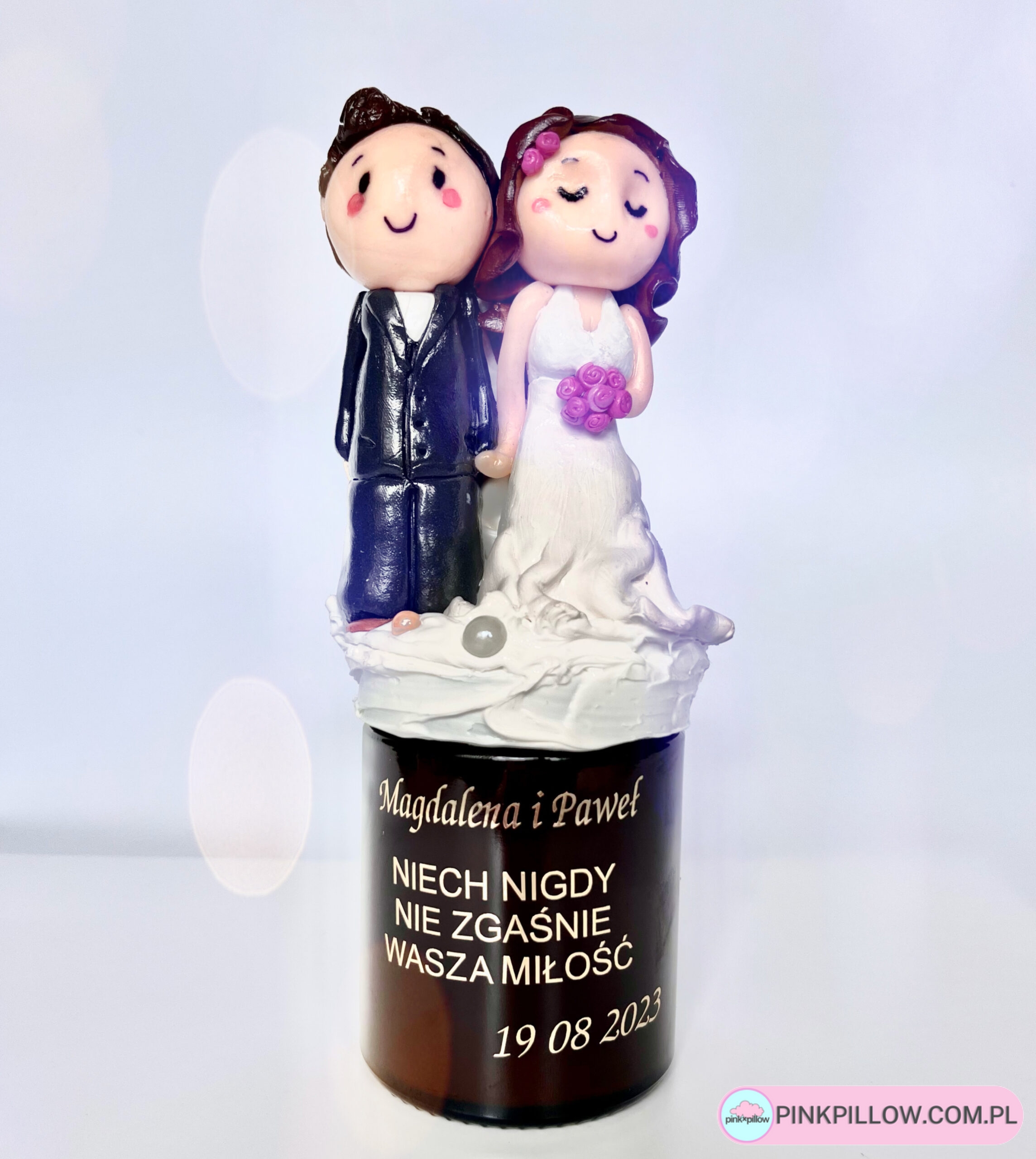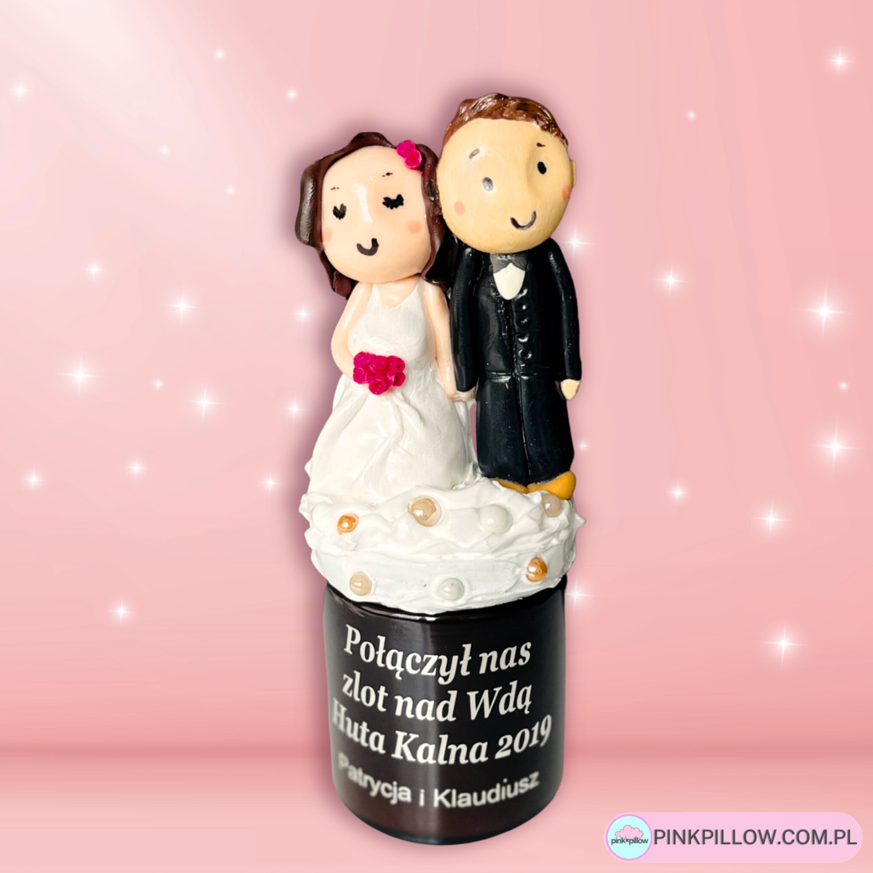 Na wieczku znajduje się figurka Pary Młodej, ręcznie lepiona z masy termoutwardzalnej na Twoje specjalne zamówienie!