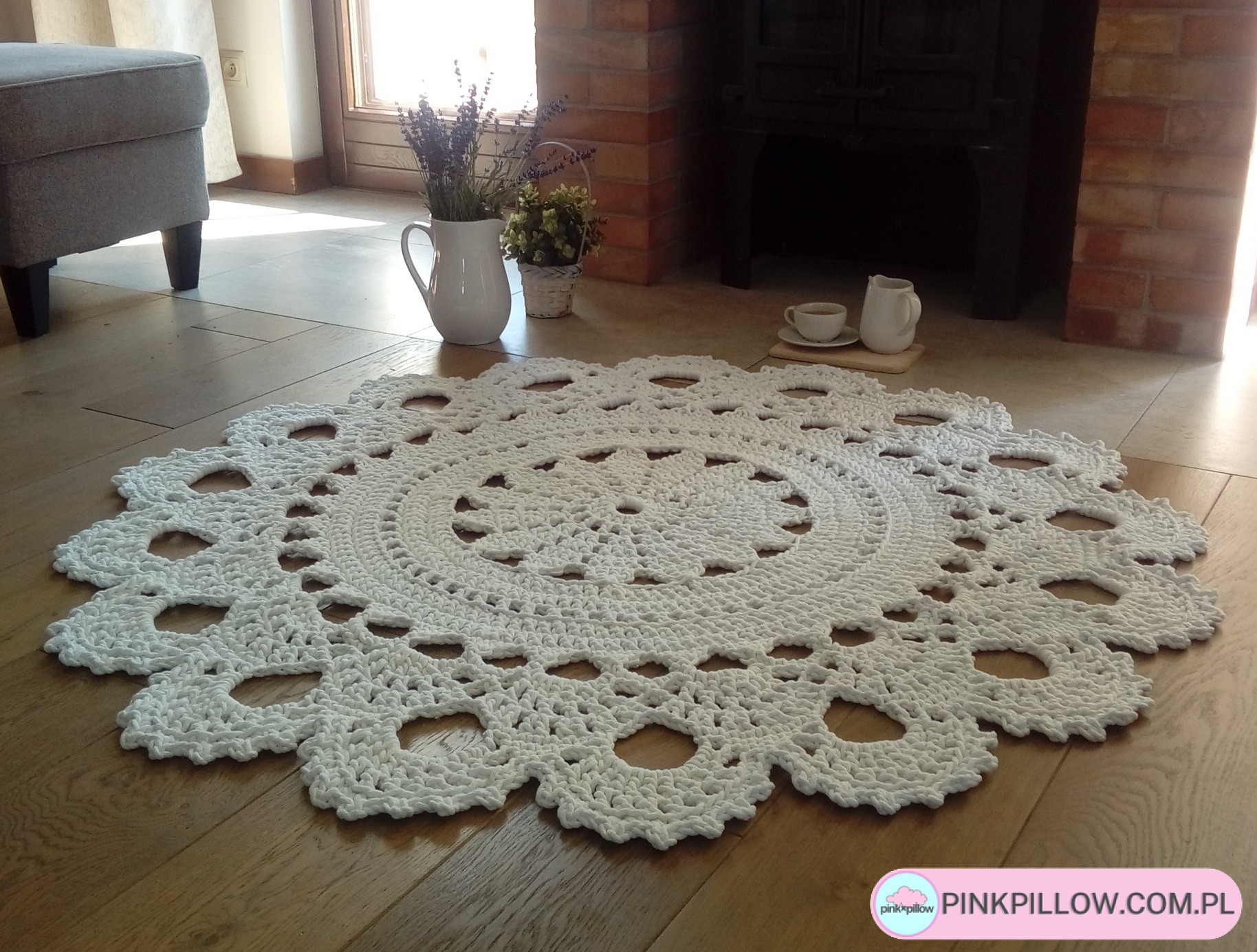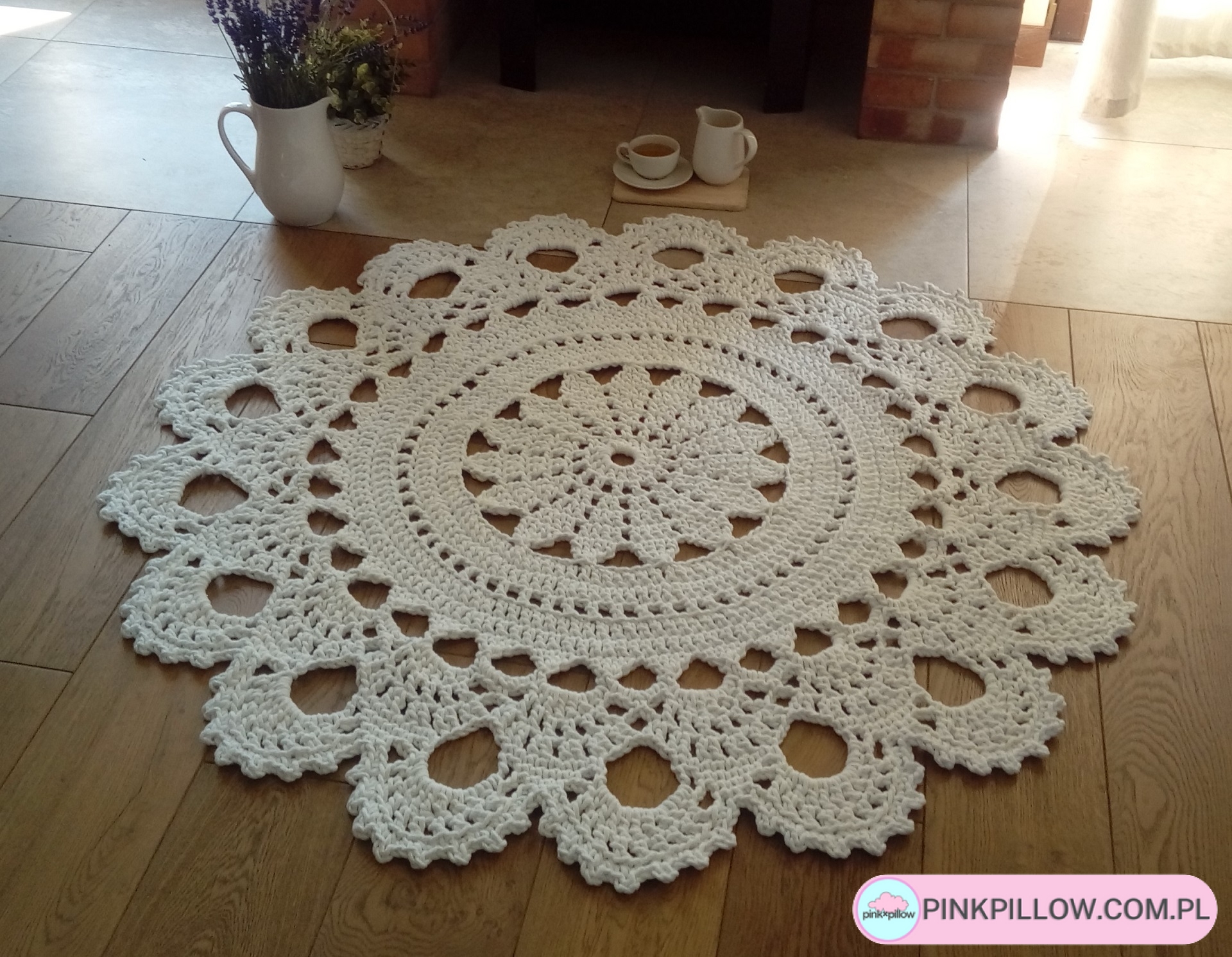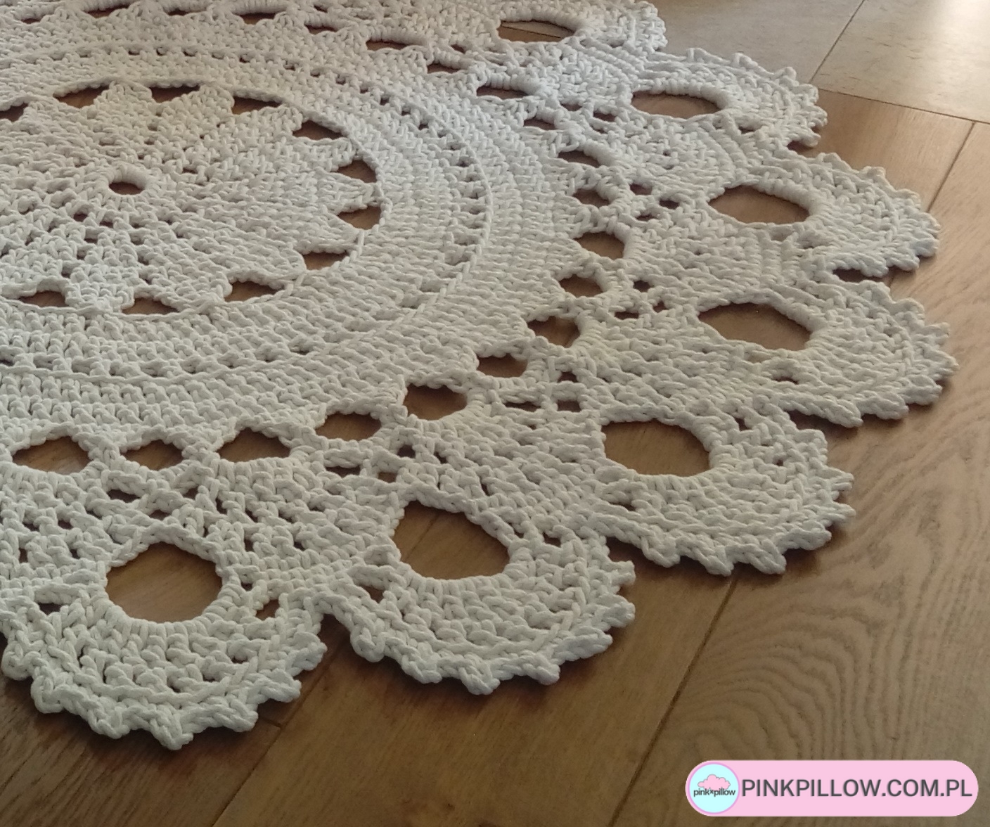 Piękny Dywan wykonany ręcznie, ażurowym wzorem w kolorze Ecru. Duża średnica całości, gdyż to 140 cm. Dzięki starannemu wykonaniu dywan jest dwustronny, więc można eksponować go również na drugiej stronie. Ozdobi każde wnętrze. Zastosowany materiał – 5 mm sznurek w 100% bawełniany bezpieczny również dla alergików. Sznurek najwyższej jakości wyłącznie od polskich producentów. Łatwy w utrzymaniu w czystości, można prać w temp. 30 st.