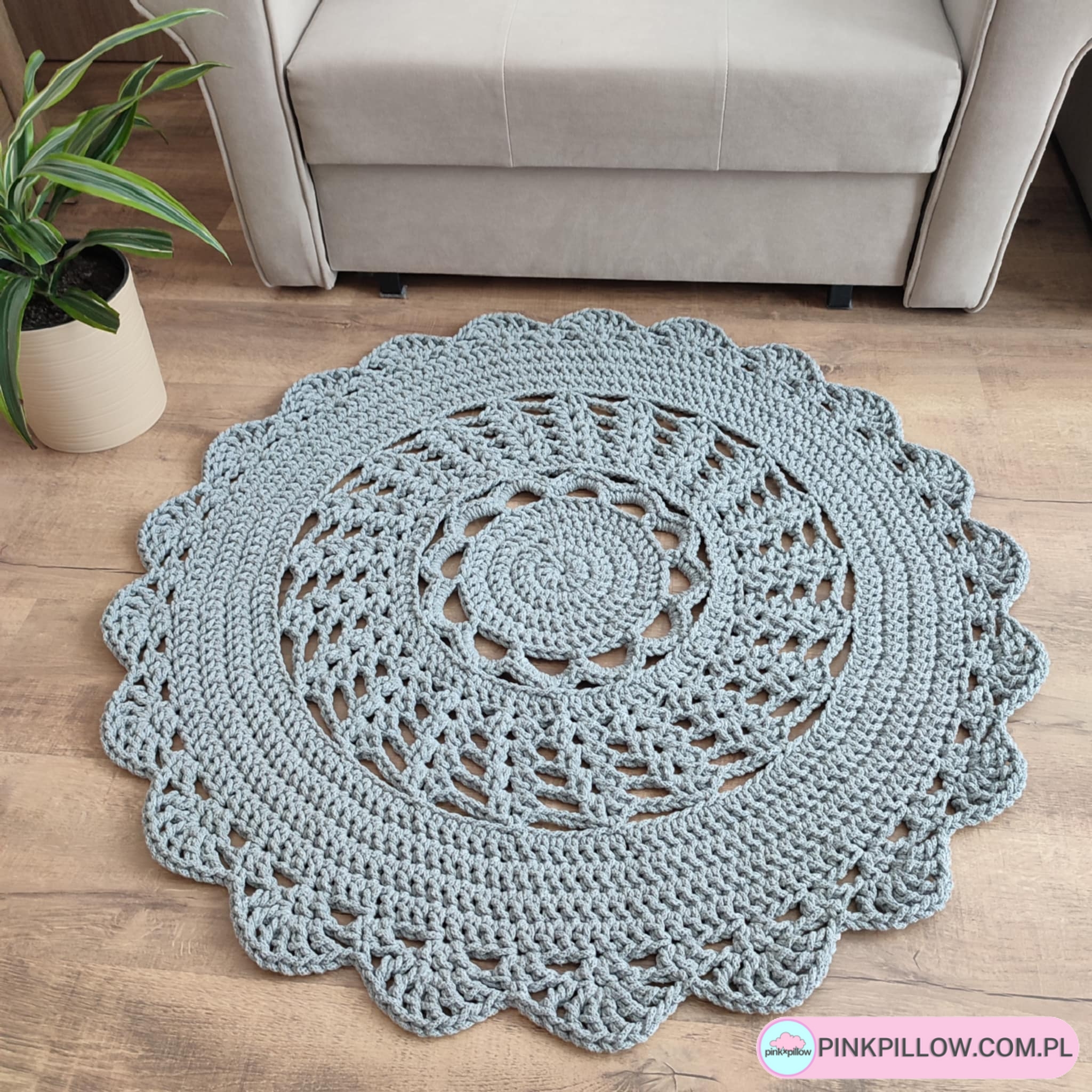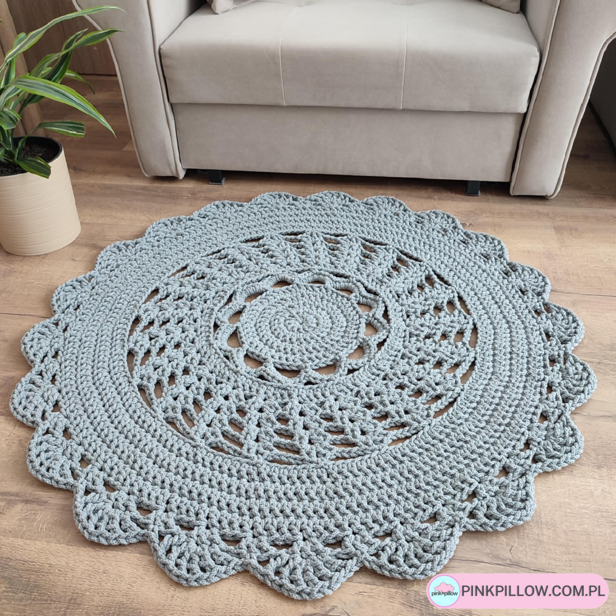Piękny Dywan o średnicy 100 cm, czyli 1 metr, wykonany metodą szydełkowania ręcznie z polskiego, bawełnianego sznurka 5mm. Sprawdzi się w salonie, będąc pięknym dodatkiem, który będzie cieszył oczy. Dywan sprawdzi się również w sypialni, jadalni, kuchni, czy innych pomieszczeniach.