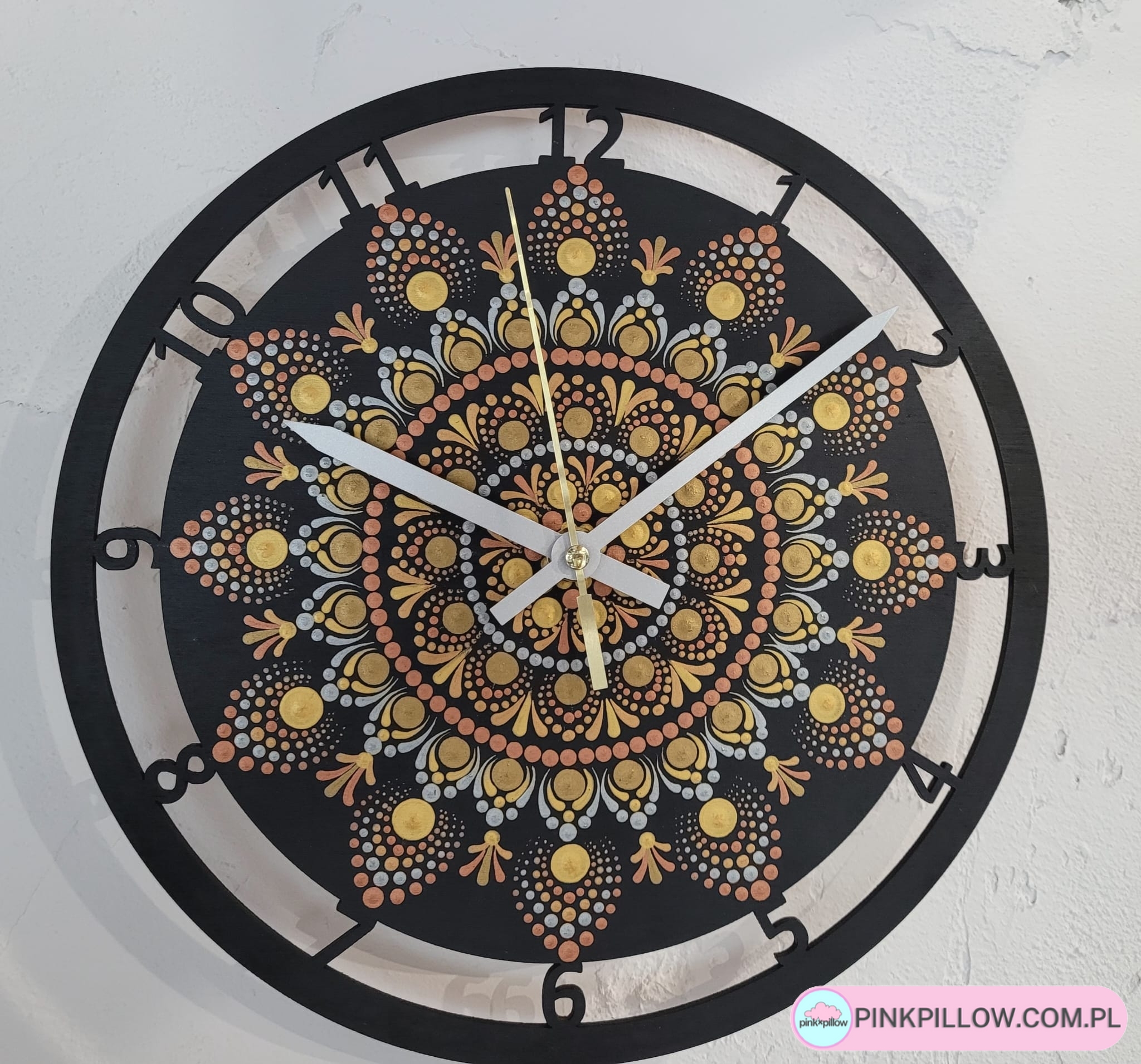 Kolory wzoru to odcienie złota z dodatkiem srebra. Wzór na zegarze to Mandala.