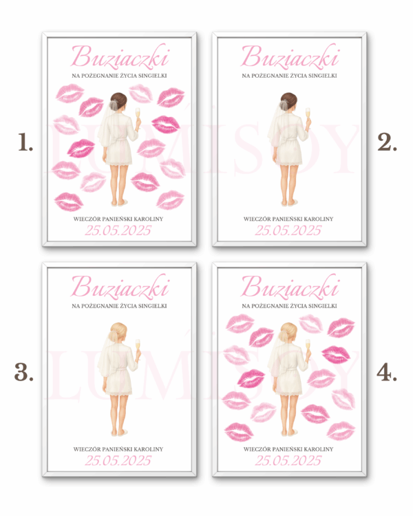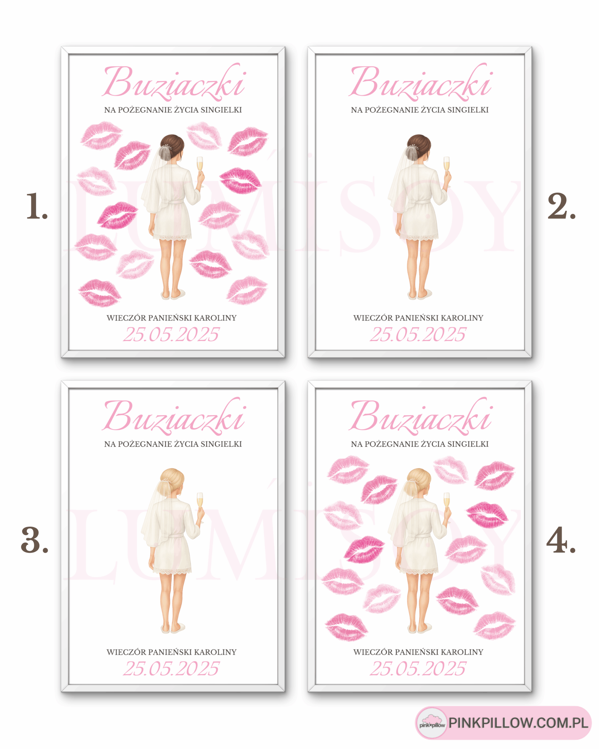 Plakat personalizowany do wręczenia na Wieczór Panieński. Plakat w dwóch wersjach do wypełnienia odbiciami całusów od uczestniczek Wieczoru Panieńskiego. Dostępne różne wzory plakatu do wyboru. Format do wyboru A4 i A5, druk na papierze satynowym matowym gramatura 300 g