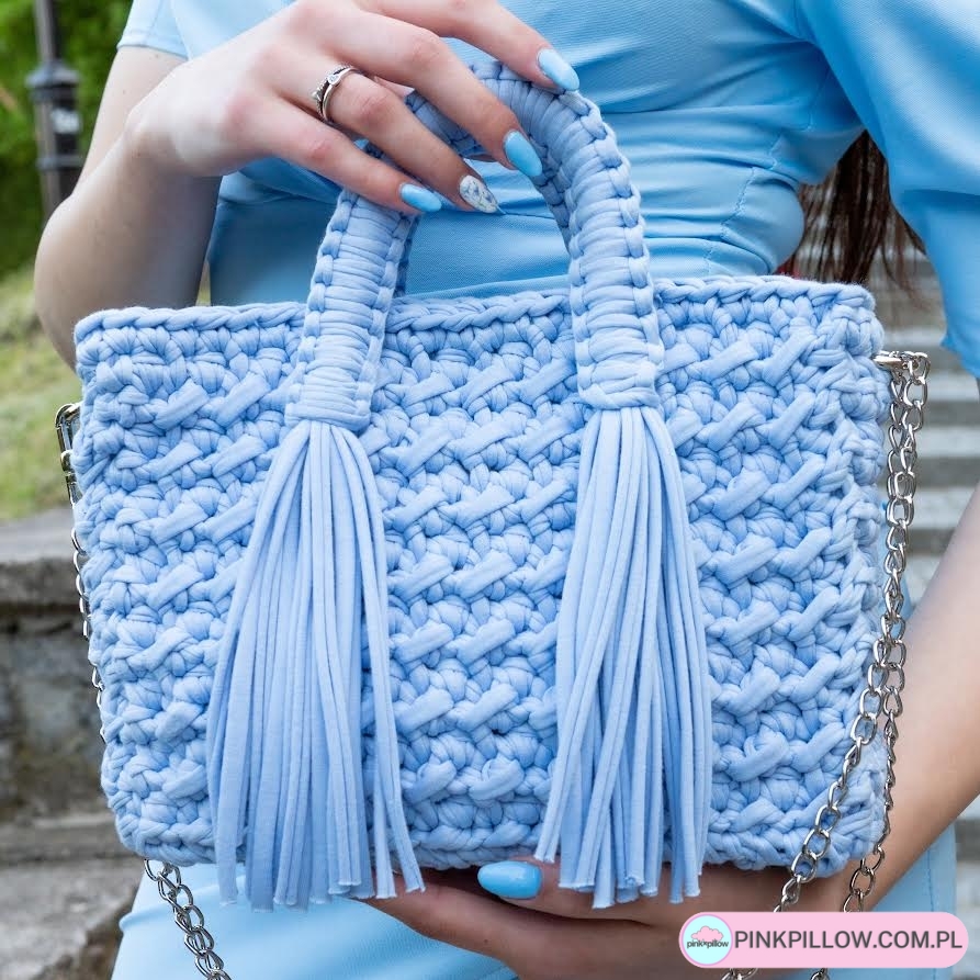 Torebka, która w ciekawy sposób uzupełni każdą stylizację. Wykonana jest z najwyższej jakości bawełnianej przędzy produkowanej w Polsce. Do wyboru jest ponad 45 wspaniałych kolorów, dodatki mogą być w odcieniach srebra lub złota.