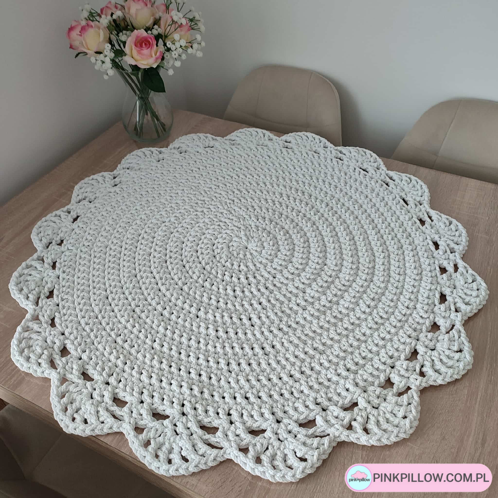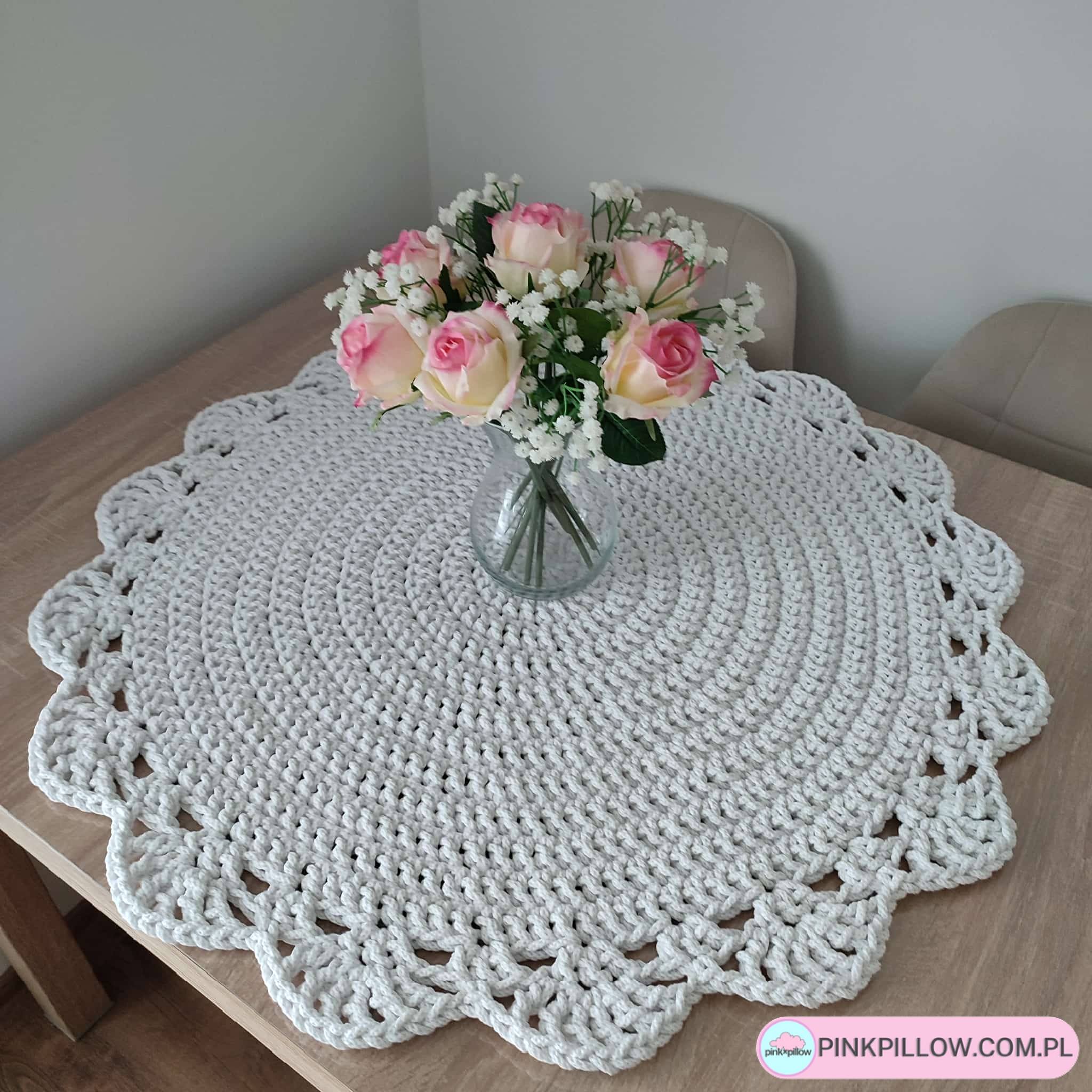 Podkładka o średnicy 80 cm, wykonana metodą szydełkowania z polskiego sznurka bawełnianego 5mm. Sprawdzi się w kuchni, salonie, jadalni. Będzie pięknym i praktycznym dodatkiem do wystroju wnętrz. Jest łatwa w utrzymaniu w czystości. Można prać w pralce w 30 stopniach i wirować. Suszyć należy rozłożoną na płasko.