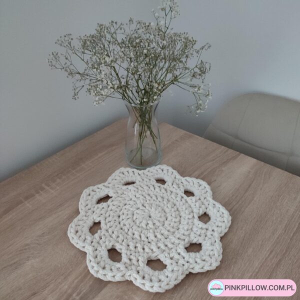 Okrągła Podkładka o średnicy 30 cm na stół, wykonana z polskiego sznurka bawełnianego 5mm ręcznie przy pomocy szydełka.