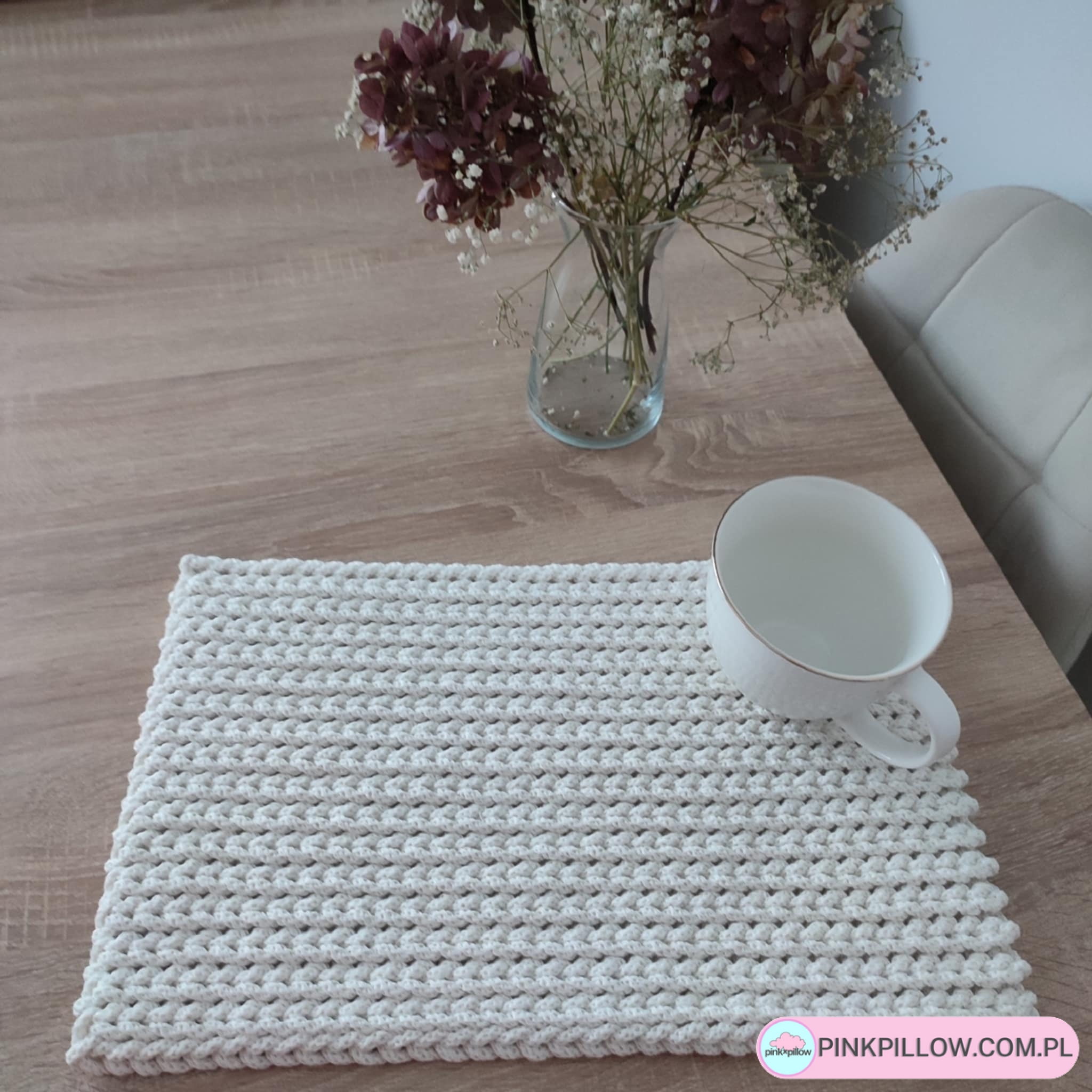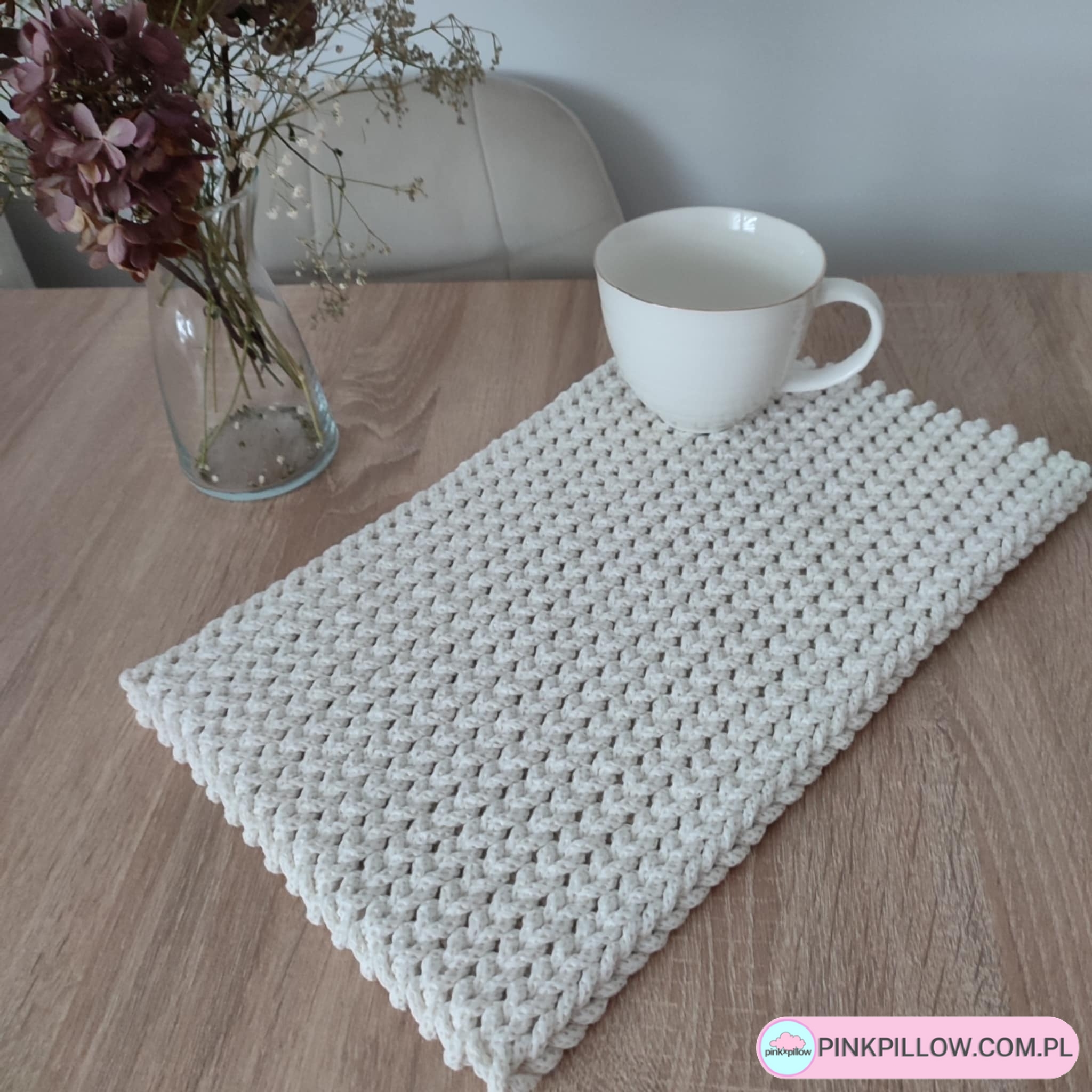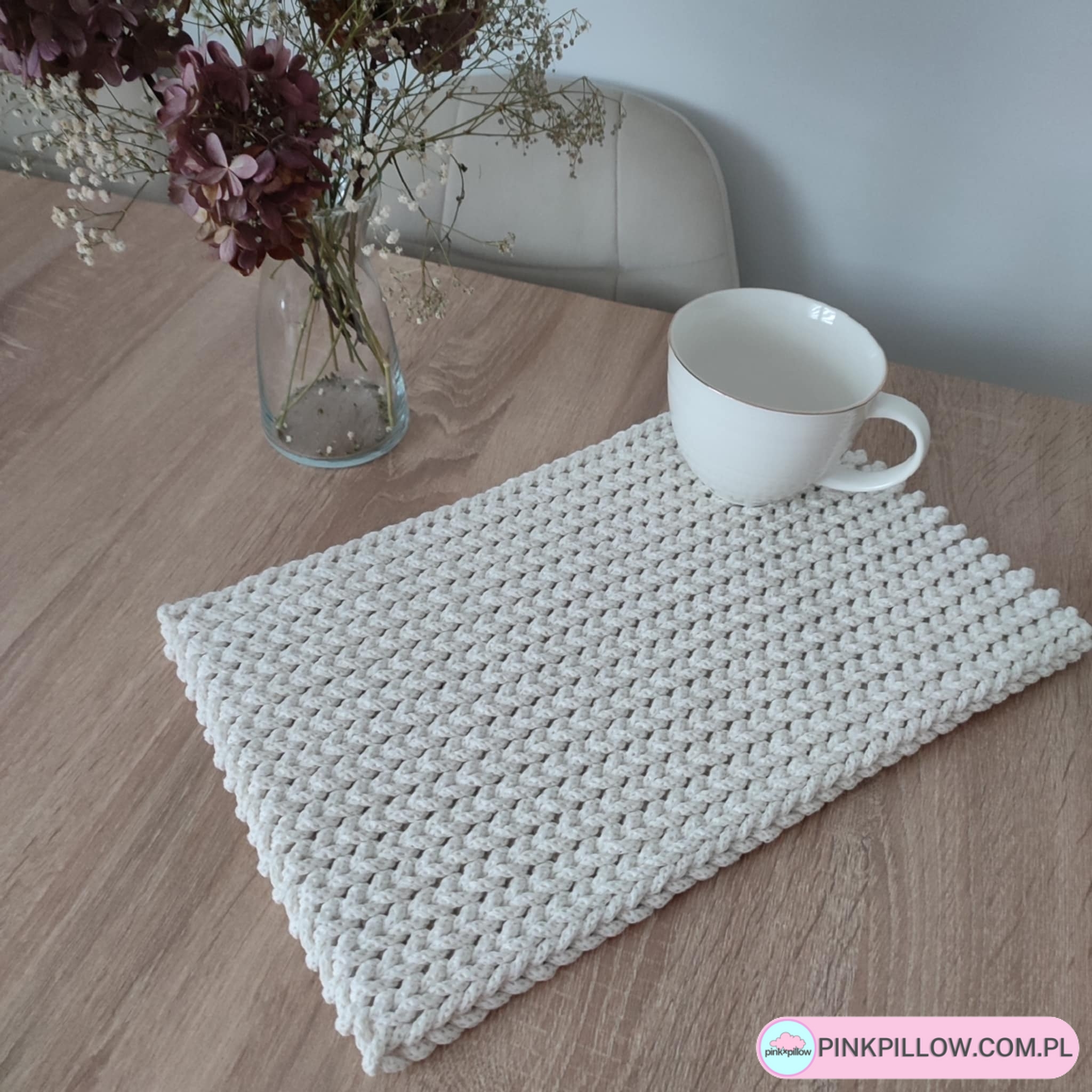 Prostokątna podkładka o wymiarach 30×40 cm, wykonana metodą szydełkowania z polskiego sznurka bawełnianego 5mm. Jest gruba, idealna pod talerze, zabezpieczy blat stołu, ale będzie również pięknym dodatkiem do wystroju. Można prać w pralce w 30 stopniach i wirować. Suszyć należy rozłożoną na płasko.