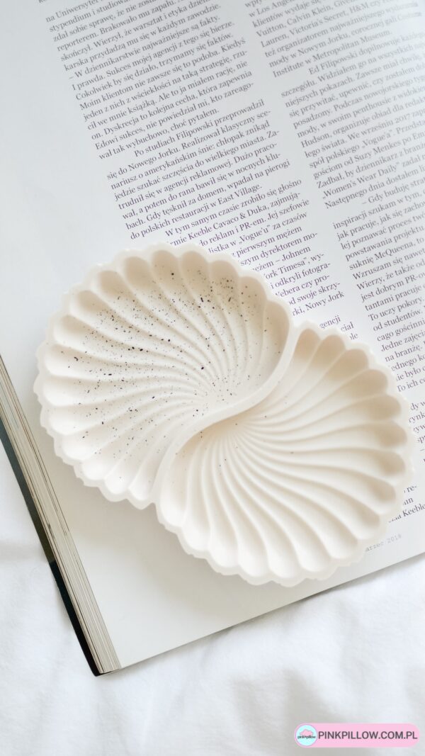 Podstawka Muszelka na biżuterię, wykonana z gipsu polimerowego, który jest przyjazny dla środowiska. Każda podstawka jest w 100% robiona ręcznie, dlatego jest unikatowa i nigdy nie będzie dwóch takich samych.