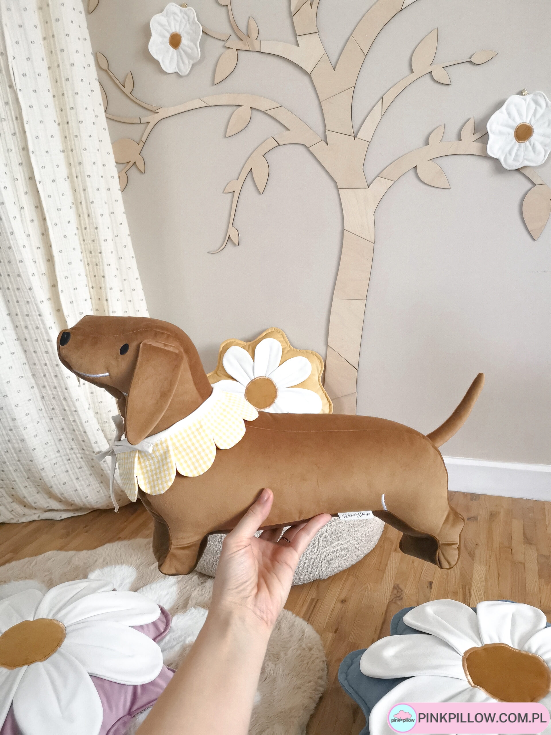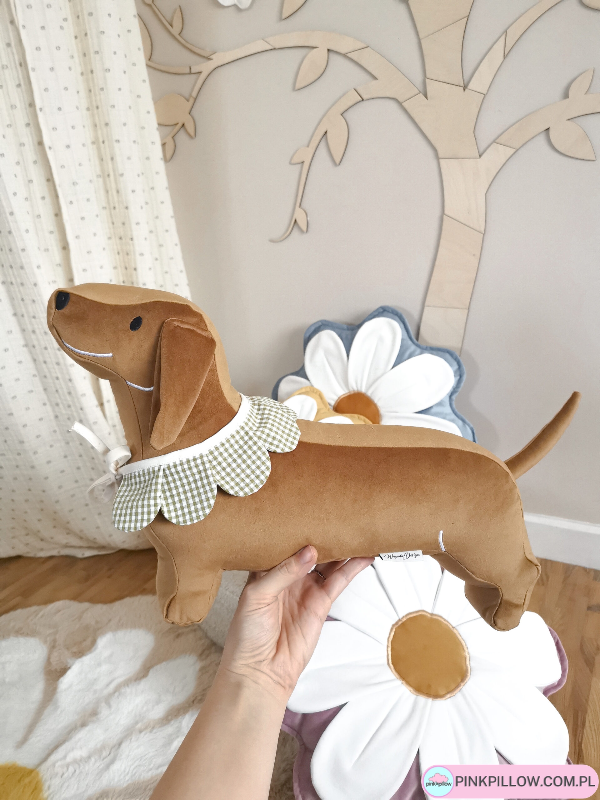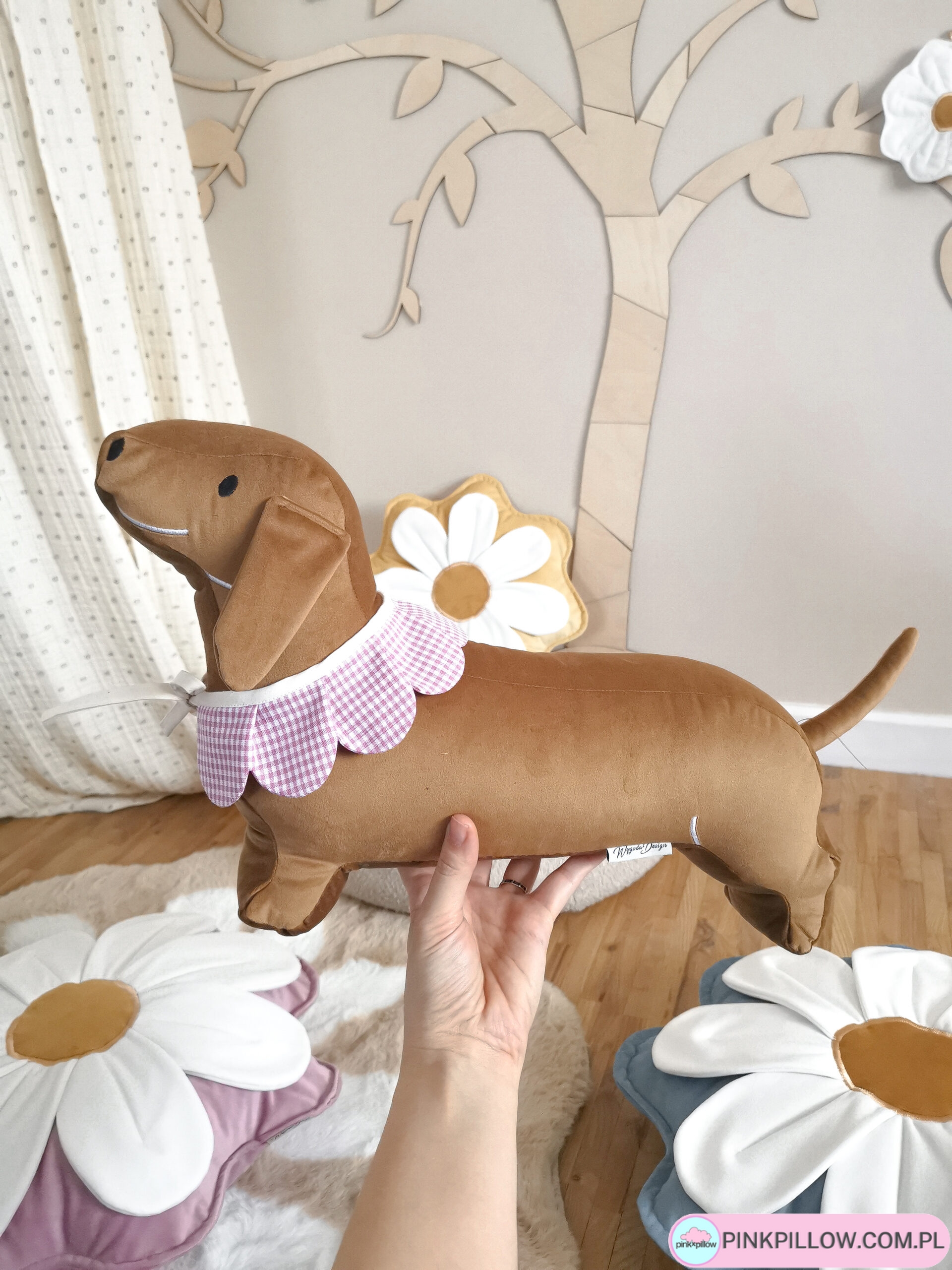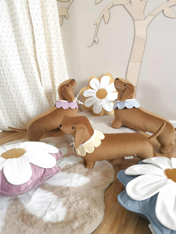 Ręcznie wykonana poduszka dekoracyjna w kształcie jamnika to wyjątkowy dodatek do pokoju dziecka, salonu lub sypialni. Uszyta z wysokiej jakości velvetu, zachwyca miękkością i estetyką wykonania.
