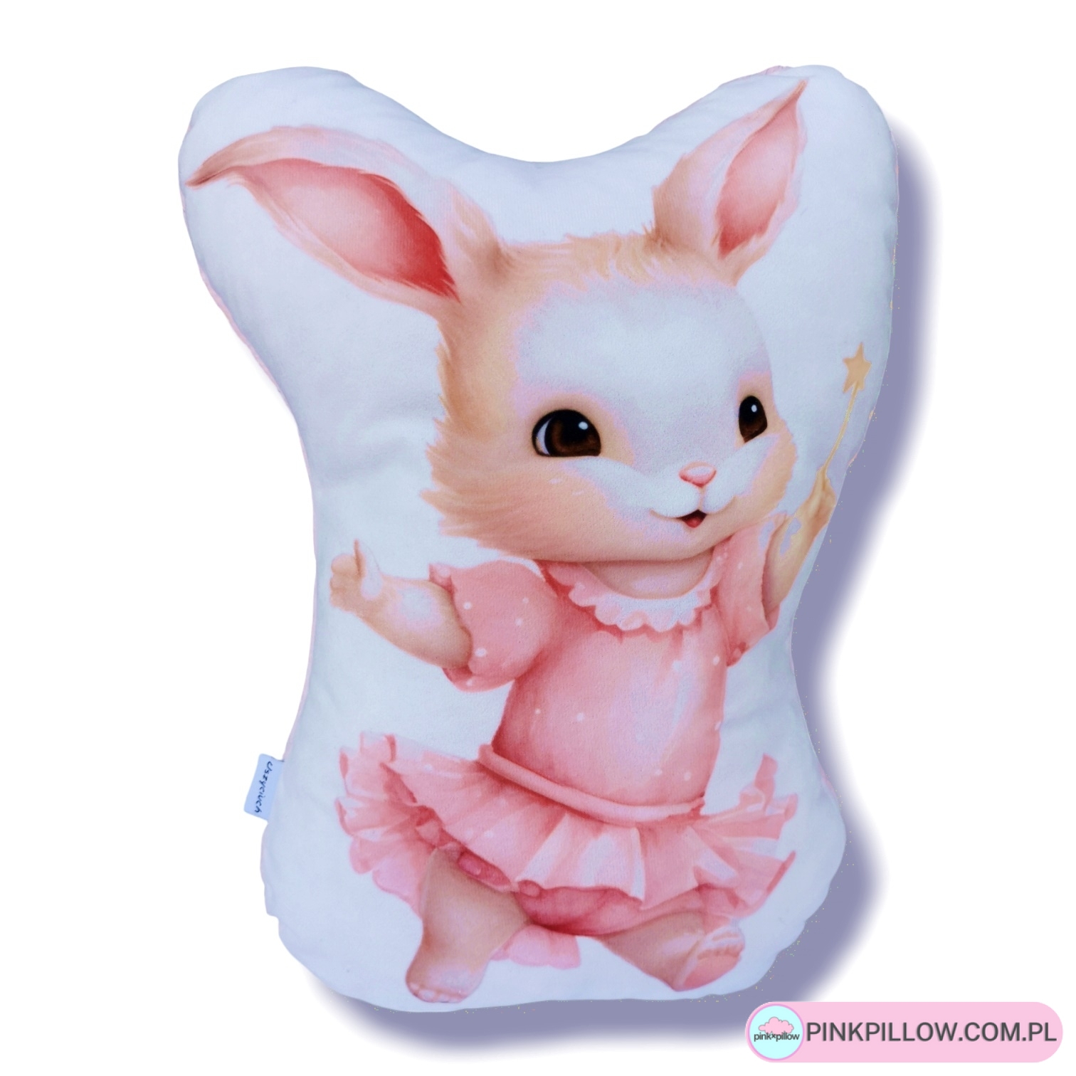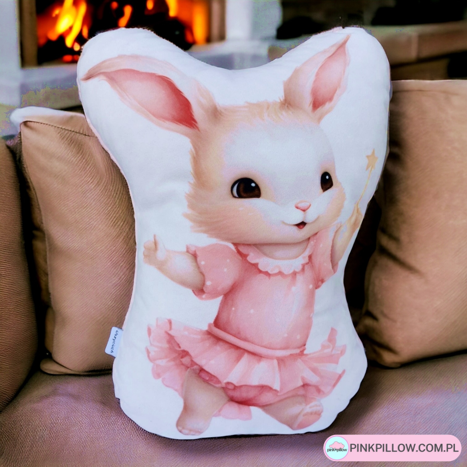 Dekoracyjna poduszka z nadrukiem Dziewczynki Królik Baletnicy. Wykonana z mikrofazy z wzorem królika i z mięciutkiego polaru minky w kolorze różowym. Wypełniona kulką silikonową najwyższej jakości. Druk na poduszce wykonany metodą sublimacji, dzięki czemu jest trwały, nie spiera się podczas prania, ani nie wyciera podczas użytkowania poduszki. A dodatkowo ma wyraziste kolory i jest realistyczny. Mikrofaza to z kolei pluszowa tkanina obiciowa, która jest miękka i bardzo przyjemna w dotyku, a rodzaj jej splotu sprawia, że jest jednocześnie wytrzymała. W wyglądzie oraz w dotyku przypomina welur obiciowy.
