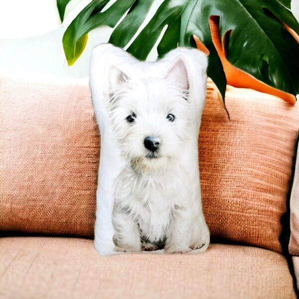 Słodka poduszka pluszak w pieska rasy West. Uszyta z mikrofazy z wzorem pieska i z mięciutkiego polaru minky w kolorze beżowym. Mikrofaza jest pluszową tkaniną obiciową, jest miękka i bardzo przyjemna w dotyku, a rodzaj jej splotu sprawia, że jest jednocześnie wytrzymała. W wyglądzie oraz w dotyku przypomina welur obiciowy. Druk na poduszce nie jest naprasowanką ani naklejką, jest to trwały nadruk robiony metodą sublimacji. Dzięki temu nadruk nie spiera się podczas prania, ani nie wyciera podczas użytkowania poduszki. Poduszka jest mięciutka, ma wyraziste kolory a całość jest bardzo realistyczna. Maskotka piesek może pełnić funkcję ozdobną, lub funkcjonować jako poduszka do spania.