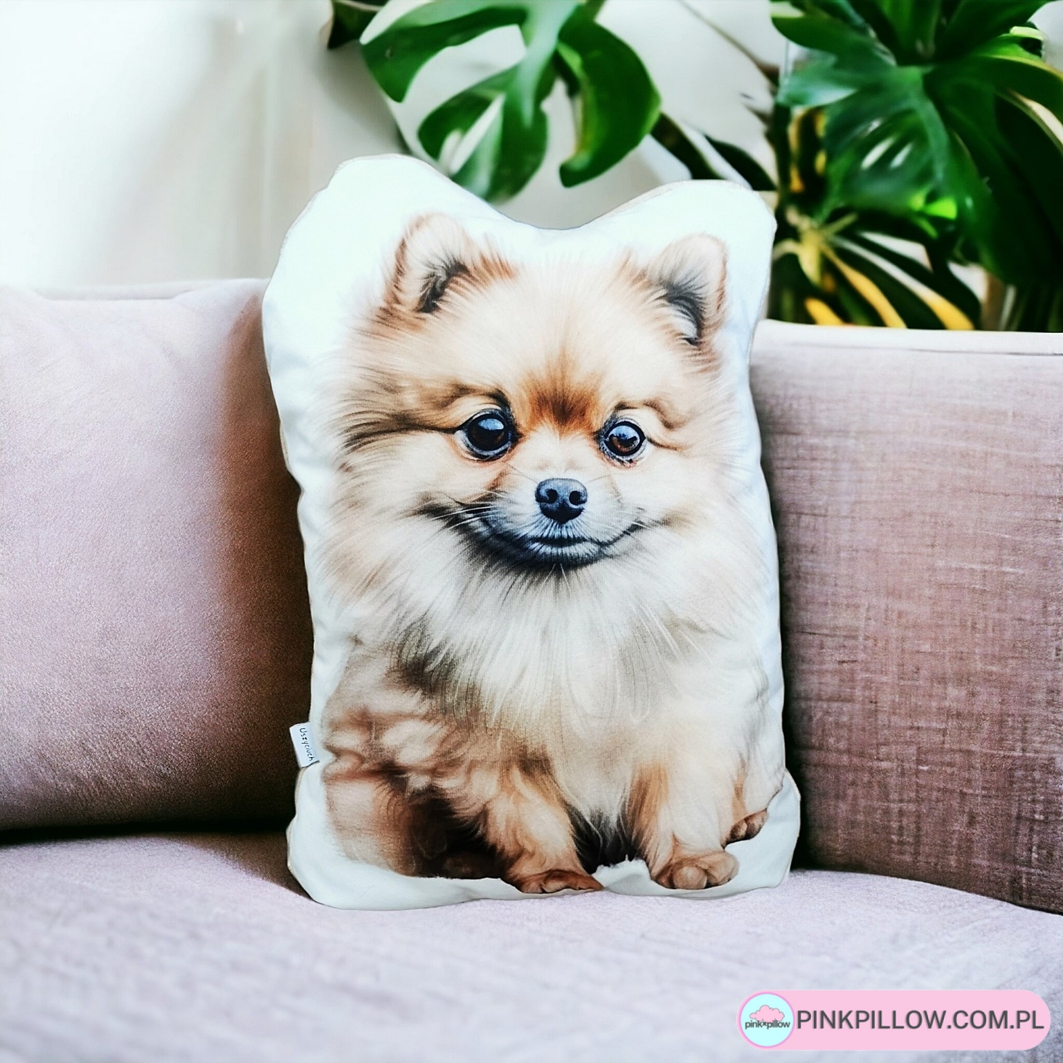 Dekoracyjna Poduszka ze wzorem Pomeranian uszyta z mikrofazy i z mięciutkiego gładkiego polaru minky w kolorze beżowym.