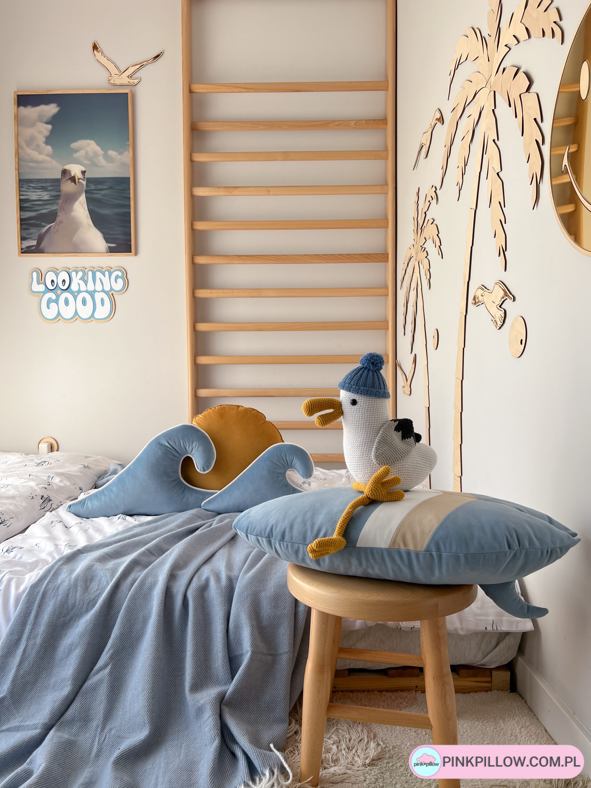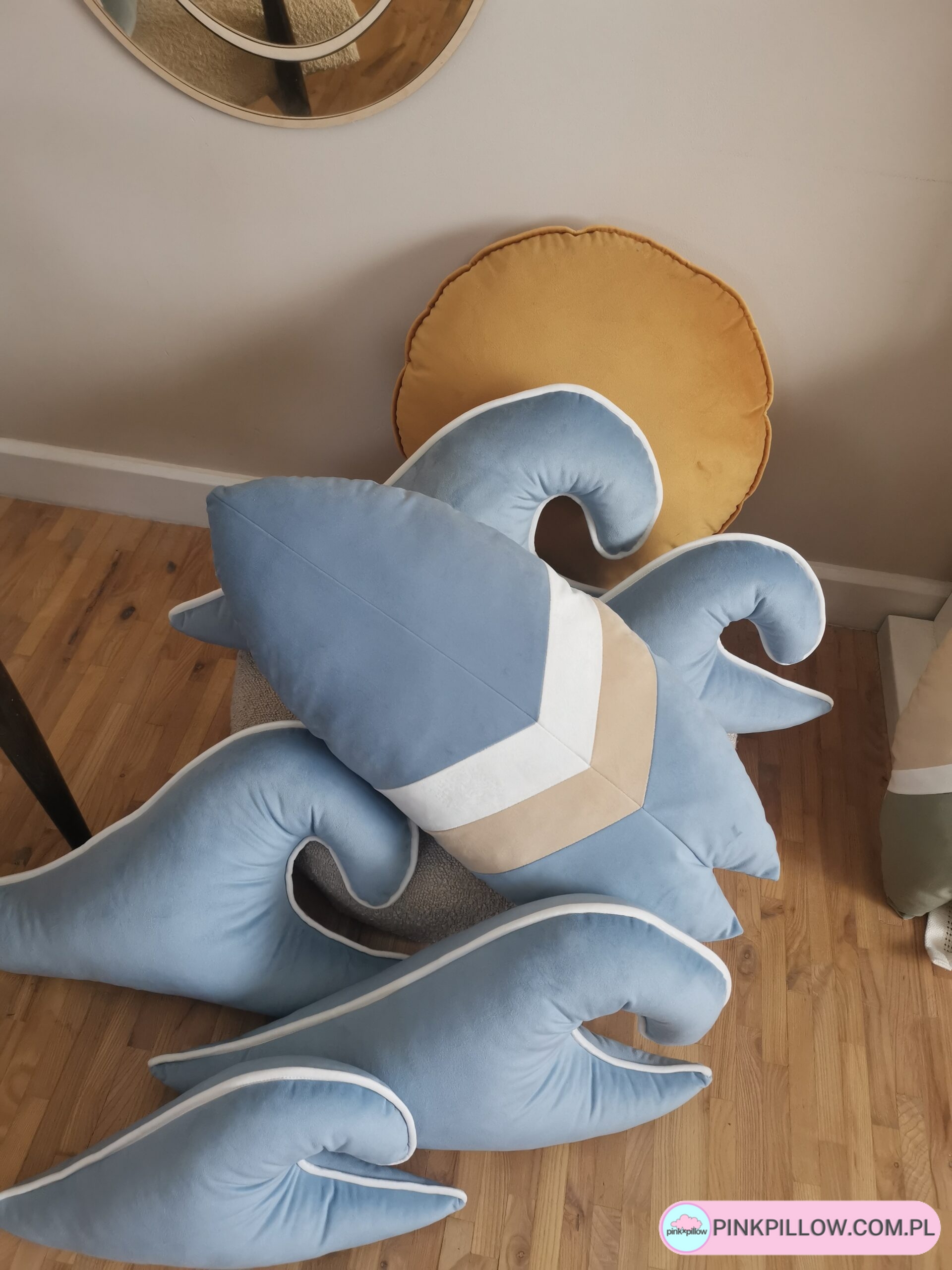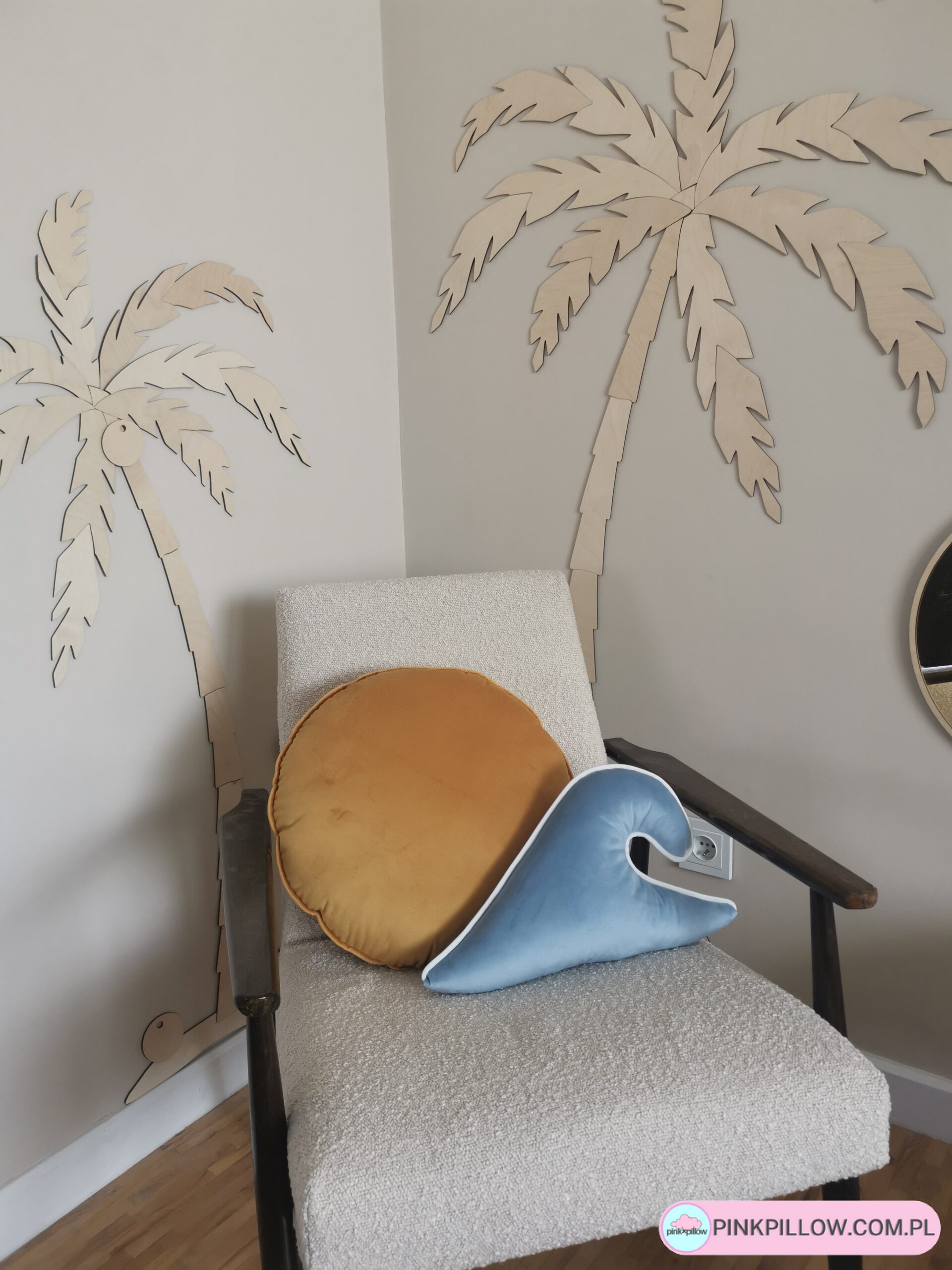 poduszką welurowa w kształcie zachodu słońca oraz poduszkami w kształcie deski surfingowej. Wszystkie produkty uszyte z wysokiej jakości tkanin, odpornych na zabrudzenia.