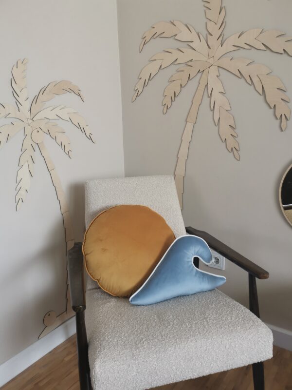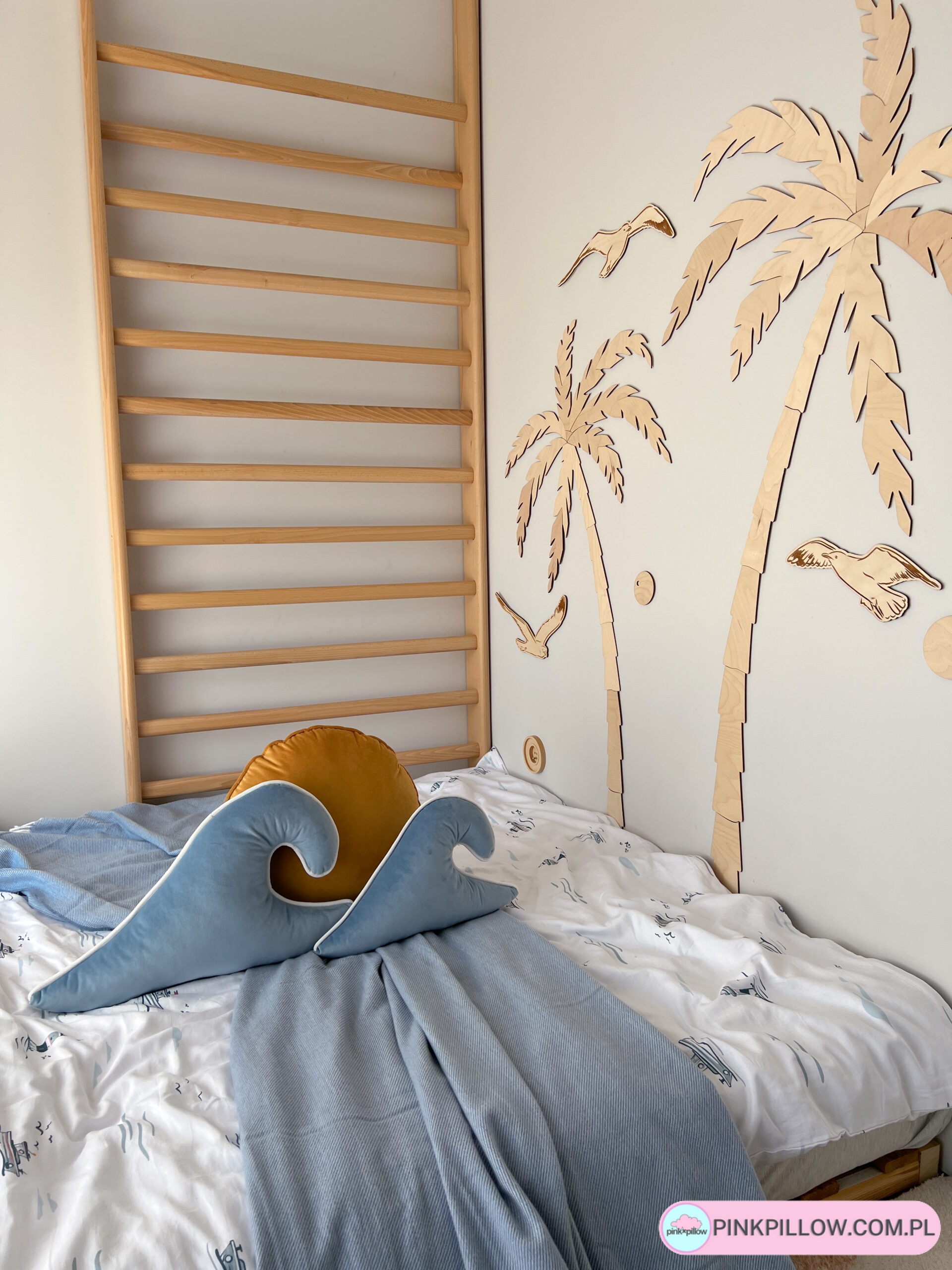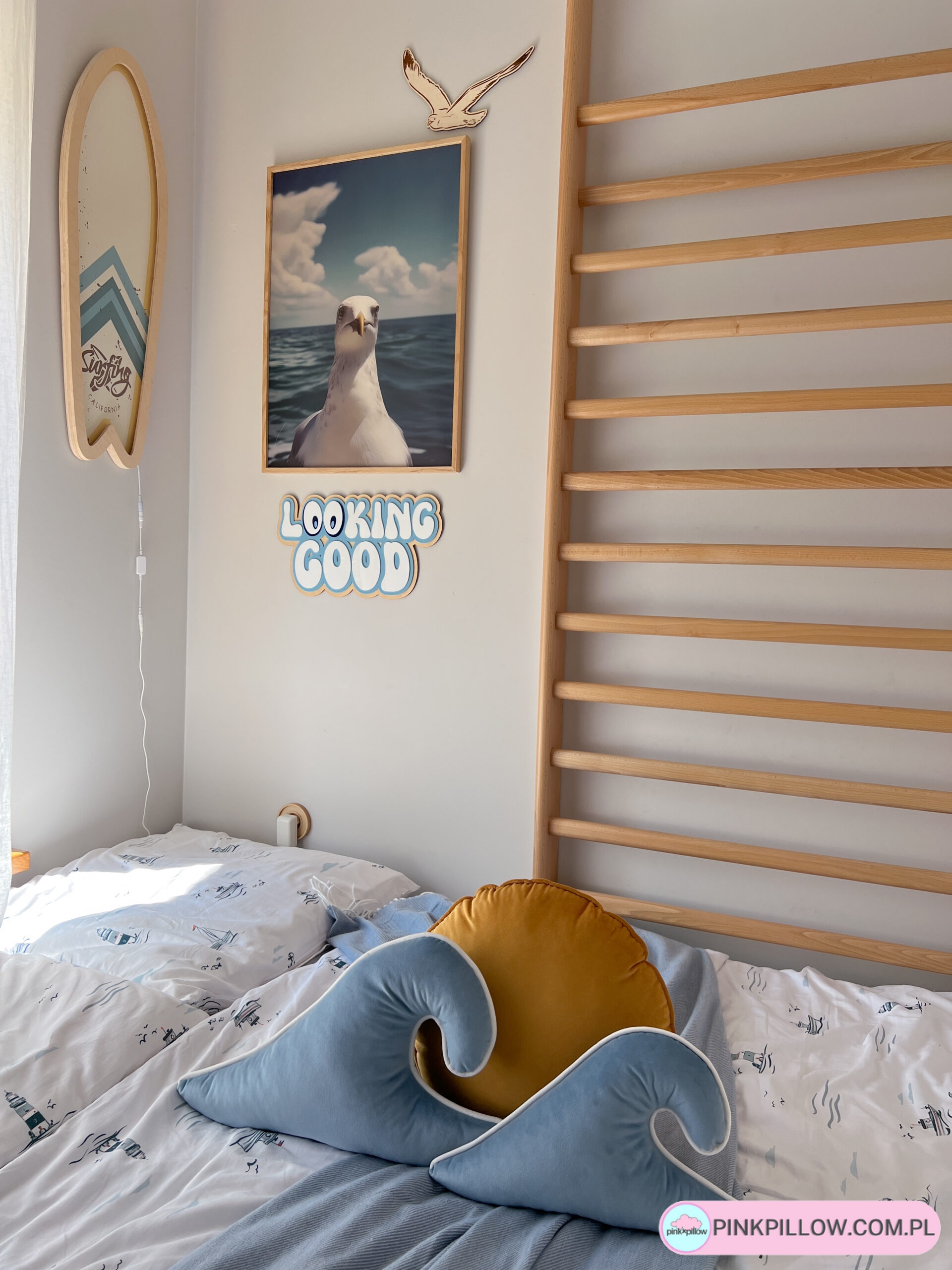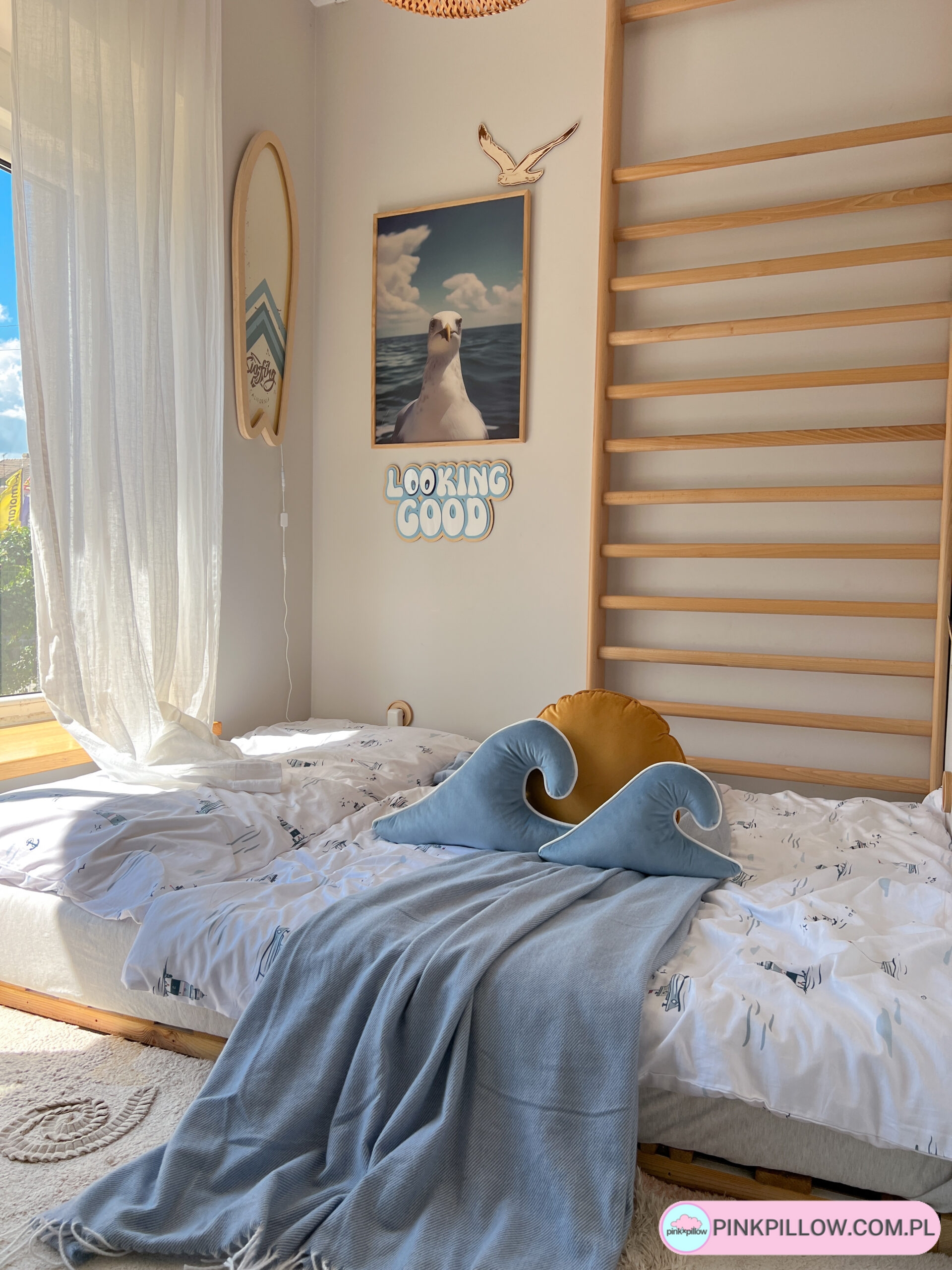 poduszką welurowa w kształcie zachodu słońca oraz poduszkami w kształcie deski surfingowej. Wszystkie produkty uszyte z wysokiej jakości tkanin, odpornych na zabrudzenia.