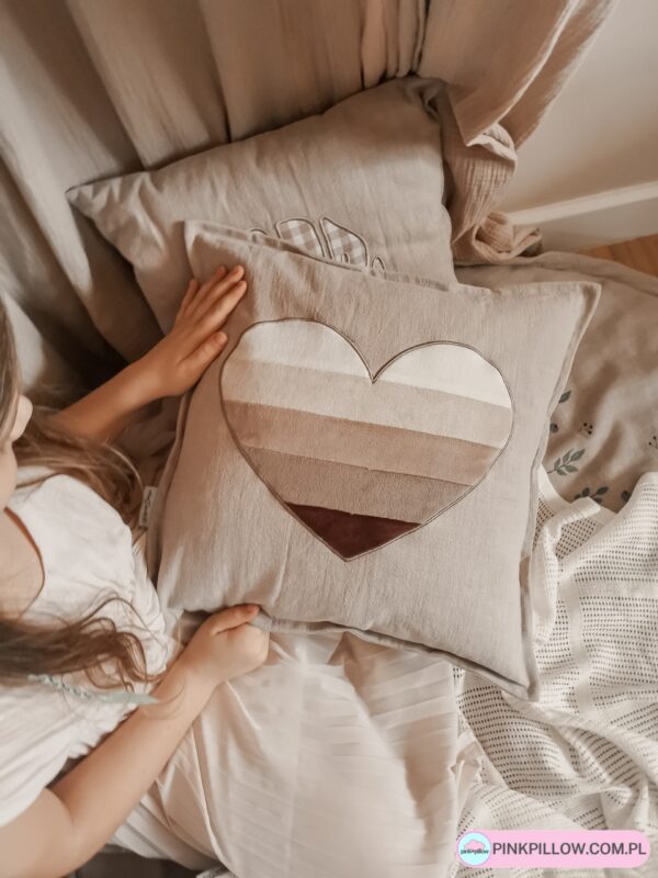 Lniana poduszka z aplikacją w kształcie Serca. Materiał poduszki w kolorze beżowym. Serce zaś wykonane z velvetu w różnych odcieniach beżu. Poduszka będzie stanowić uzupełnienie łóżka lub kącika zabaw w pokoju dziecięcym. Idealnie będzie wyglądać w salonie na sofie, w ulubionym fotelu i wszędzie tam, gdzie zależy nam na stonowanych kolorach. Świetnie propozycja na prezent z okazji walentynek, urodzin czy rocznicy.
