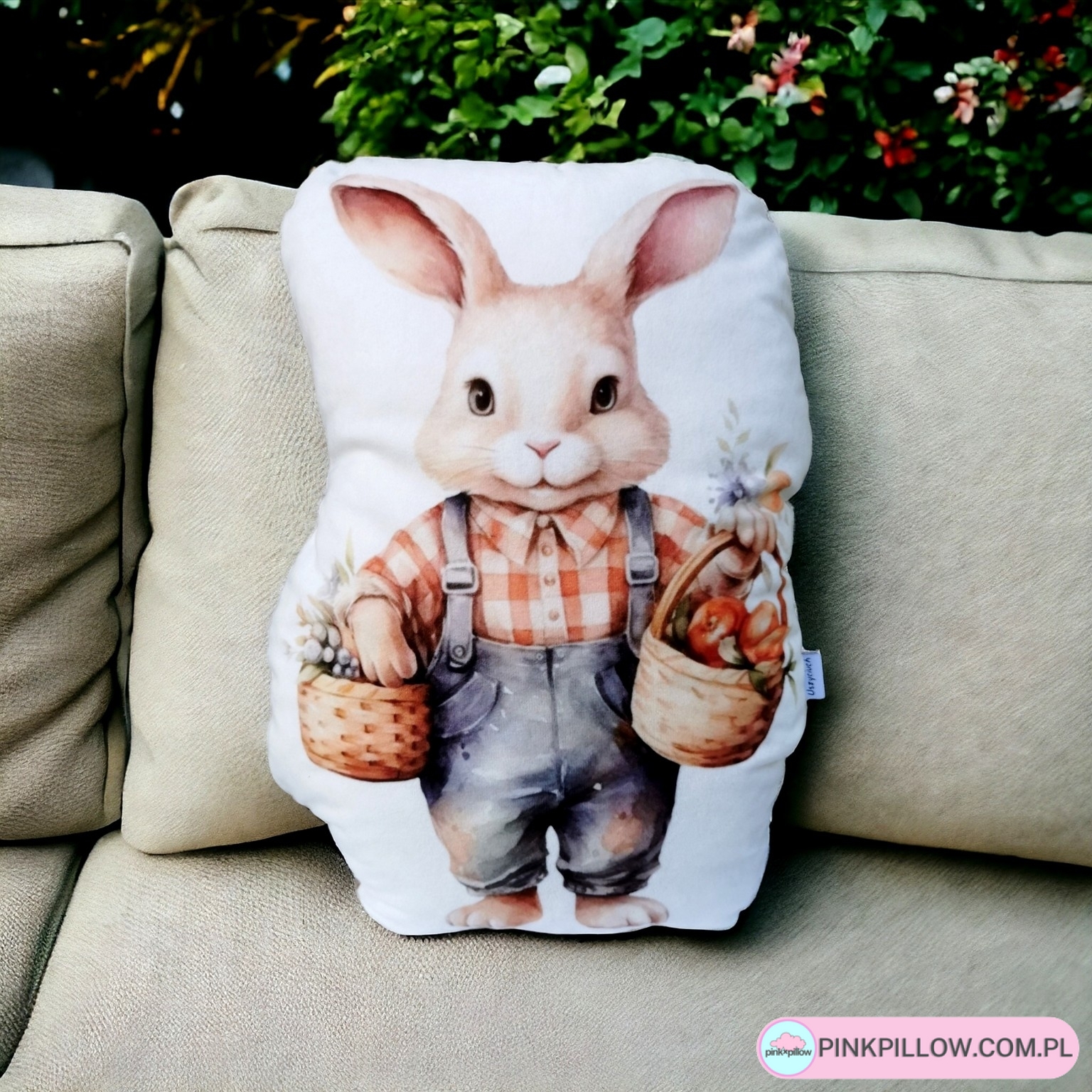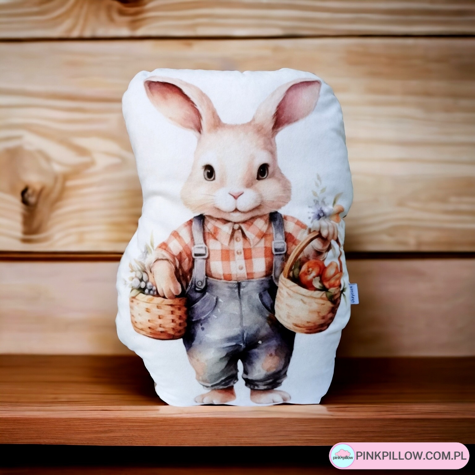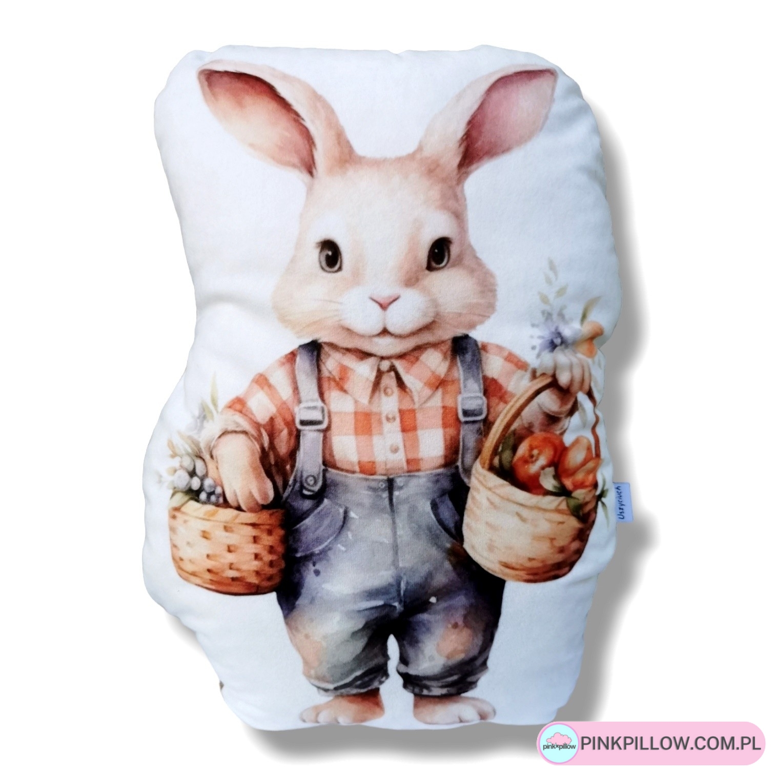 Wielkanocna poduszka z nadrukiem w Króliczka. Uszyta z mikrofazy oraz z mięciutkiego polaru minky w kolorze beżowym. W wewnątrz poduszka wypełniona jest najwyższej jakości antyalergiczną kulką silikonową.