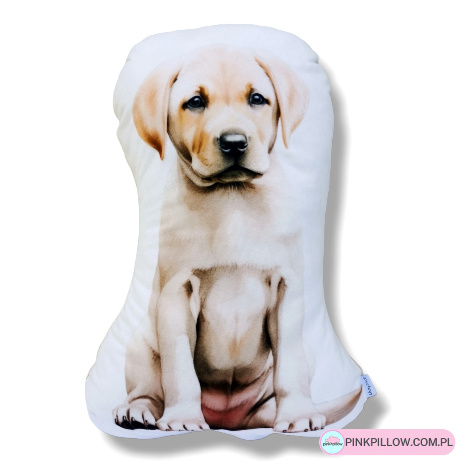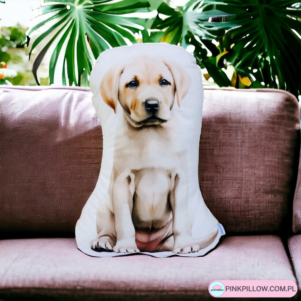 Poduszka z nadrukowanym motywem psa rasy Labrador retriever, uszyta z mikrofazy z wzorem pieska i z mięciutkiego polaru minky w kolorze beżowym. Wypełnienie poduszki to najwyższej jakości antyalergiczna kulka silikonowa. Poduszka może pełnić funkcję ozdobną, lub funkcjonować jako poduszka do spania. Jest mięciutka, ma wyraziste kolory a całość jest bardzo realistyczna.