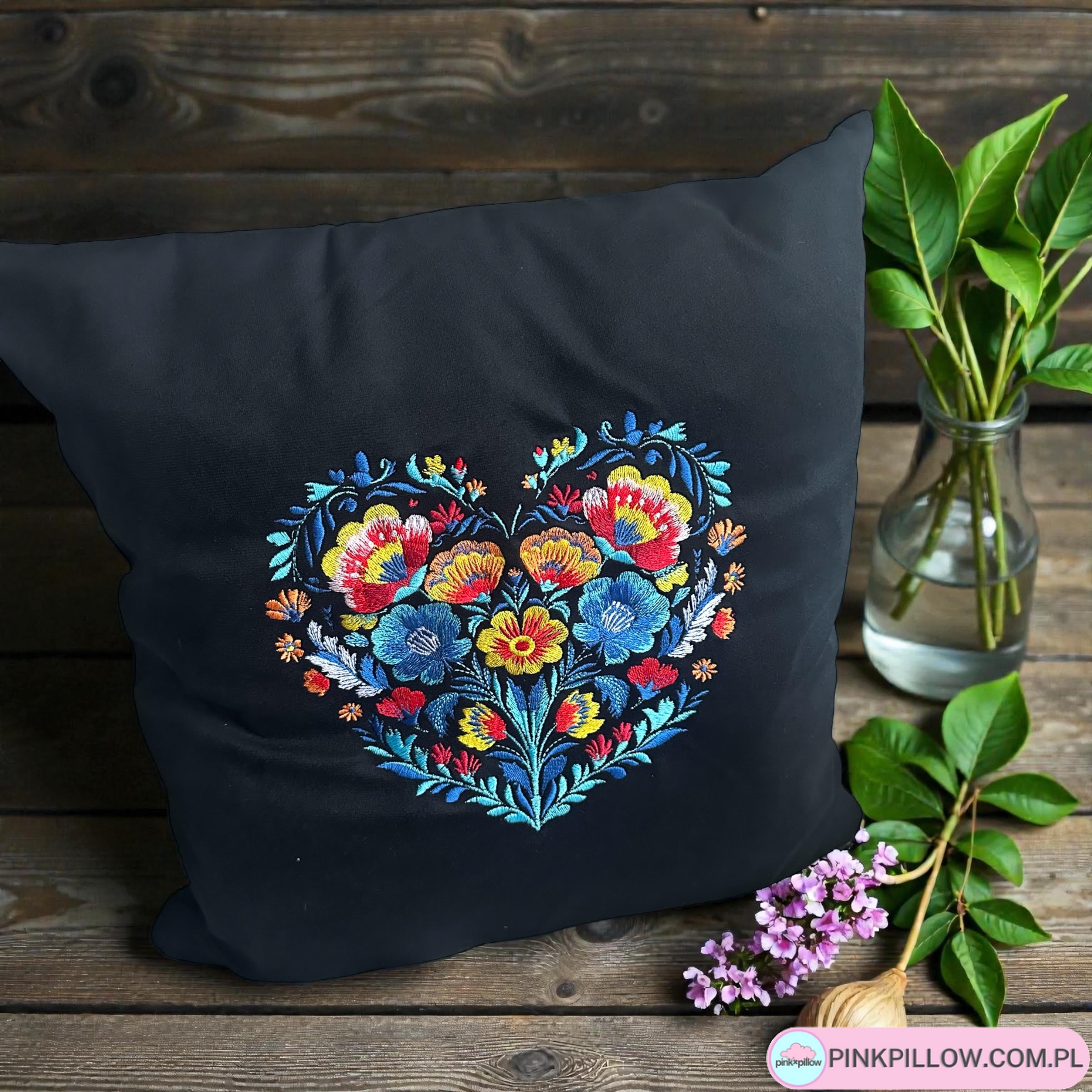 Poszewka na poduszkę o standardowym rozmiarze 40×40 cm, zdobiona pięknym kwiatowym, ludowym wzorem.