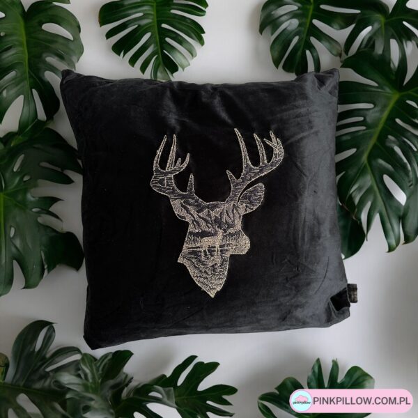 Poszewka velurowa Czarna z brokatowym haftem w stylu Glamour. Na poduszce znajduje się Jeleń.