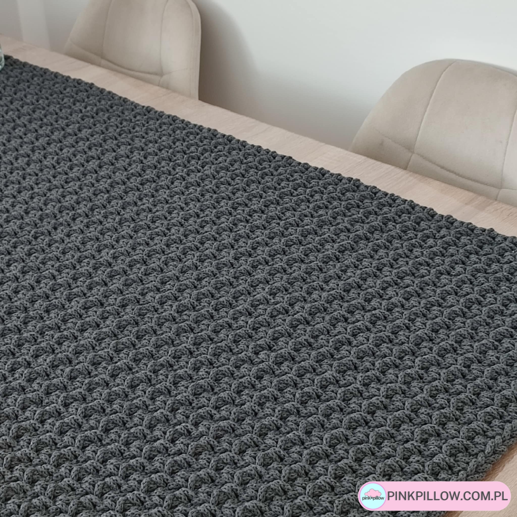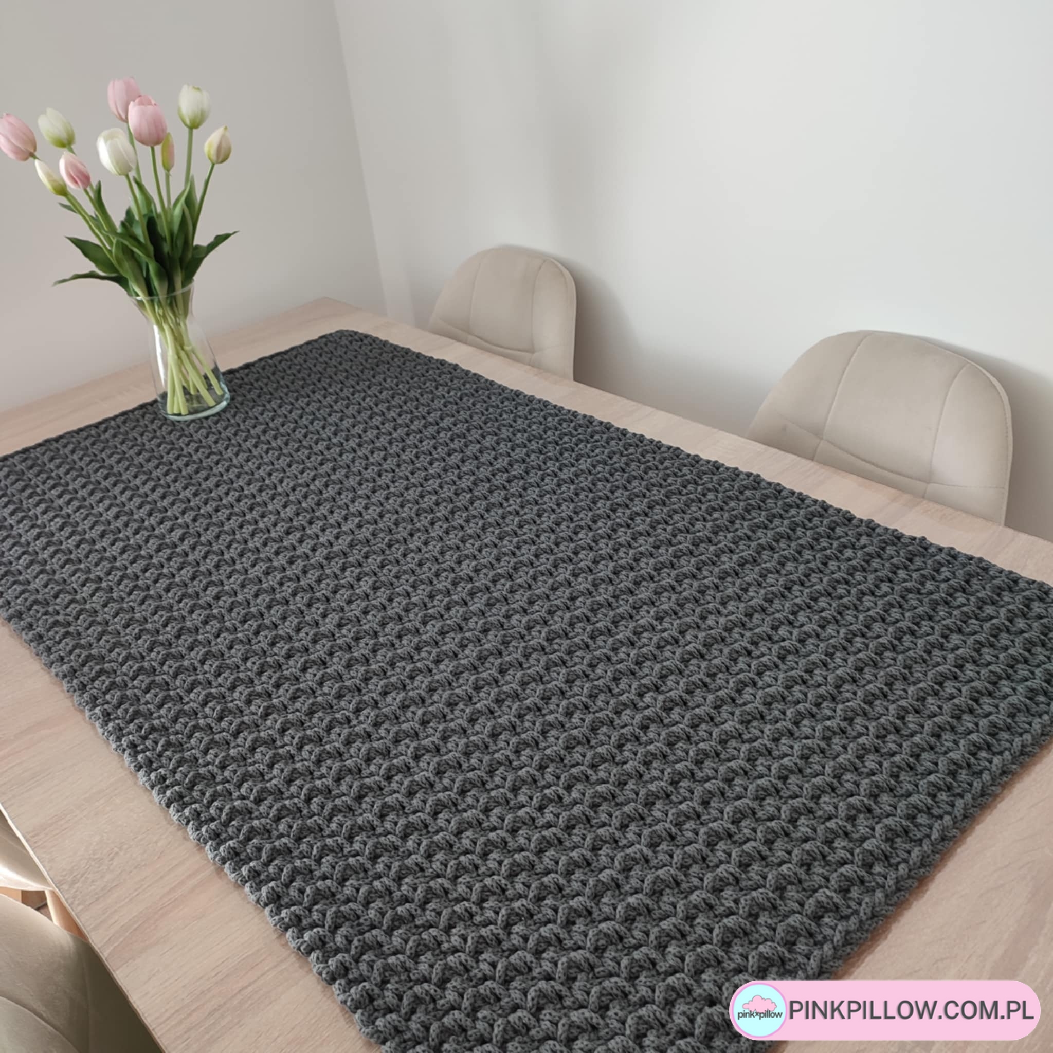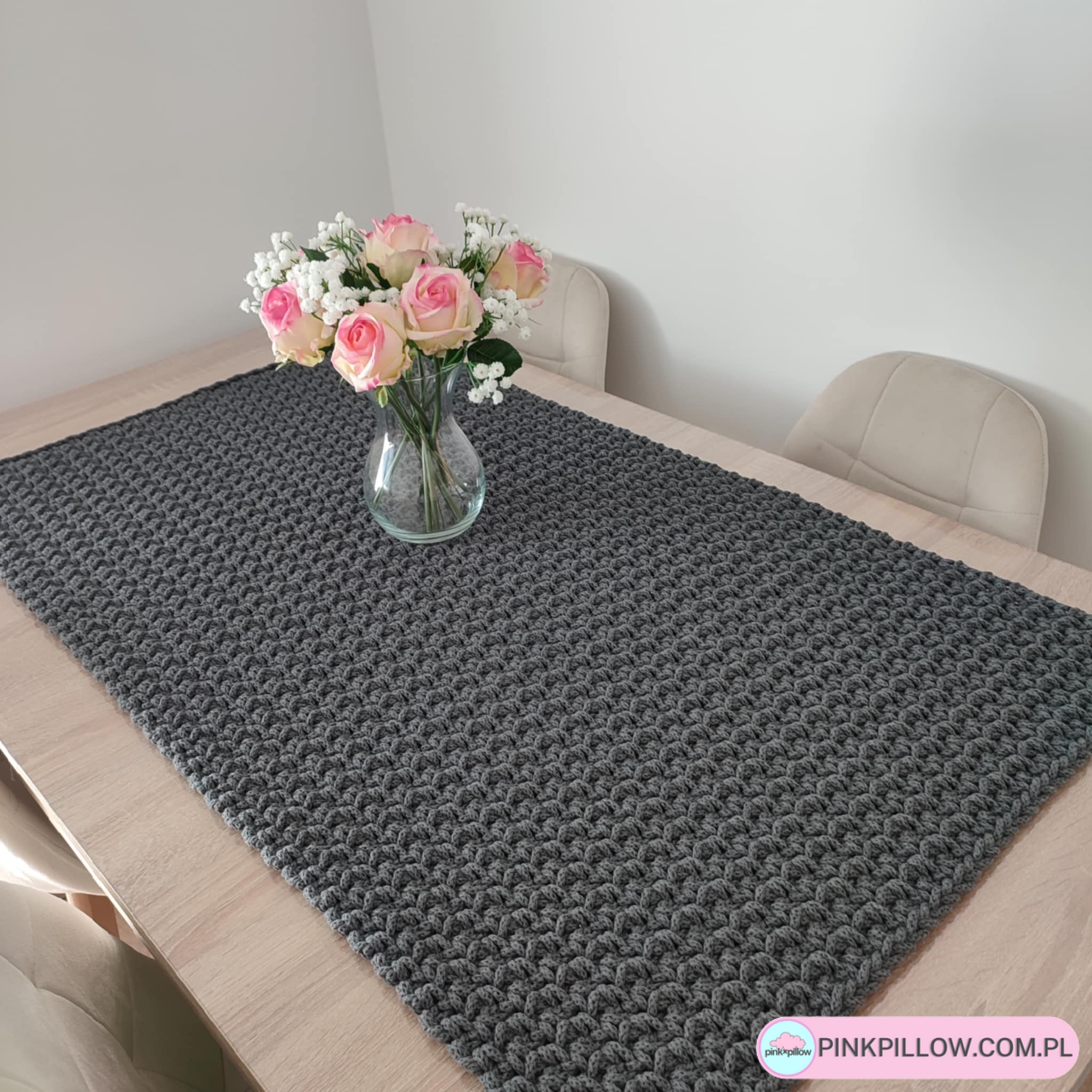 Prostokątna serweta o wymiarach 60 x 110 cm, o gładkim prostym wzorze. Wykonana metodą szydełkowania z polskiego sznurka bawełnianego o przekroju 5mm. Idealna na stół do jadalni lub kuchni. Jest gruba, zabezpieczy blat stołu, ale będzie też fajnym dodatkiem do wystroju wnętrz. Jest łatwa w utrzymaniu w czystości. Można prać ją w pralce w 30 stopniach i wirować. Suszyć należy rozłożoną na płasko. (Duże rozmiary należy prać chemicznie).