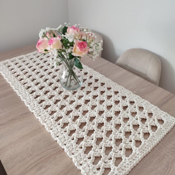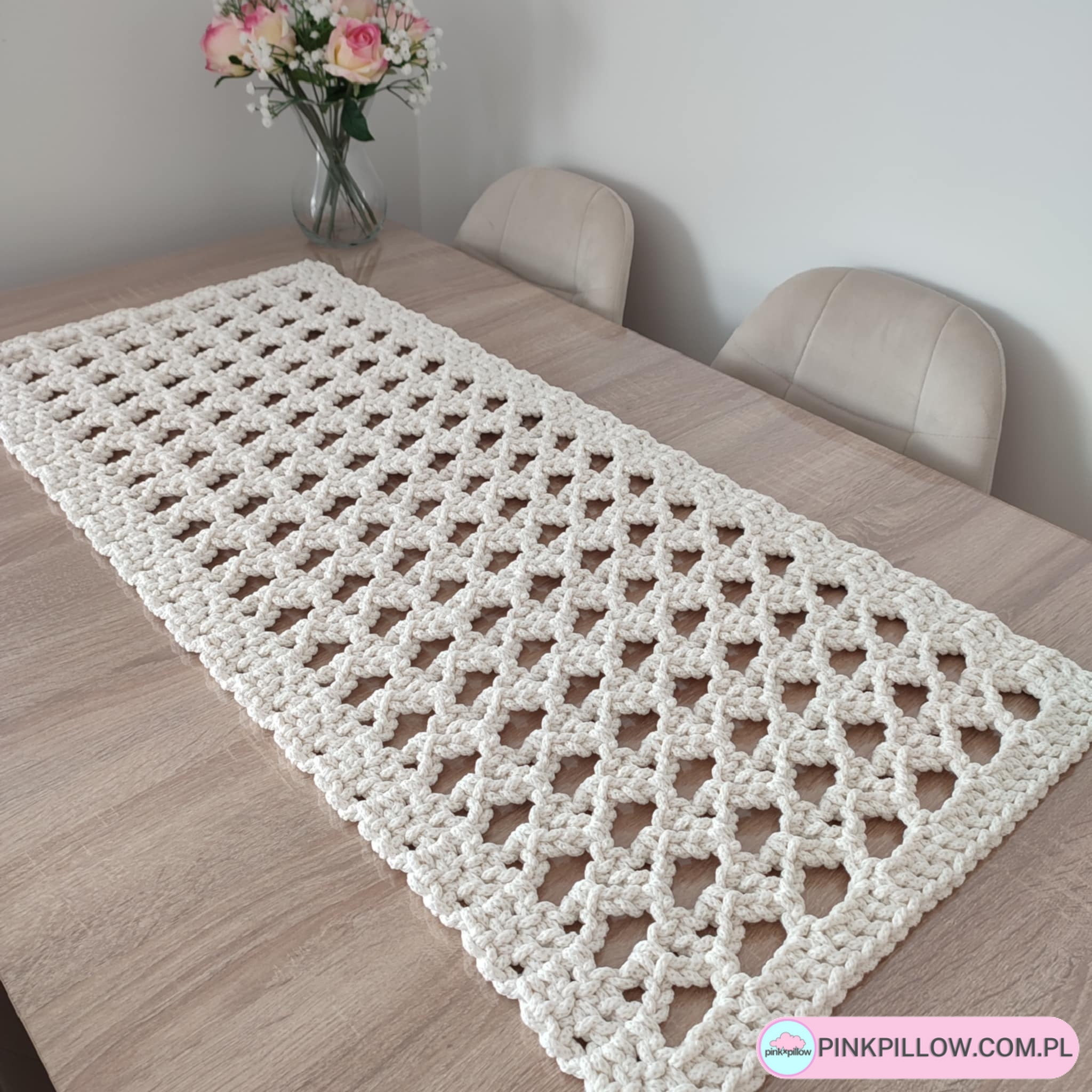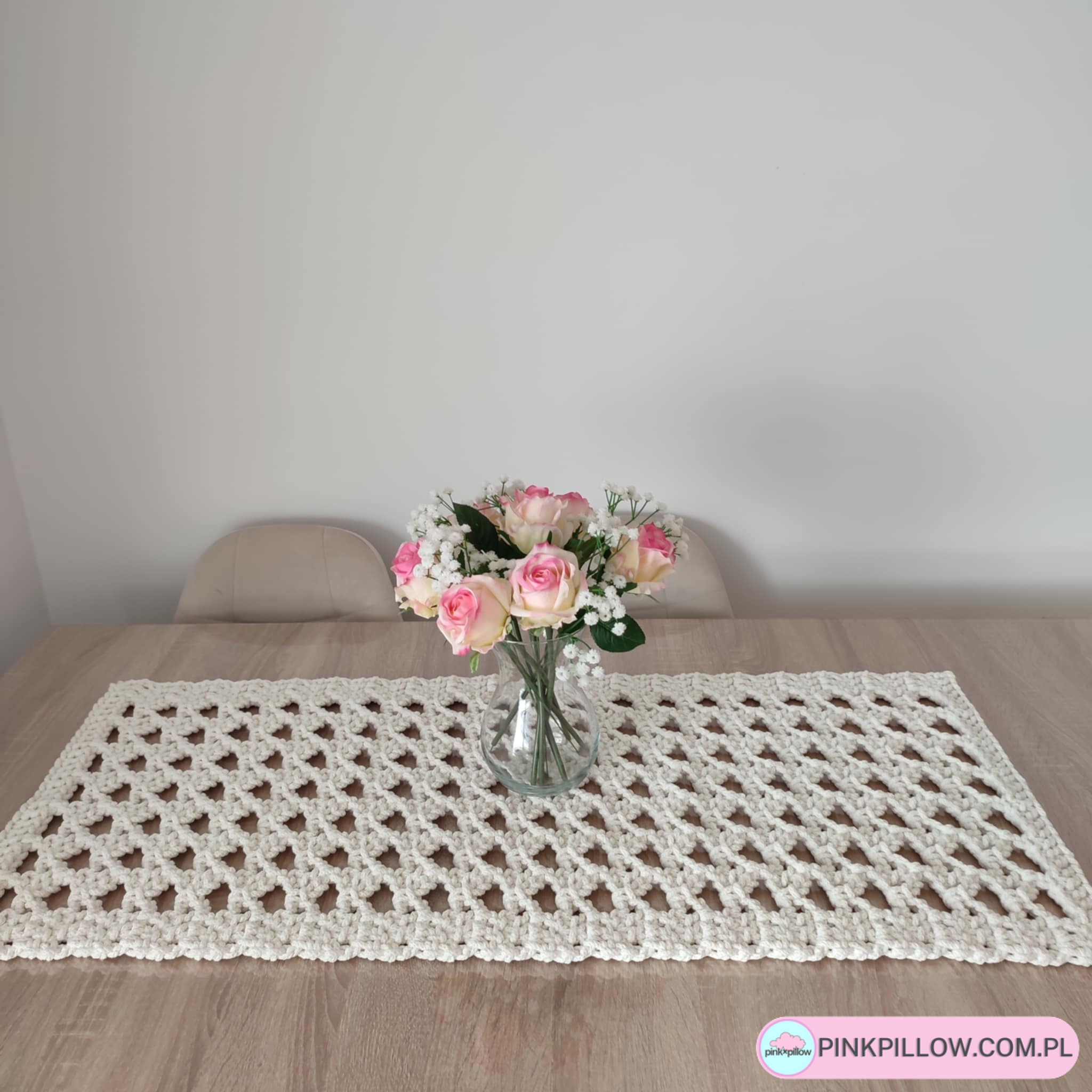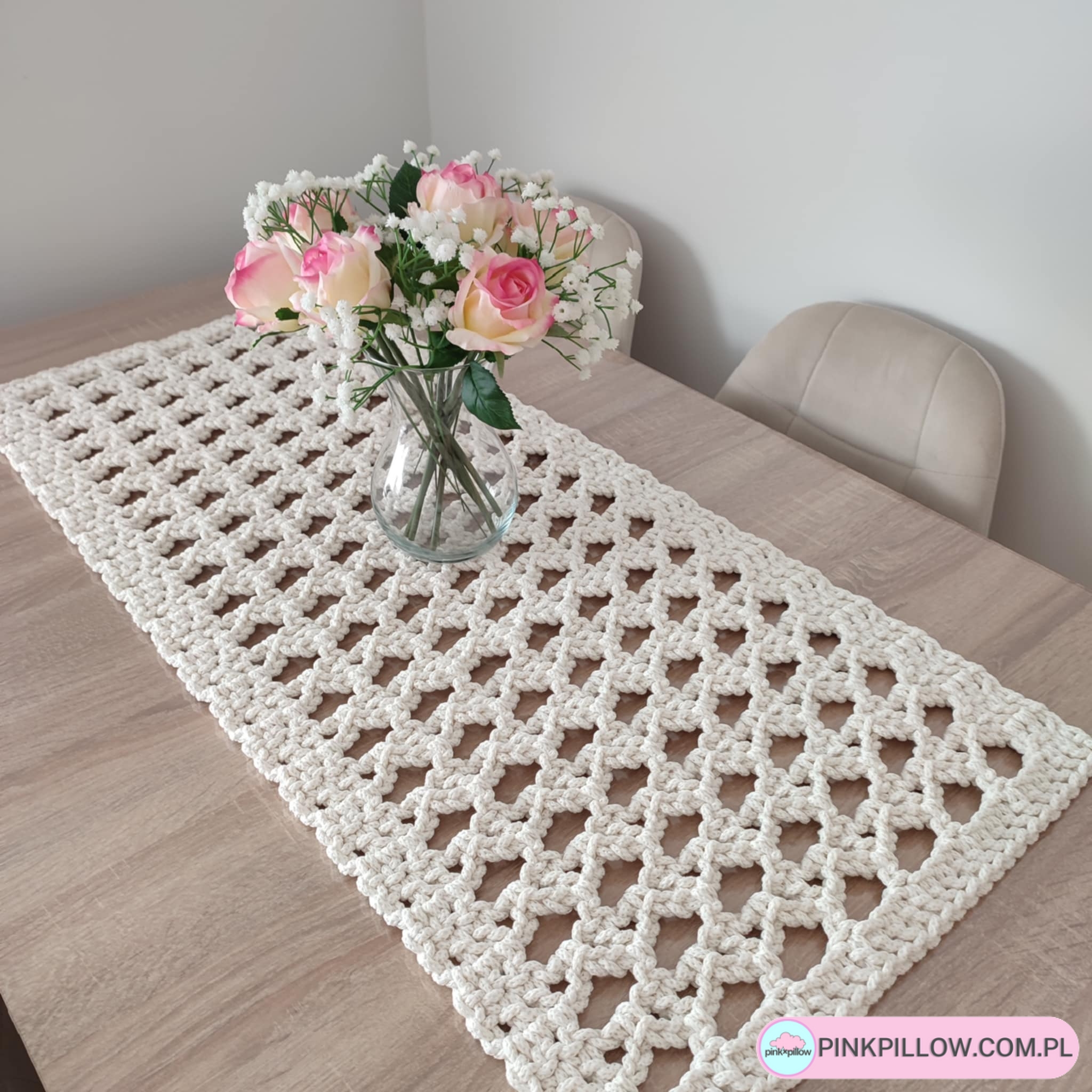 Prostokątny Bieżnik siatka na stół o wymiarach 45 x 100 cm, wykonany za pomocą szydełka, sznurka bawełnianego 5 mm polskiej produkcji no i rąk. Dostępne różne kolory sznurka do wyboru (ponad 30 kolorów). Bieżnie świetny do różnych wnętrz, będzie funkcjonalną ozdobą która poza aspektami wizualnymi będzie chronić powierzchnię stołu. W przypadku poplamienia bieżnik można prać w pralce w 30 stopniach i wirować. Suszyć należy rozłożony na płasko.