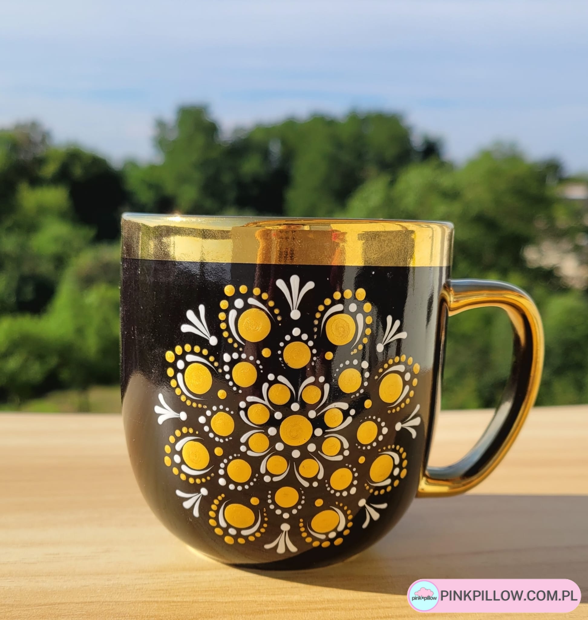 Kubek porcelanowy ręcznie malowany w Złotą Mandalę o pojemności 280 ml o subtelnie profilowanych łukach został pomalowany ręcznie metodą dot painting specjalnymi farbami przeznaczonymi do malowania szkła i porcelany. Farba ta może mieć kontakt z żywnością i gorącymi napojami. Po naniesieniu wzoru kubek został wypalany, co spowodowało, że farba jest utrwalona i podczas mycia wzór nie zostanie naruszony.