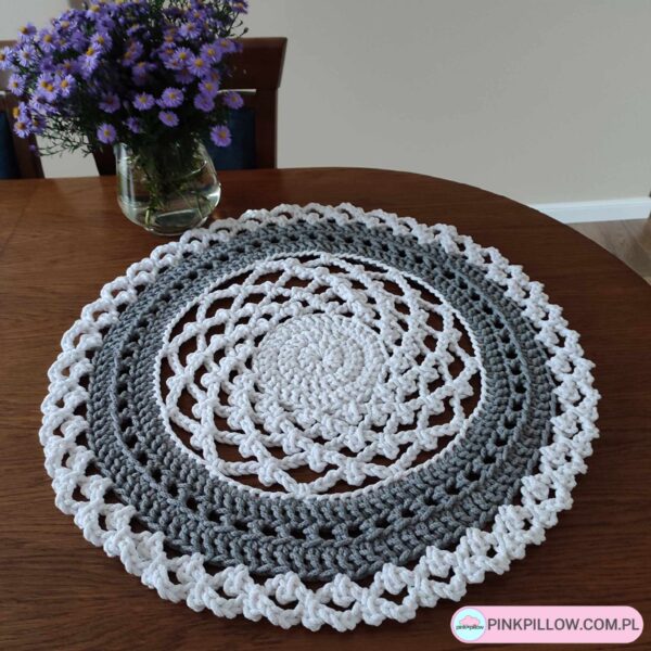 Serweta okrągła o średnicy 70 cm, wykonana metodą szydełkowania z polskiego sznurka bawełnianego 5mm. Pięknie ozdobi każde wnętrze. Idealna na stolik kawowy lub duży stół. Jest łatwa w utrzymaniu w czystości. Można prać w pralce w 30 stopniach i wirować. Suszyć należy rozłożoną na płasko.