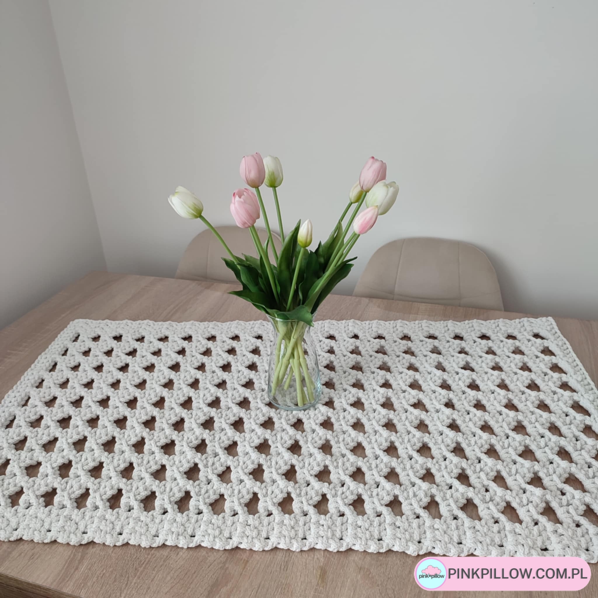Serweta prostokątna o wymiarach 55 x 100 cm, wykonany metodą szydełkowania z polskiego sznurka bawełnianego 5 mm. Świetny do różnych wnętrz. Ozdobi, doda uroku, wprowadzi przytulny klimat. Jest łatwy w utrzymaniu w czystości. Można prać w pralce w 30 stopniach i wirować. Suszyć należy rozłożony na płasko.