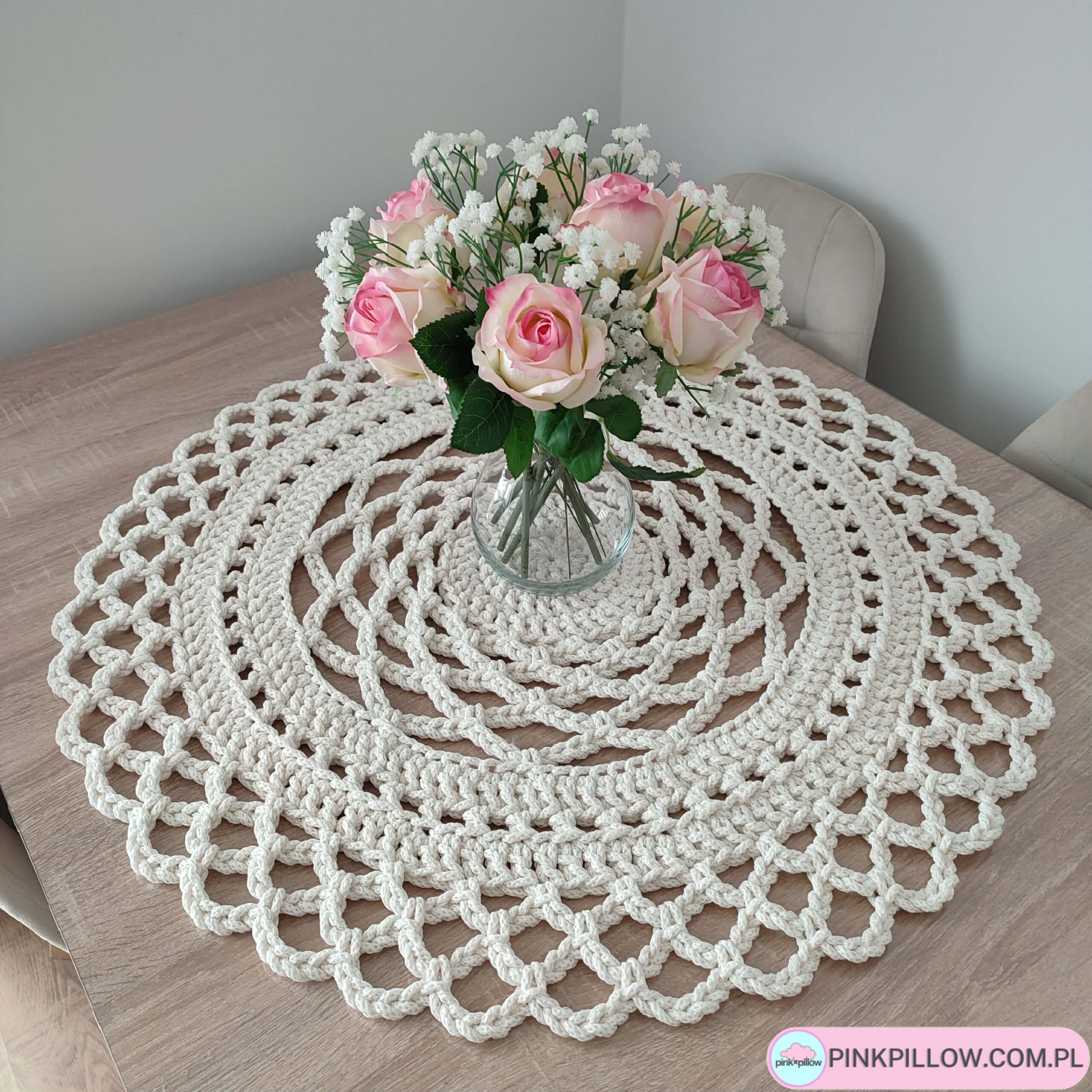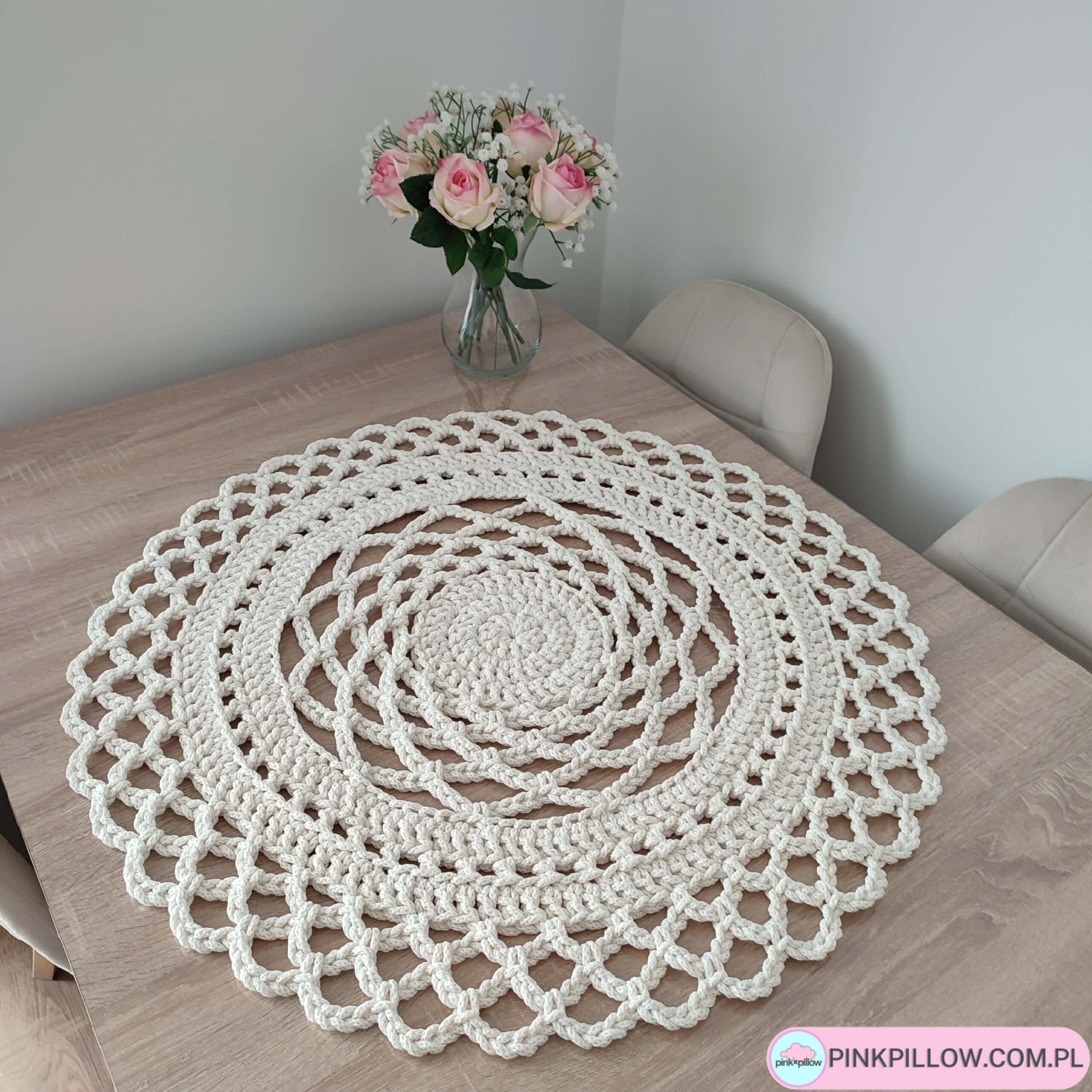 Serweta o średnicy 75cm, wykonana metodą szydełkowania z polskiego sznurka bawełnianego 5mm. Będzie pięknym dodatkiem do każdego wnętrza. Idealna do jadalni na duży stół, lub do salonu na stolik kawowy.