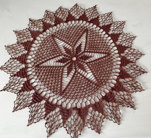 Urocza serwetka wykonana w całości ręcznie z bawełnianego kordonka, pięknym dekoracyjnym wzorem. Usztywniona. Średnica 65 cm, kolor brązowy w odcieniu czekoladowym.