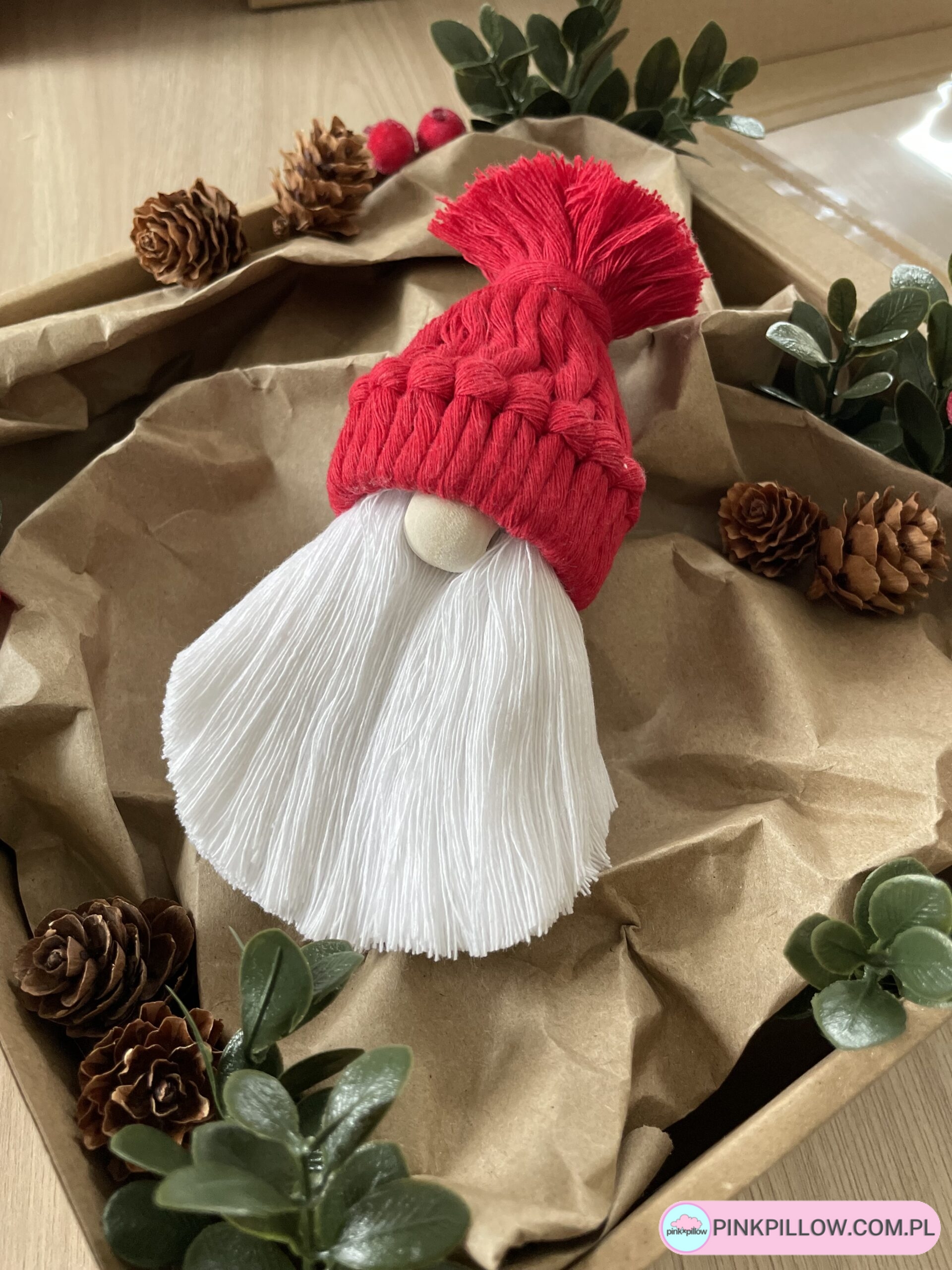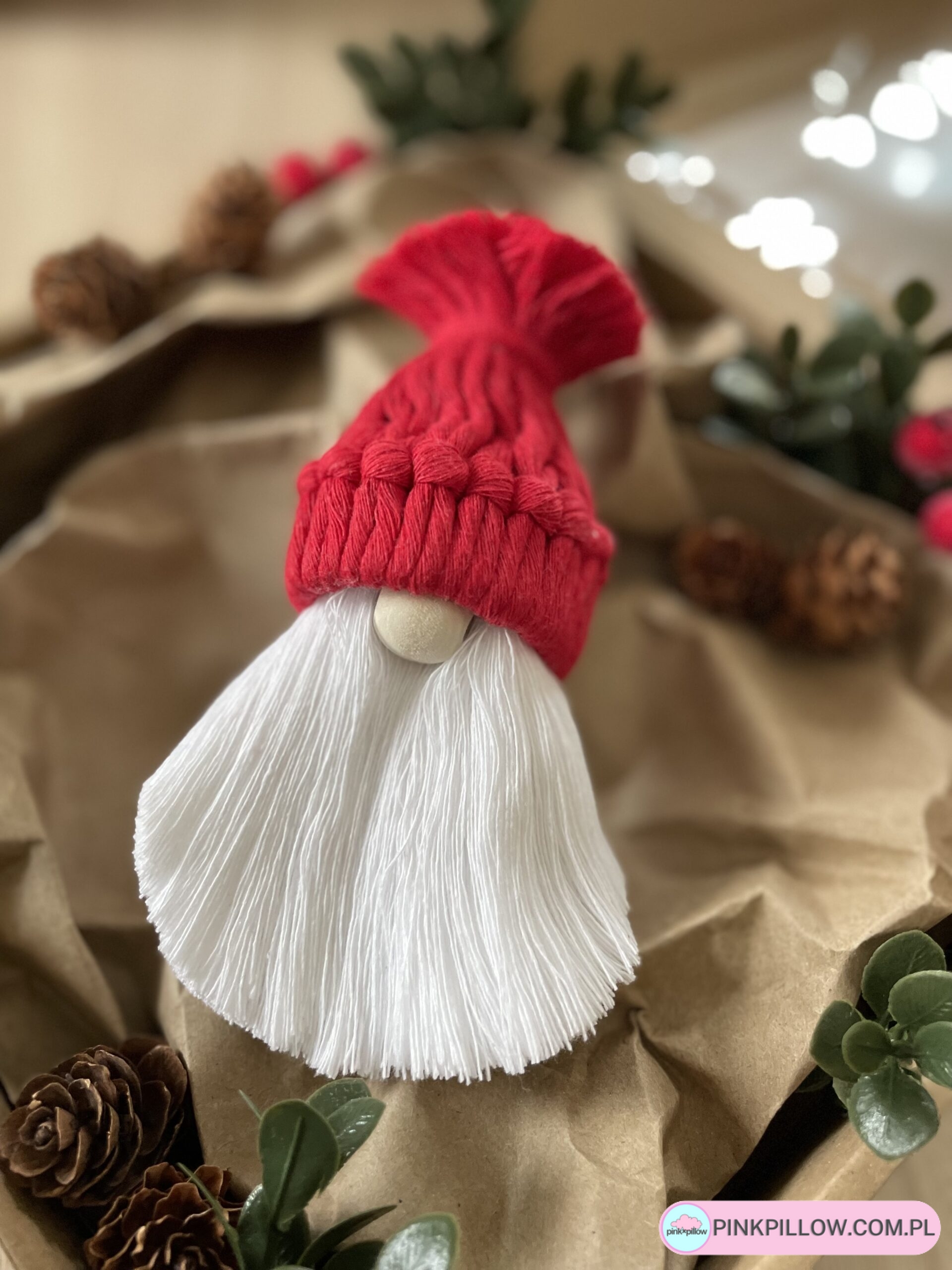Minimalistyczna Świąteczna zawieszka w formie Mikołaja, wykonana ręcznie ze sznurka bawełnianego. Charakterystyczna czerwona czapka z plecionym splotem oraz rozczesana, jasna broda tworzą efektowną, a jednocześnie prostą dekorację świąteczną. Drewniana kulka w roli główki nadaje całości naturalny, nowoczesny wygląd.