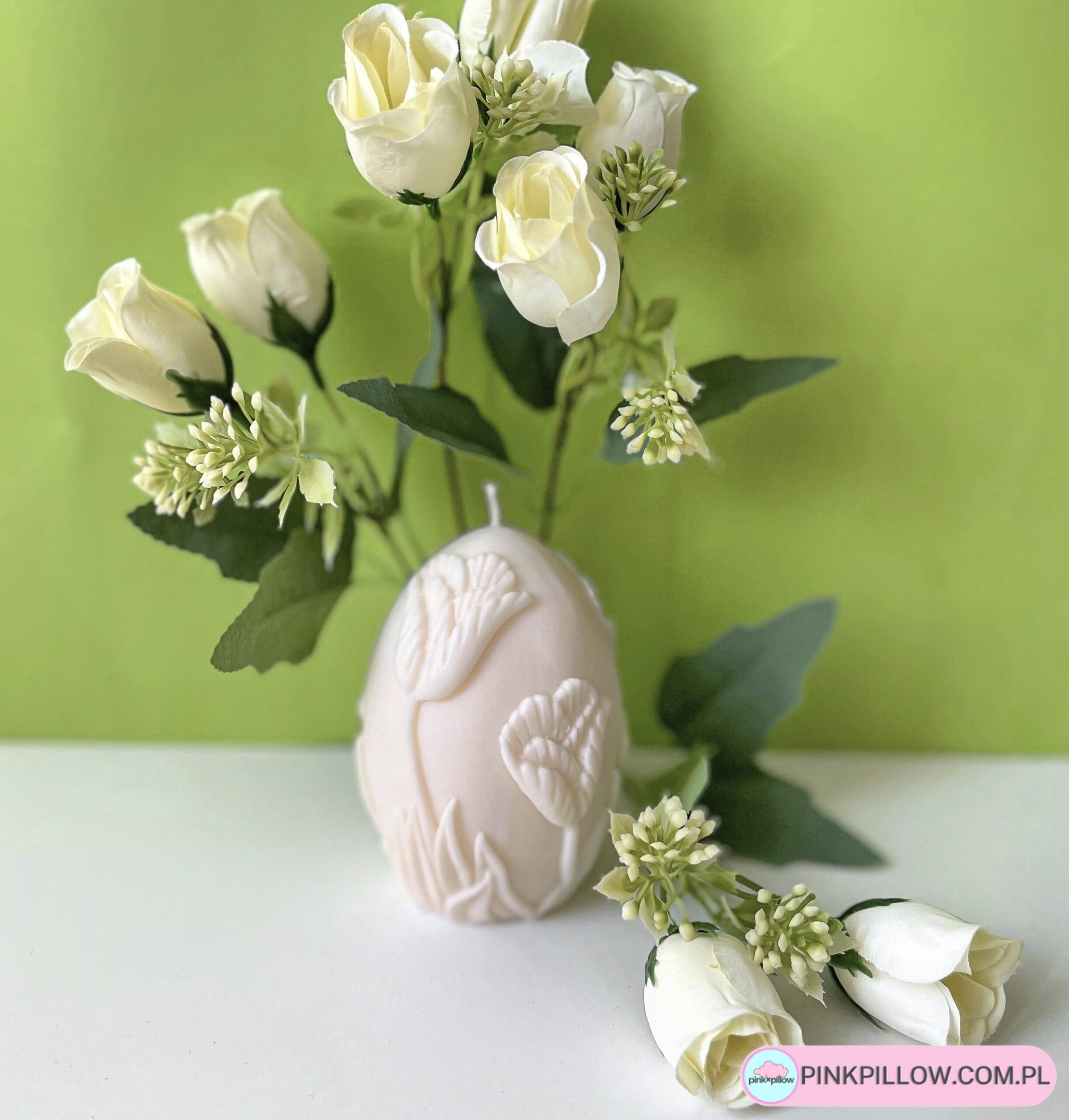 Świeca Jajko Wielkanocne składa się w 100 % z naturalnego i biodegradowalnego wosku sojowego oraz bawełnianego knota. Świeczki są bezzapachowe.