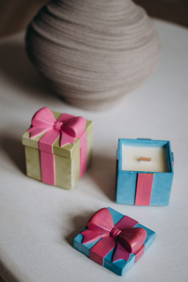 🎁✨Ta wyjątkowa świeca to nie tylko aromatyczny dodatek do wnętrza, ale i oryginalna dekoracja, która wygląda jak mały, elegancko zapakowany podarunek. Ręcznie wykonana z gipsu, w pastelowych odcieniach, ozdobiona uroczą kokardą – świeca w tej formie jest idealnym pomysłem na prezent dla bliskich lub jako dekoracyjny element, który wprowadzi do domu wyjątkowy klimat.