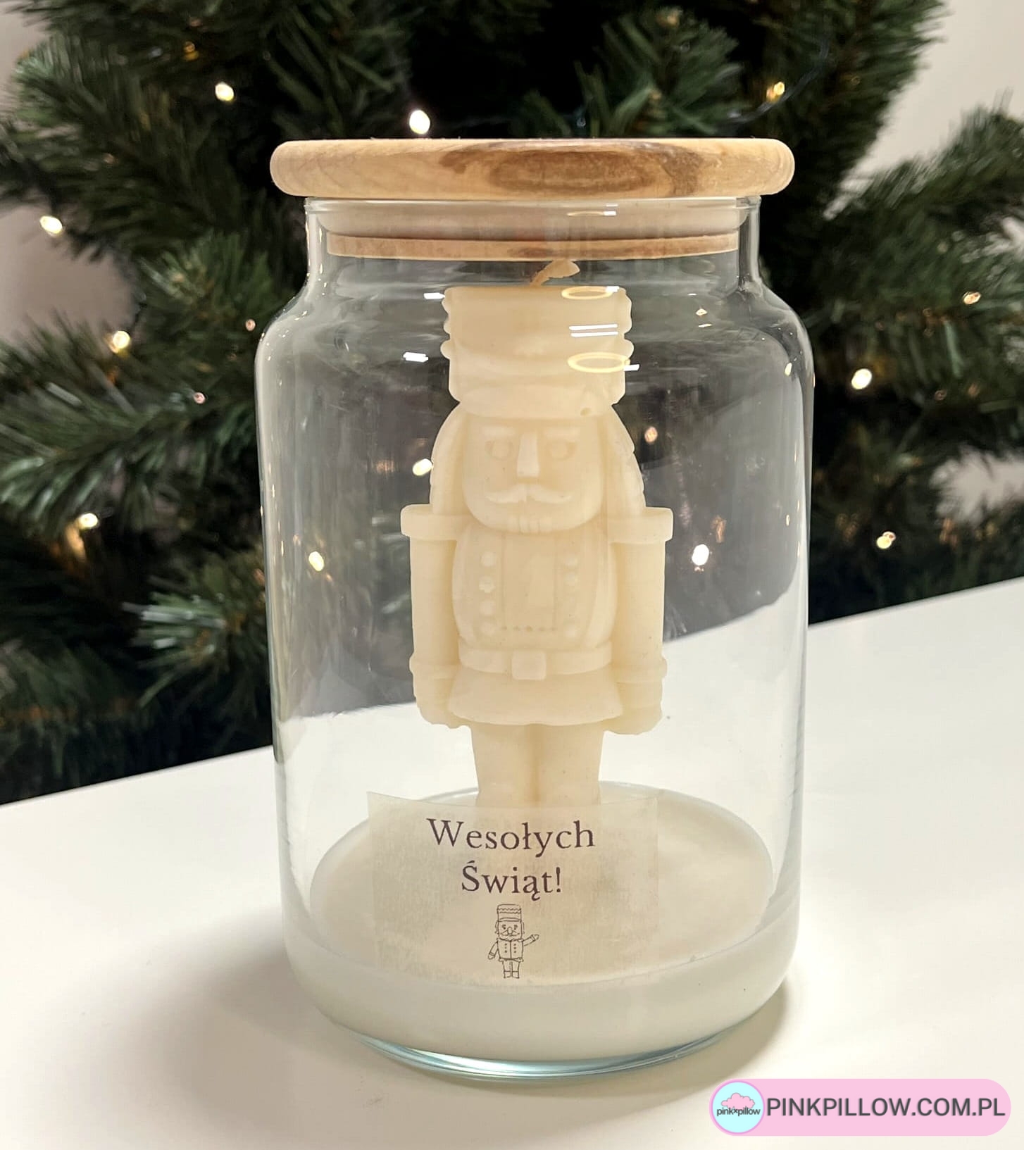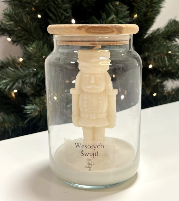 Ręcznie robiona świeczka z naturalnego sojowego wosku , zamknięta w eleganckim, szkle z przykrywką. Wewnątrz szkła znajduje się Dziadek do Orzechów. Świeca może być dekoracją, ale również być palona jak normalna świeczka wolnostojąca. Dostępne są różne zapachy do wyboru.