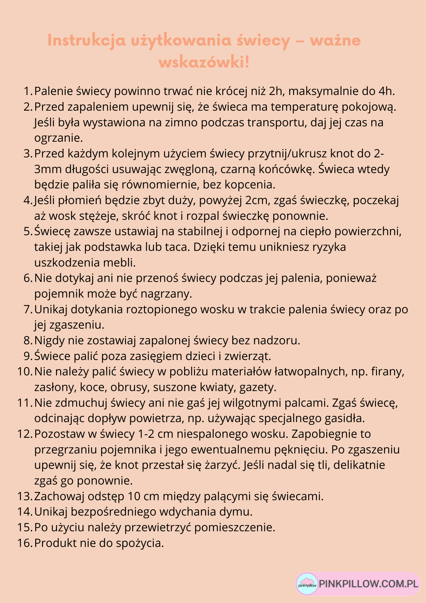 - Nie dotykaj ani nie przenoś świecy podczas jej palenia ani przez 30 minut po zgaszeniu, ponieważ pojemnik może być nagrzany.