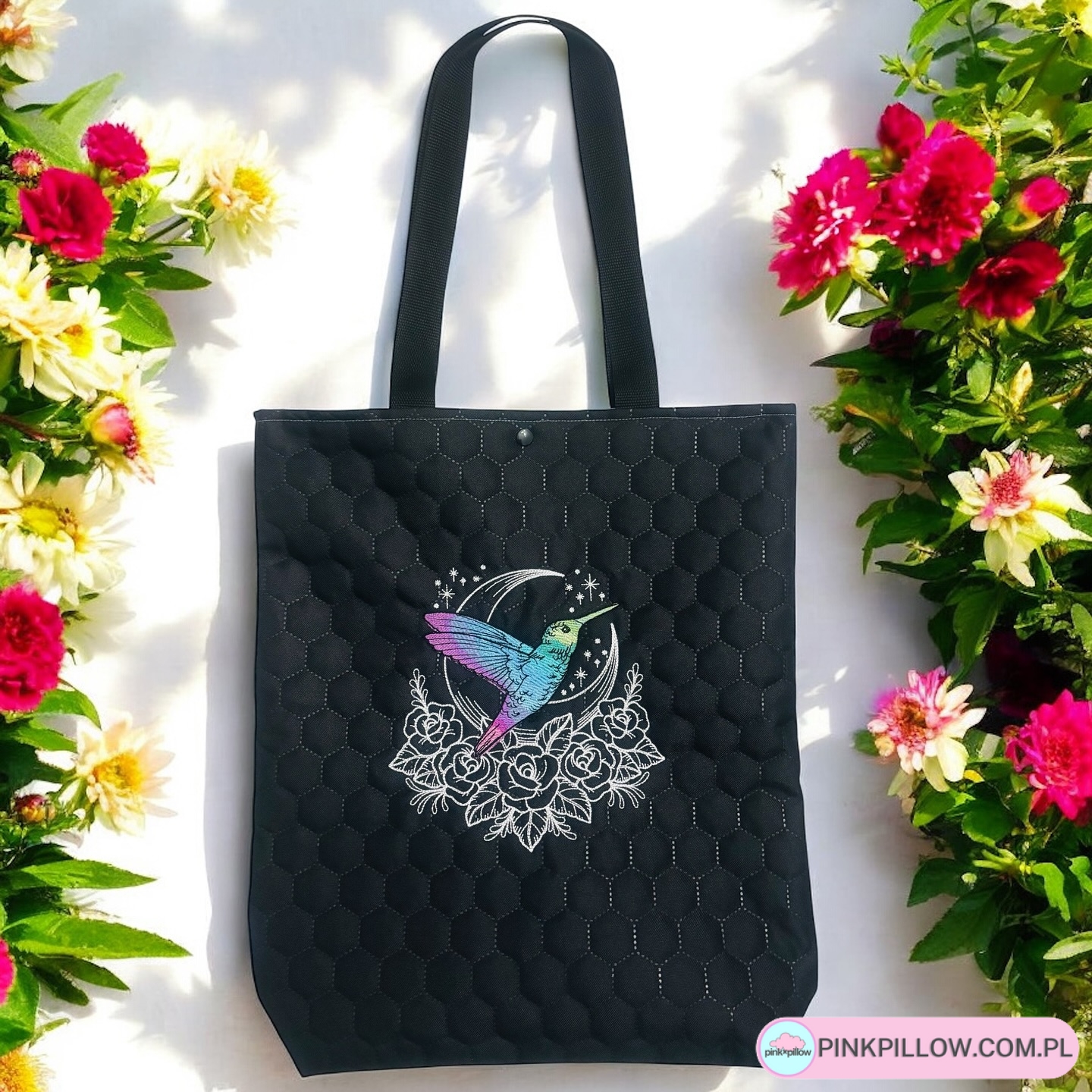 Duża i niezwykle pojemna Czarna torba pikowana da schronienie wszystkim Twoim rzeczą. Jest idealna na wiele okazji – na zakupy, do pracy, szkoły i na co dzień. Torba zdobiona w Kolorowego Koliberka w kwiatach.