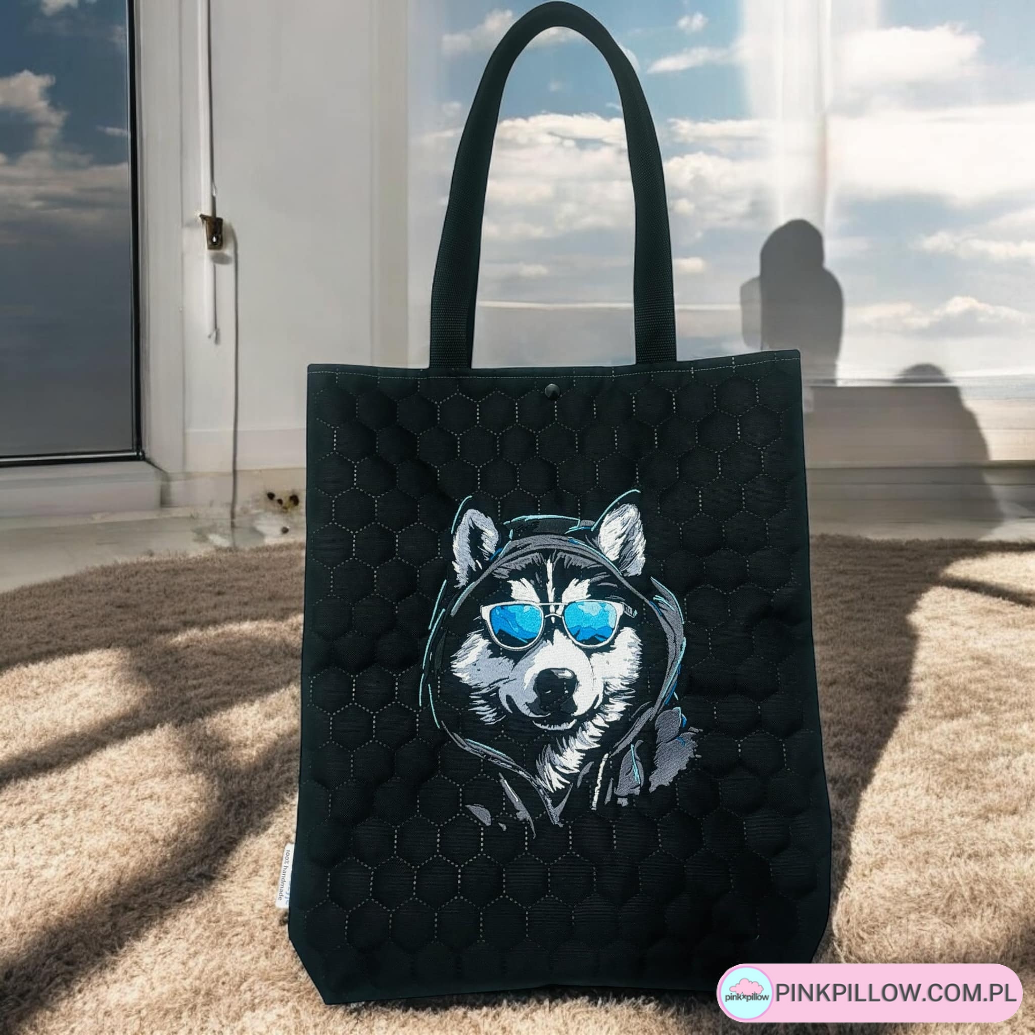 Duża torba męska pikowana w kolorze czarnym z haftowanym Psem w kapturze – idealna na wiele okazji.