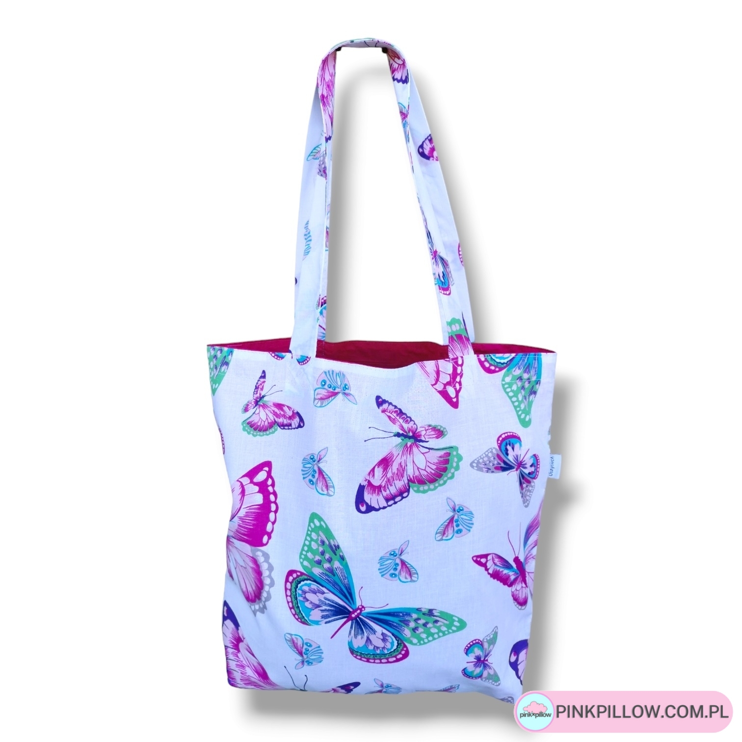 Wymień plastikowe jednorazówki, zrywki na jedną a porządną Płócienną Torbę – uszyta w całości z bawełny z motywem Motyli i bawełnianą różową podszewką wewnątrz.