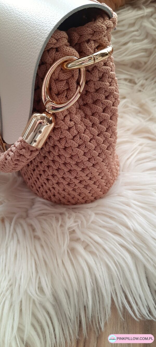 Torebka ręcznie wykonana na szydełku ze sznurka poliestrowego oraz klapą i dnem ze skóry naturalnej (materiały do wykonania torebki pochodzą od Polskiego producenta). w środku znajduje się bawełniana podszewka z małą kieszonką.
