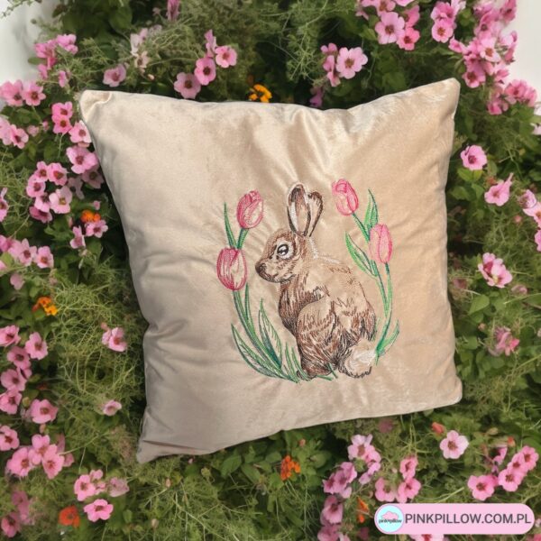 Poszewka velurowa z wyhaftowanym Zającem i kwiatami. Poszewka standardowa 40×40 cm.