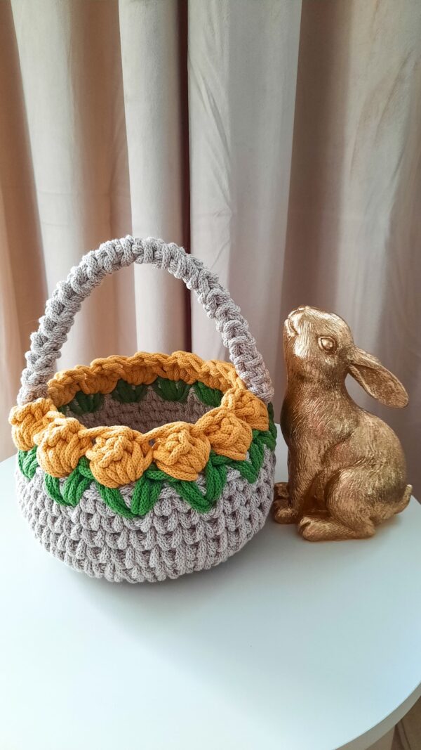 Wielkanocny Koszyk Szydełkowy ze sznurka ozdobiony Tulipanami
