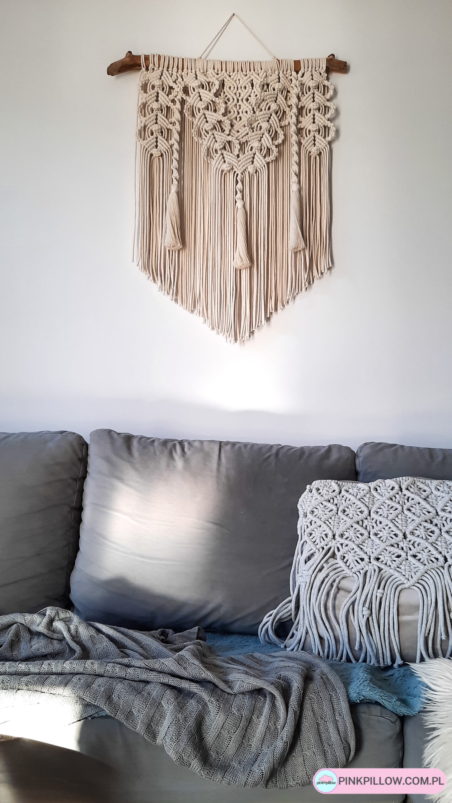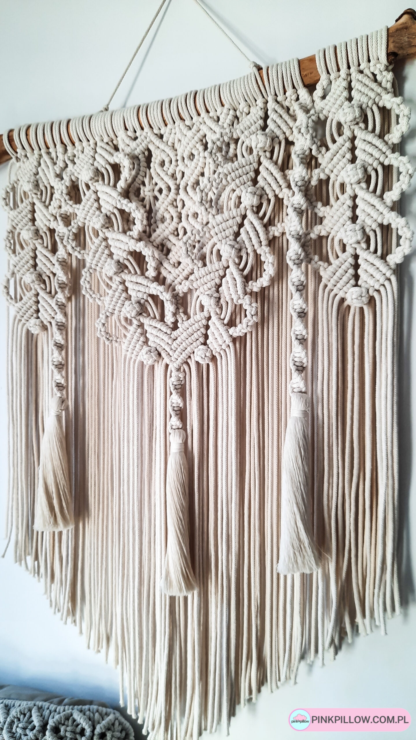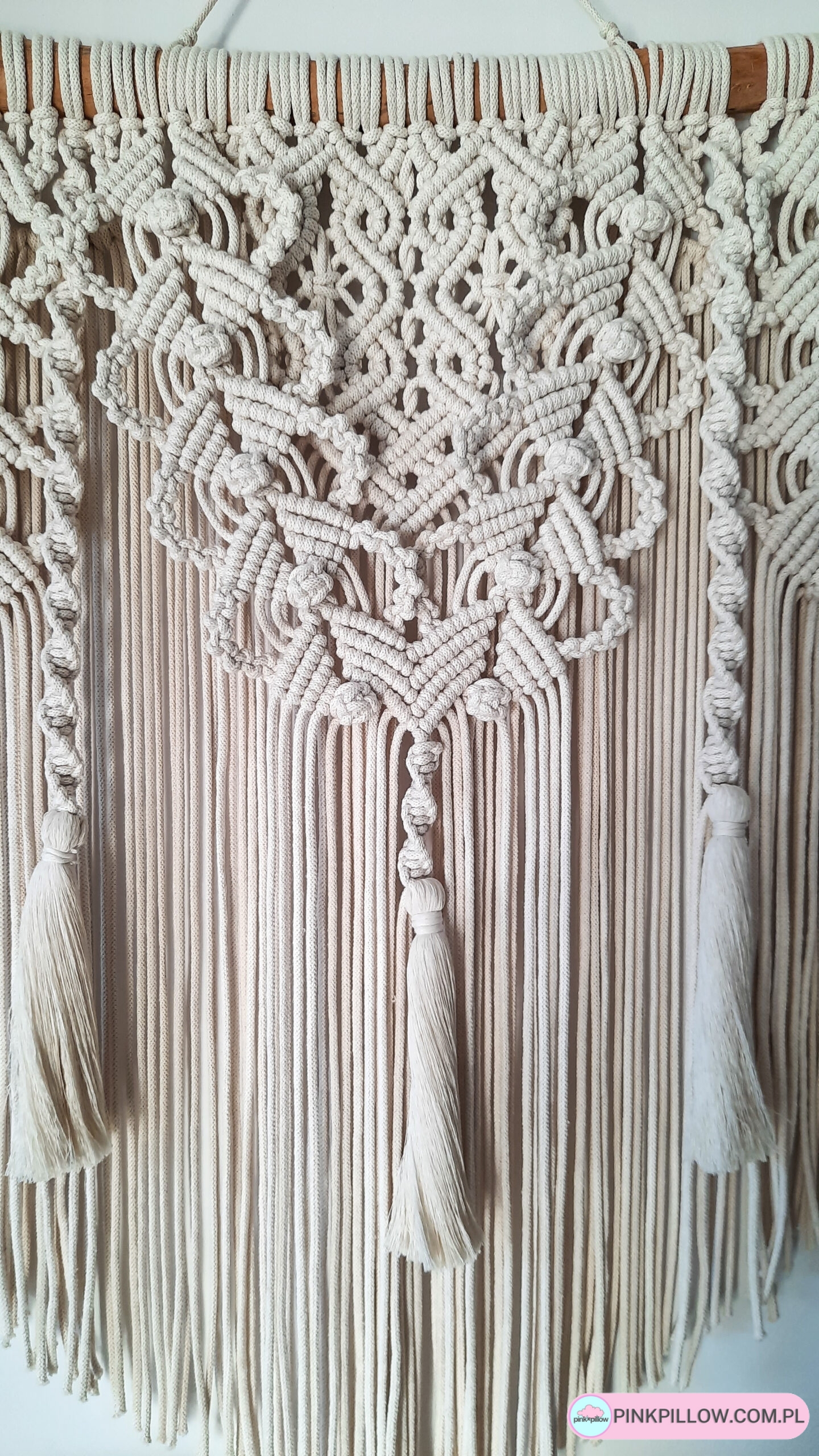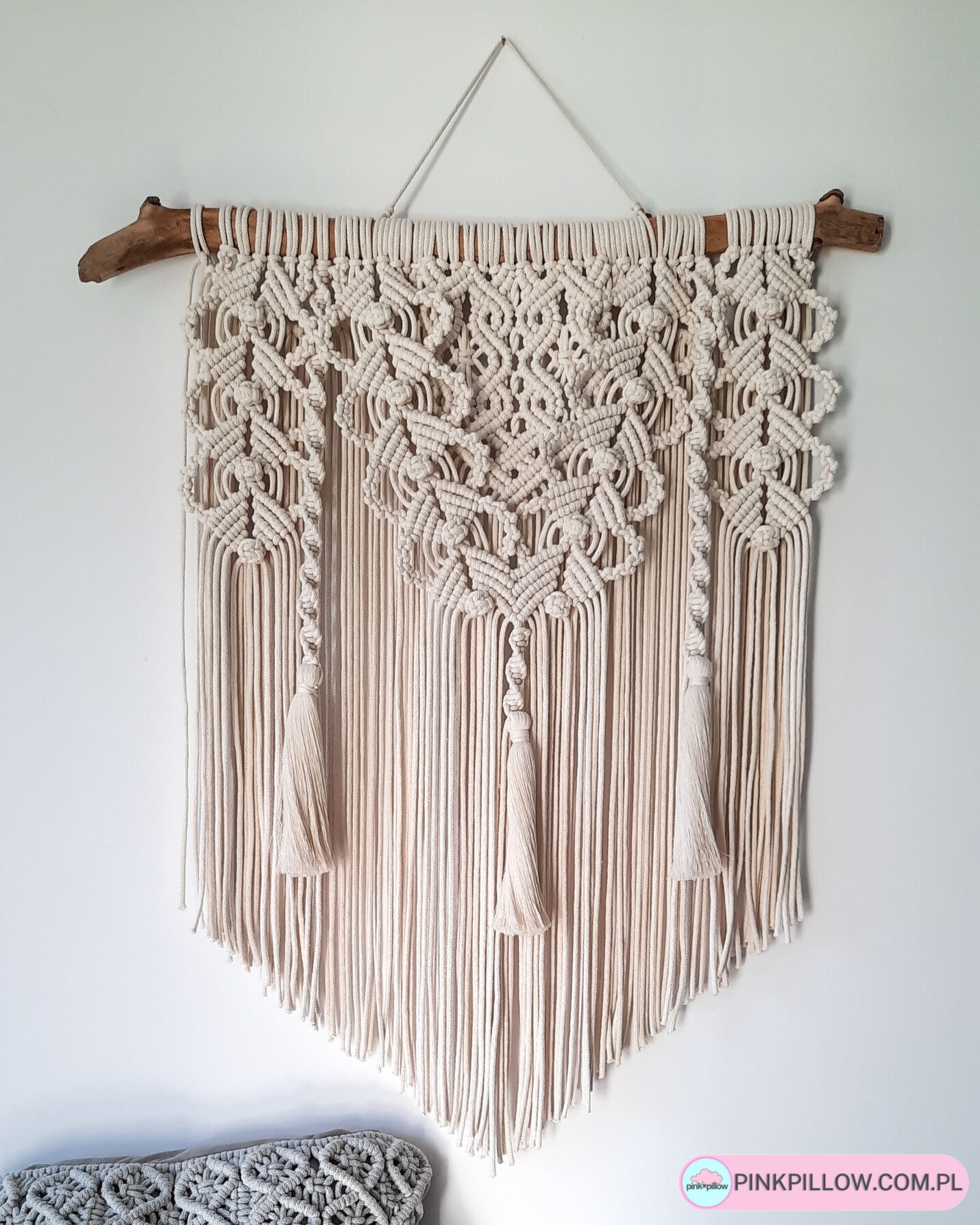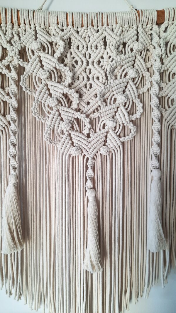 Ręcznie wykonana makrama w naturalnym kremowym kolorze ozdobiona gęstym splotem oraz chwostami.