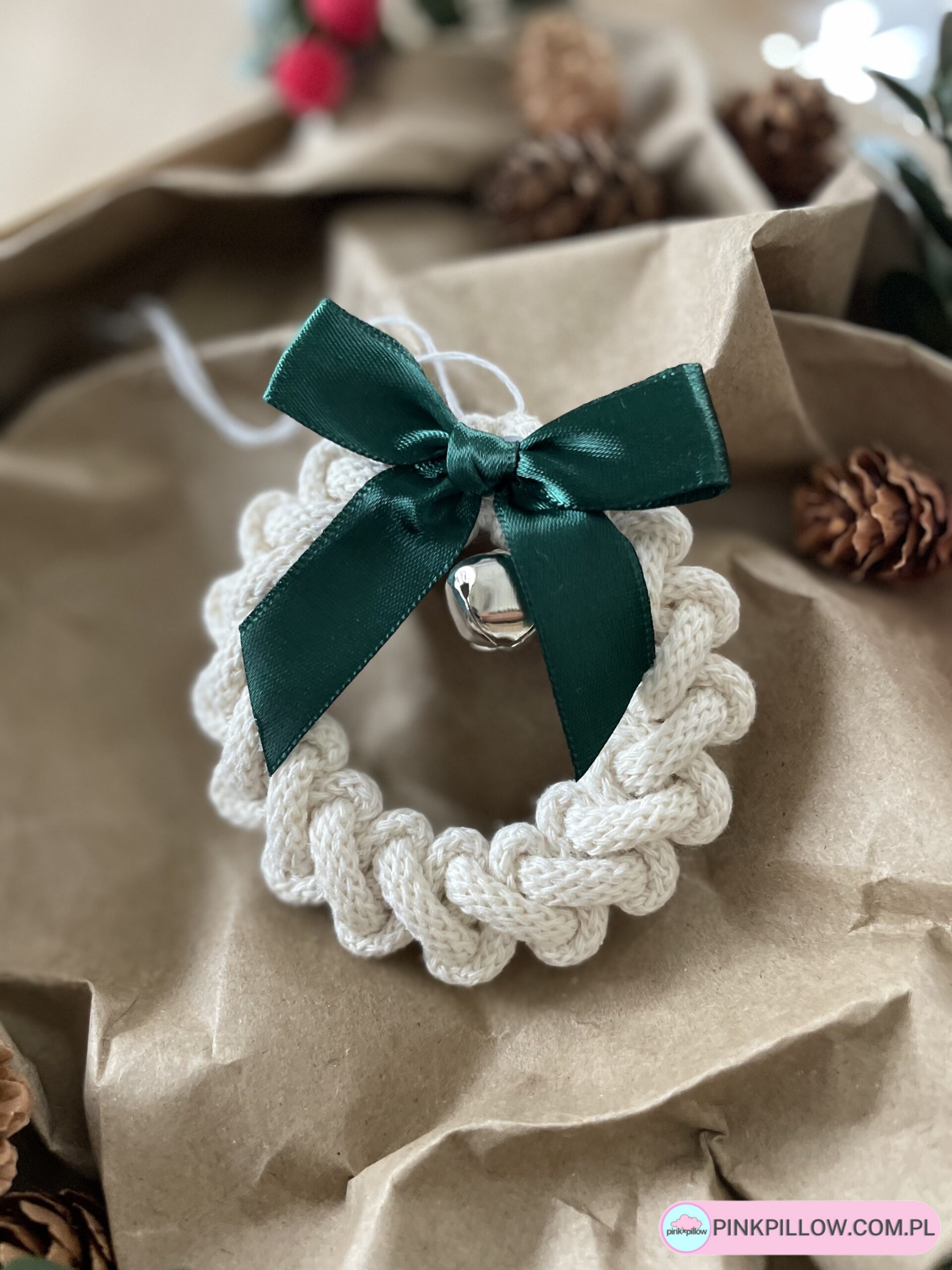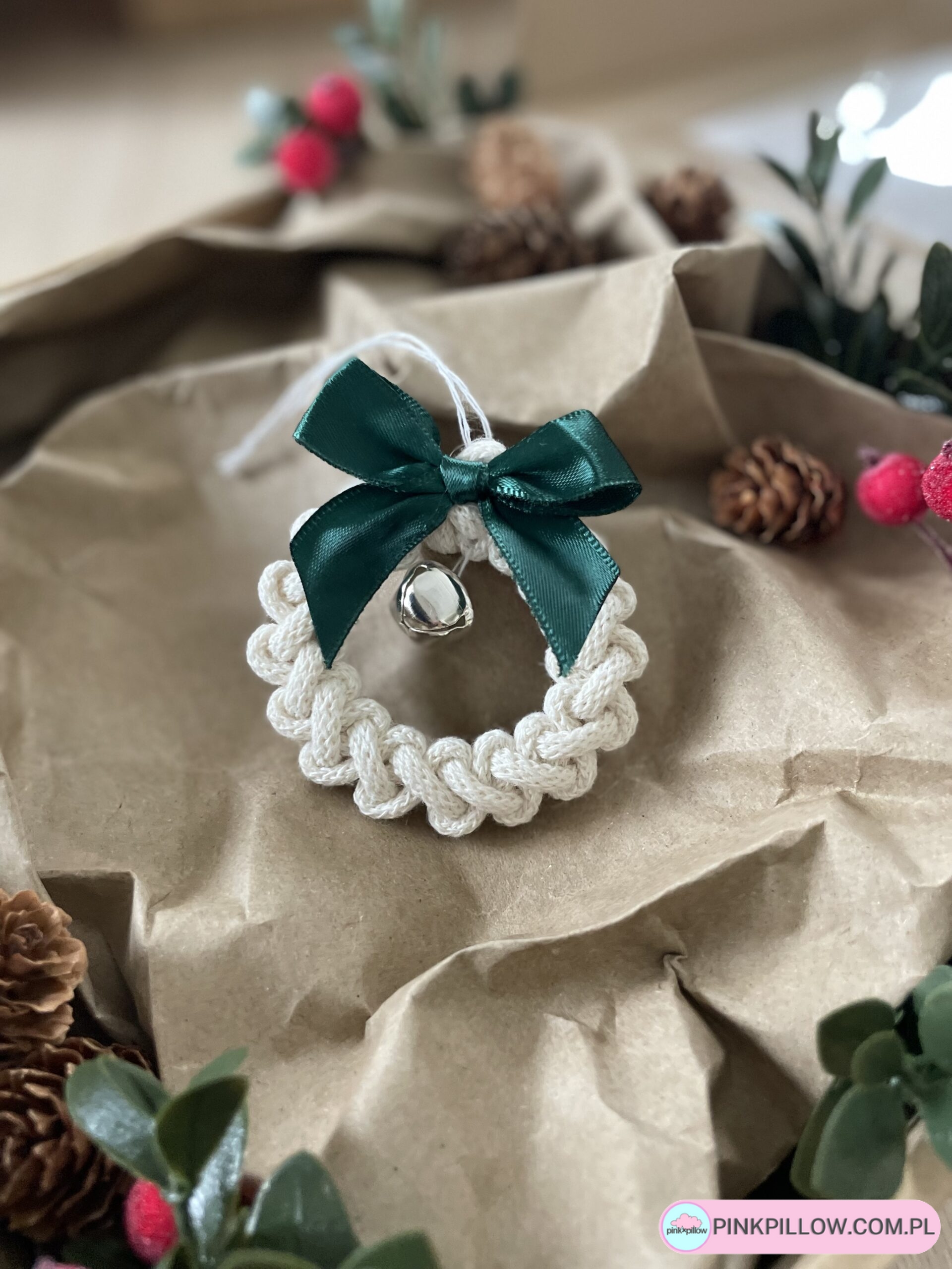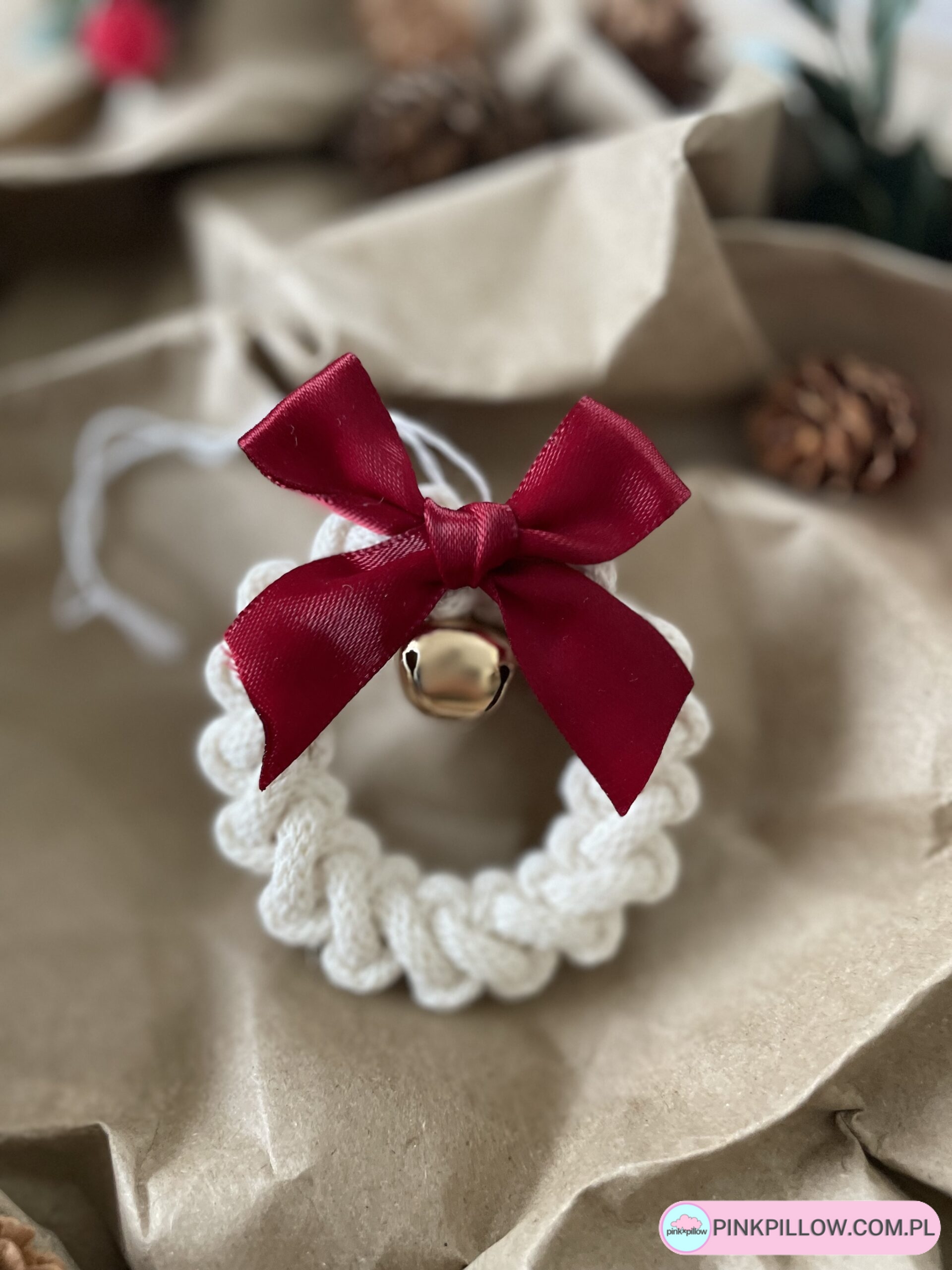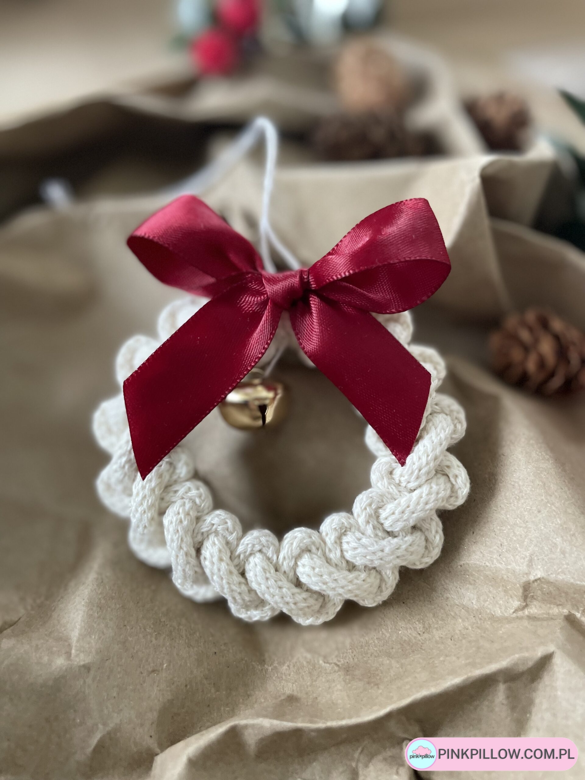 Ręcznie pleciona zawieszka świąteczna w kształcie małego wianka, wykonana ze sznurka w kolorze ecru. Ozdobiona elegancką, bordową kokardą oraz złotym dzwoneczkiem, który dodaje jej klasycznego, świątecznego uroku. To piękna, minimalistyczna dekoracja, która wprowadzi do wnętrza atmosferę ciepła i tradycji.