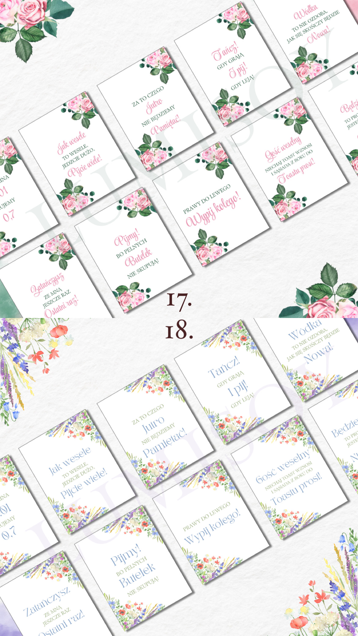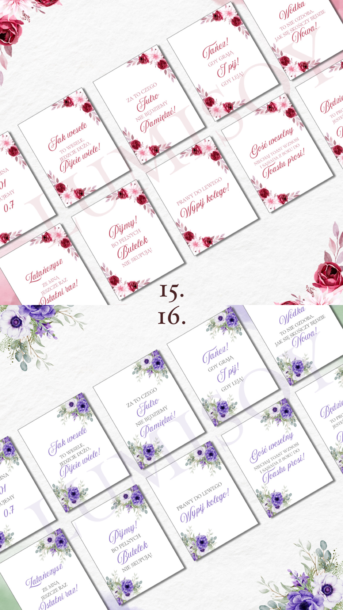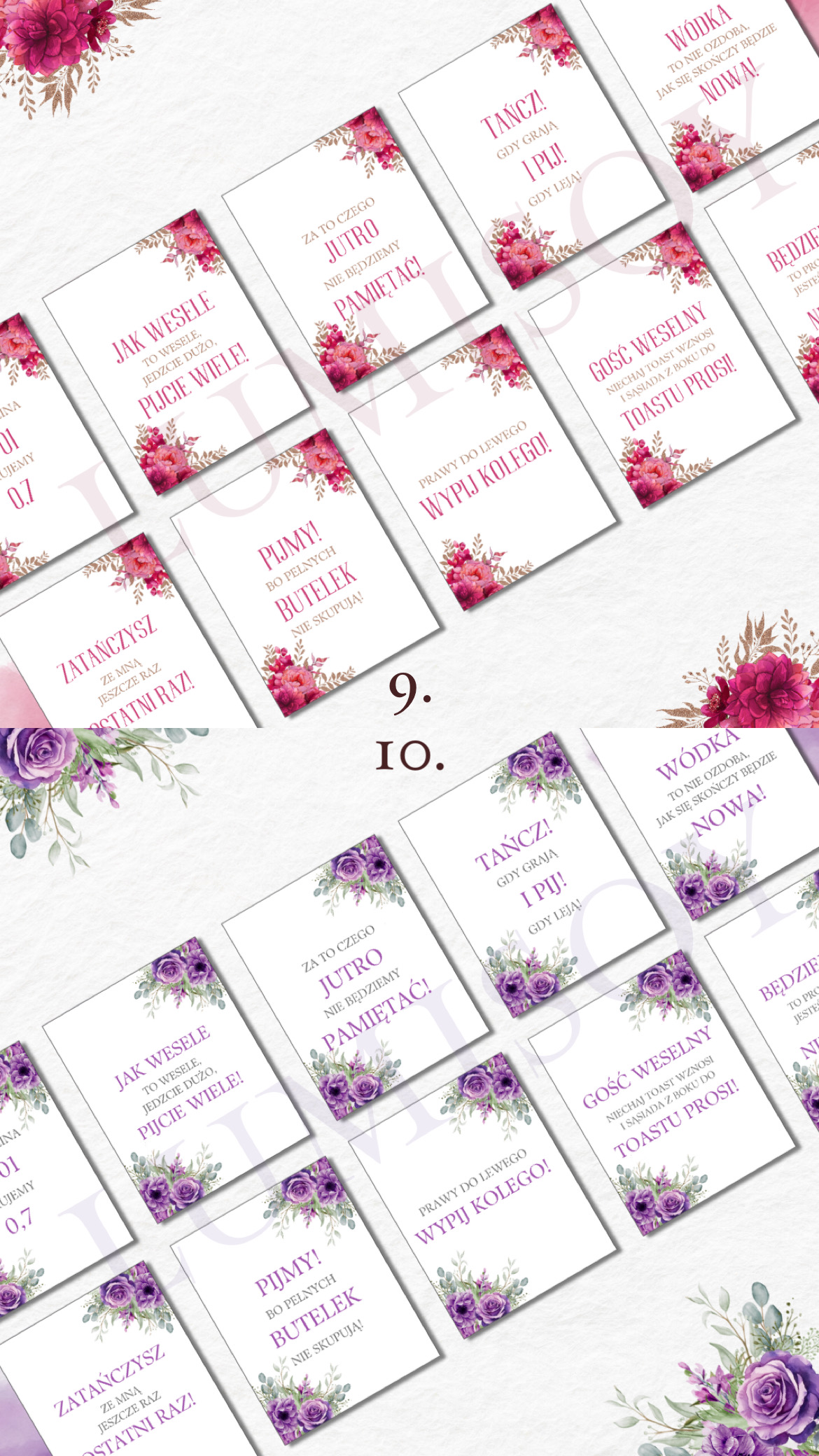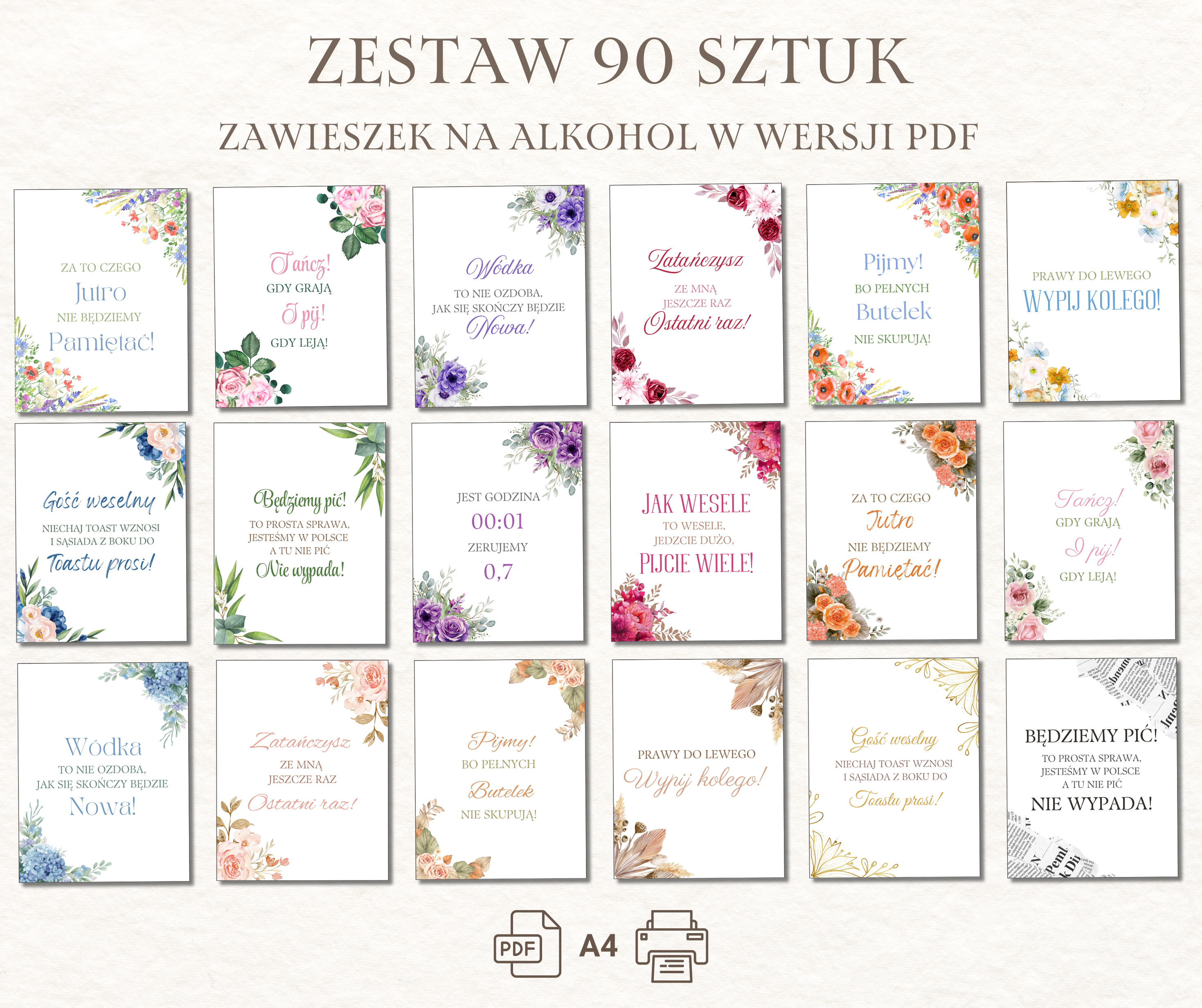 Zawieszki na alkohol – w formacie PDF do wydruku A4 poziomo na 10 stronach (każda strona zawiera 9 szt zawieszek, łącznie 90 szt). Podana cena jest za 1 wersję kolorystyczną 90 sztuk zawieszek z 90 różnymi tekstami podanymi poniżej.